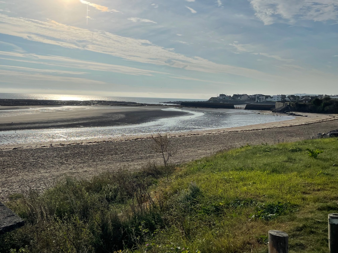 La mer s’est retirée laissant un immense estran à découvert où apparaissent des baïnes résiduelles et tortueuses, scintillantes malgré le manque de soleil. La plage offre une atmosphère paisible. Au loin, la vue se prolonge sur le promontoire rocheux derrière lequel est situé, dans une baie, le village de pêcheurs de Clogherhead.