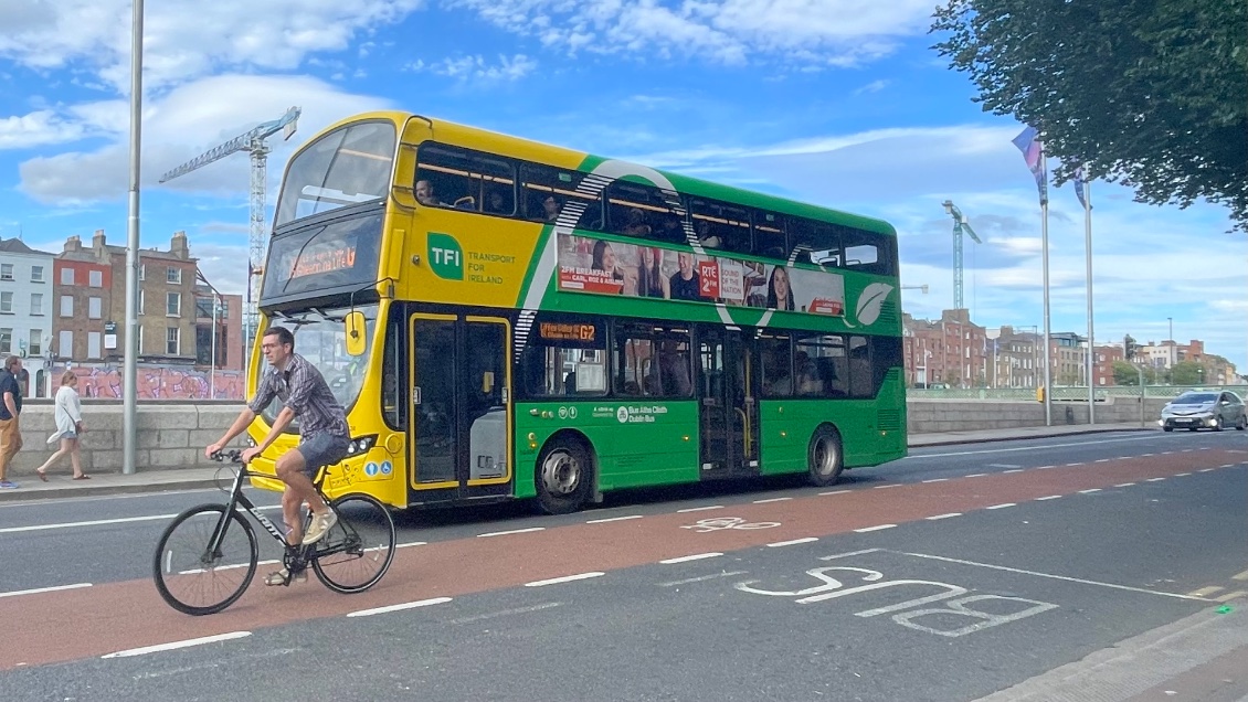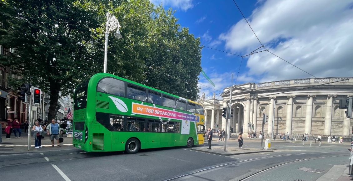 Au point du jour, je suis déjà installée au premier étage du bus 69 en direction du centre de Dublin. Les bus publics à impériale sont à livrée extérieure verte et jaune vif et ce ne sont pas les bus qui manquent, j’en vois partout sur le trajet.