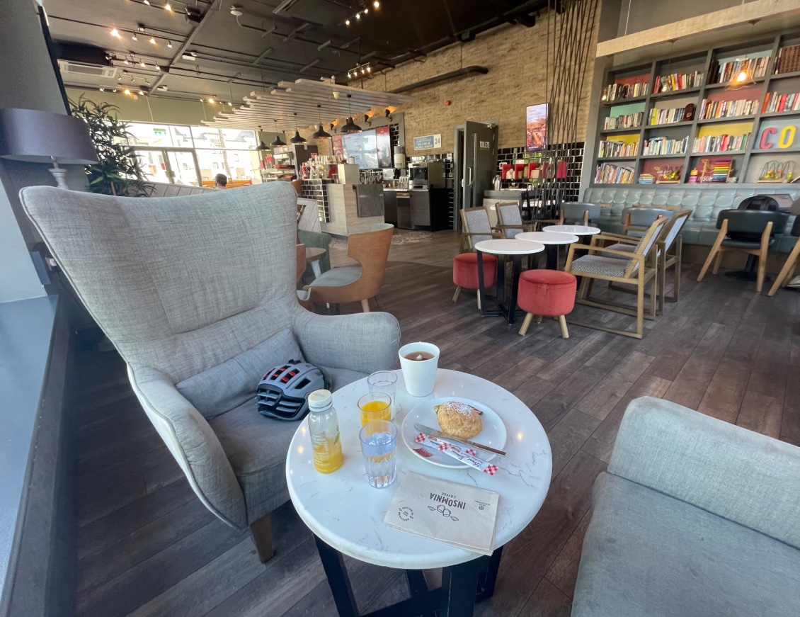 Chaque matin, je romps avec l’étape du jour précédent par une pause dans un lieu si possible agréable. Au village de Saggart, un café bibliothèque a été aménagé avec soin. Un bar occupe la première partie de l’endroit. En prolongement, une bibliothèque, pourvue de nombreux livres et de quelques jeux d’enfants, occupe tout un côté de la pièce. Autour des tables, des fauteuils scandinaves permettent un bon confort. De modernes fauteuils de salon, entourent des tables basses et assurent un moment de repos. Les teintes de l’immobilier ainsi que du sol sont grises. Un gris souris conduisant au gris anthracite. Seuls le rouge coquelicot de deux poufs et les couleurs variées des tranches des différents livres viennent rehausser cette douce harmonie.