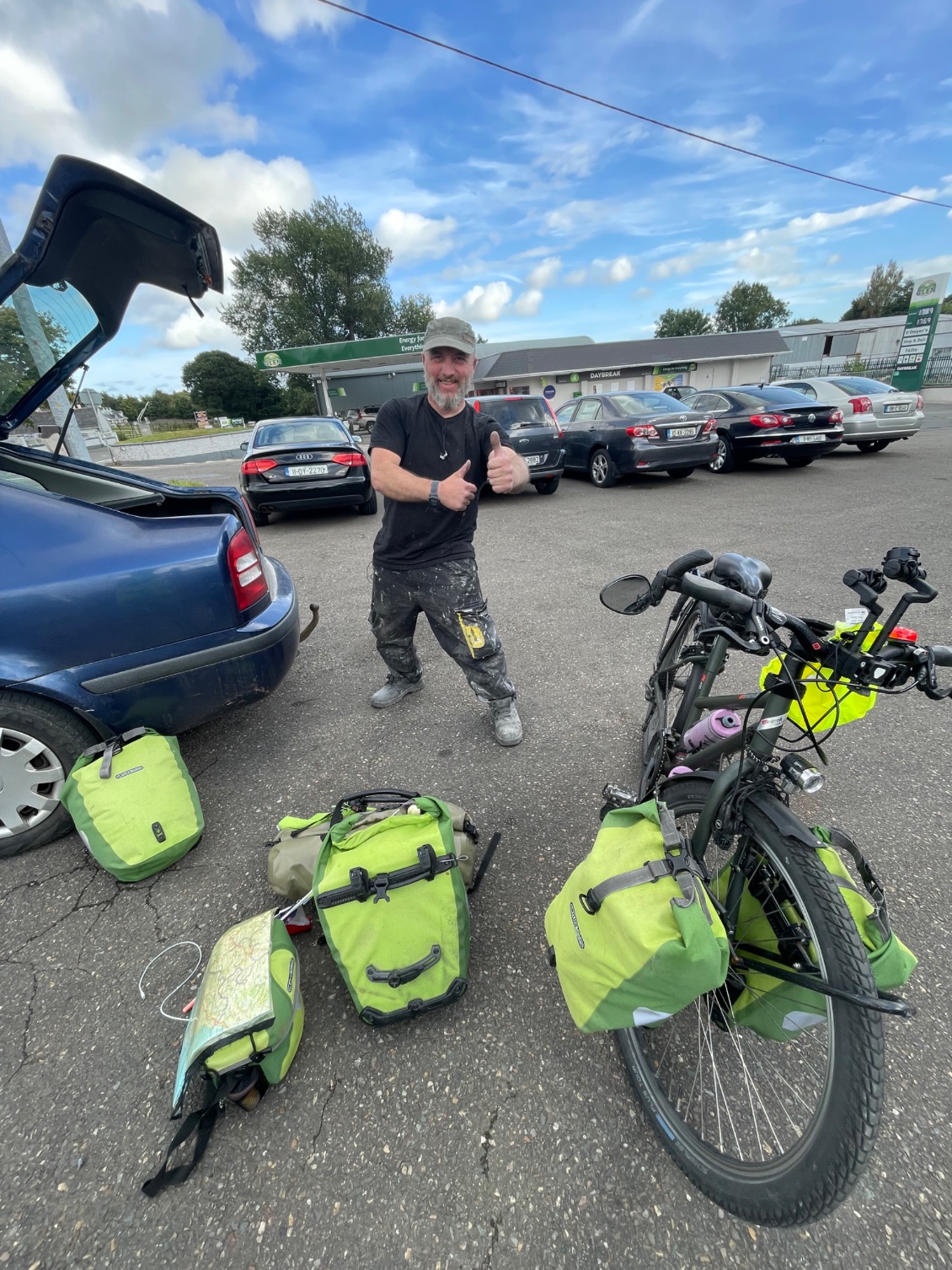 Marc habite à quelques kilomètres. Il rentre du travail. C’est une personne débordante d’énergie. Il s’empare de ma bicyclette sans me laisser le temps de retirer toutes les sacoches, et la dépose dans son coffre. La roue arrière en dépasse. Tambour battant, il démarre et s’élance à toute allure sur la route étroite. Le coffre est resté grand ouvert. J’entends ma bicyclette sursauter à chaque chaos de la chaussée. Je me persuade que nous allons la perdre. Marc aussi, car il s’arrête pour bloquer le coffre et le vélo, avec un tendeur.