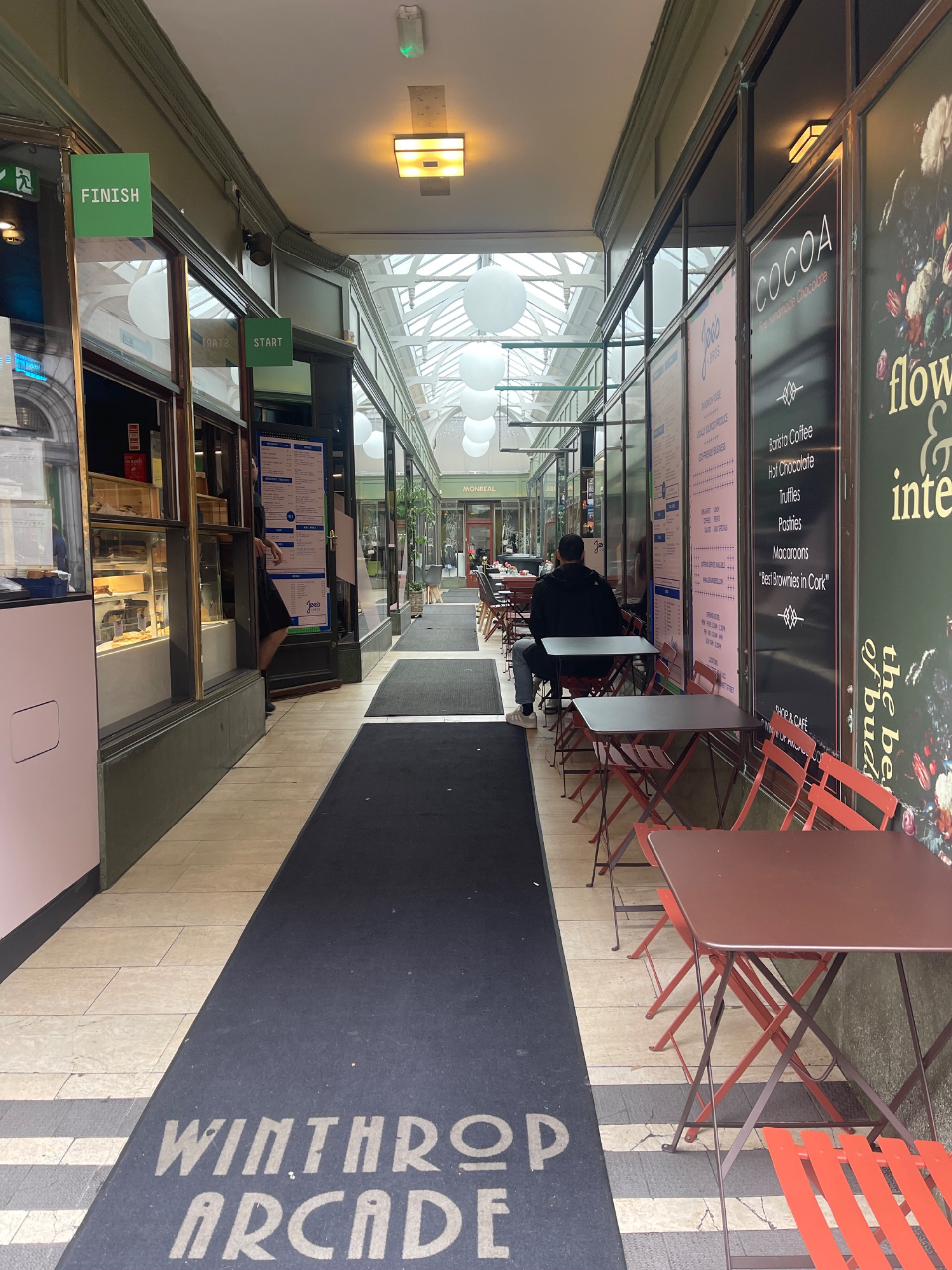 À mon accent, David, le garçon de café, m’identifie aisément. Il est originaire du Gabon et a suivi sa famille lorsque celle-ci s’est installée en Irlande. Il est trilingue : Français, Espagnol et Anglais et possède aussi de sérieuses connaissances en Irlandais. Il prend du temps avec moi et me raconte : « Notre petit café utilise un mélange de laiton, de marbre et de verre pour s’intégrer harmonieusement à la galerie attenante, la Winthrop Arcade, inaugurée en 1926. »