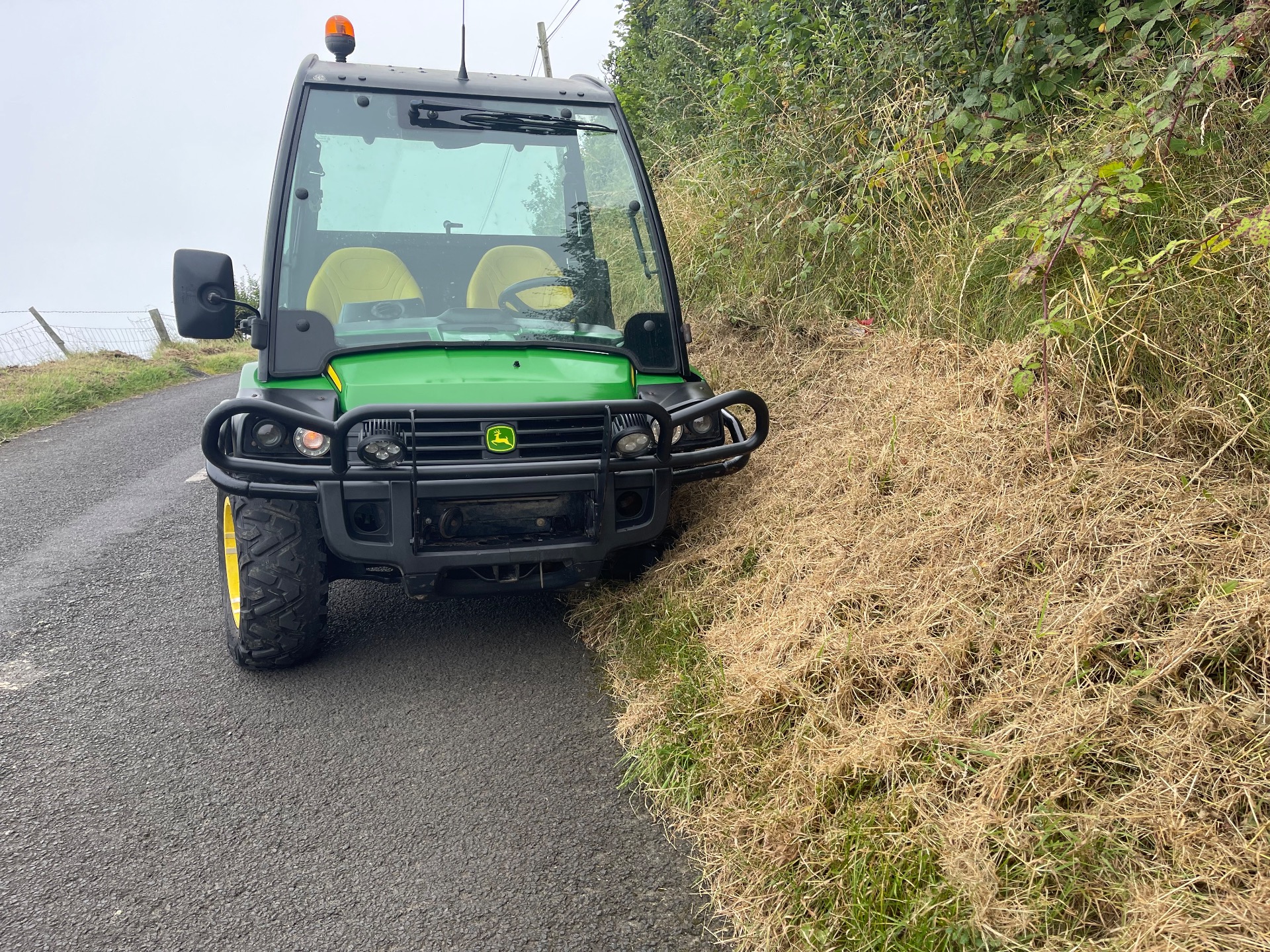 Lorsque j’arrive en haut de la plus haute falaise de ce parcours, je croise un petit tracteur. Je pédale tranquillement sur quelques mètres à faible dénivelé. L’agriculteur me fait signe, moi aussi. Et presque instantanément j’entends un effroyable bruit de ferraille. Je me retourne et voit une roue rebondir sur la route ! À quelques mètres près, j’aurais pu être percutée par cette roue qui finit son exploit telle une damnée en bas de la côte.