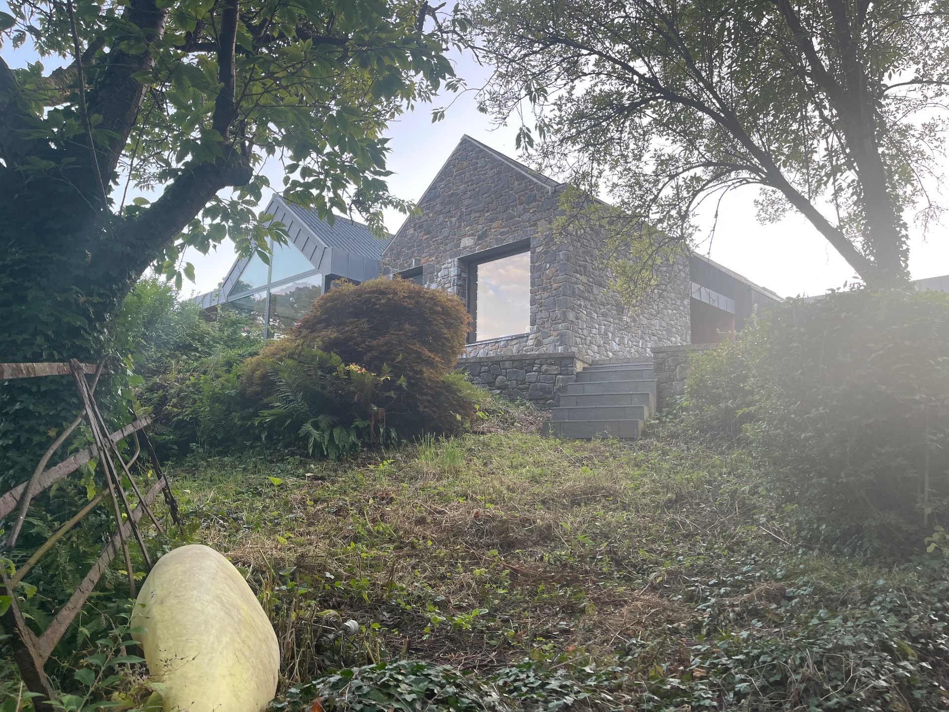Et la maison ! Elle a été construite il y a sept ans. Auparavant c’était le site d’un moulin à lin du XVIIe siècle. Persiste un long hangar utilisé en guise de garage où est entreposé un petit tracteur rouge, rutilant, appartenant autrefois aux parents de Janice. Le mur du hangar est cintré et a gardé sa configuration d’antan. L’ancienne meule verticale, la ribe, qui broyait le lin, a été conservée. Elle est devenue une œuvre dressée verticalement à l’entrée de la propriété.