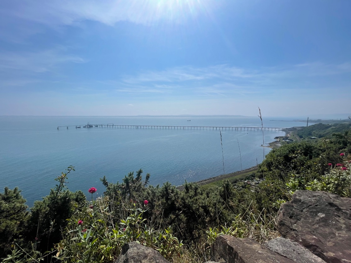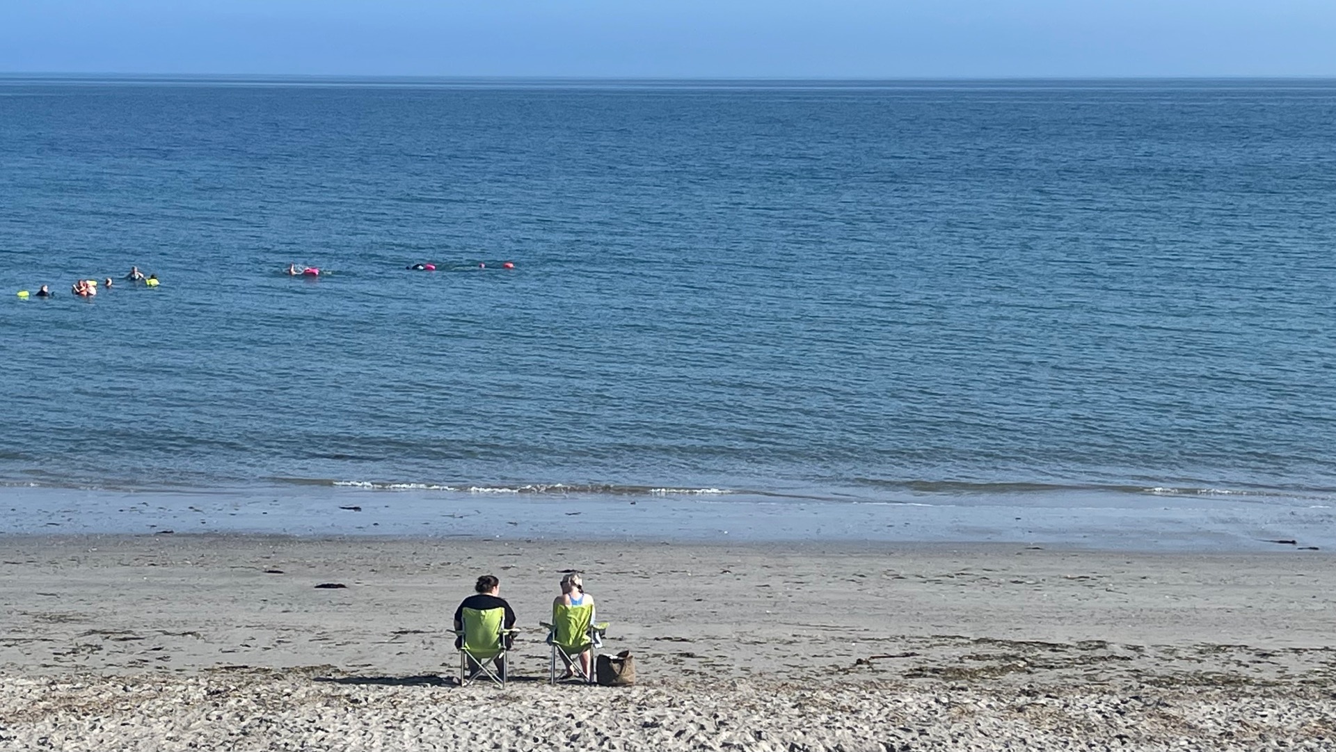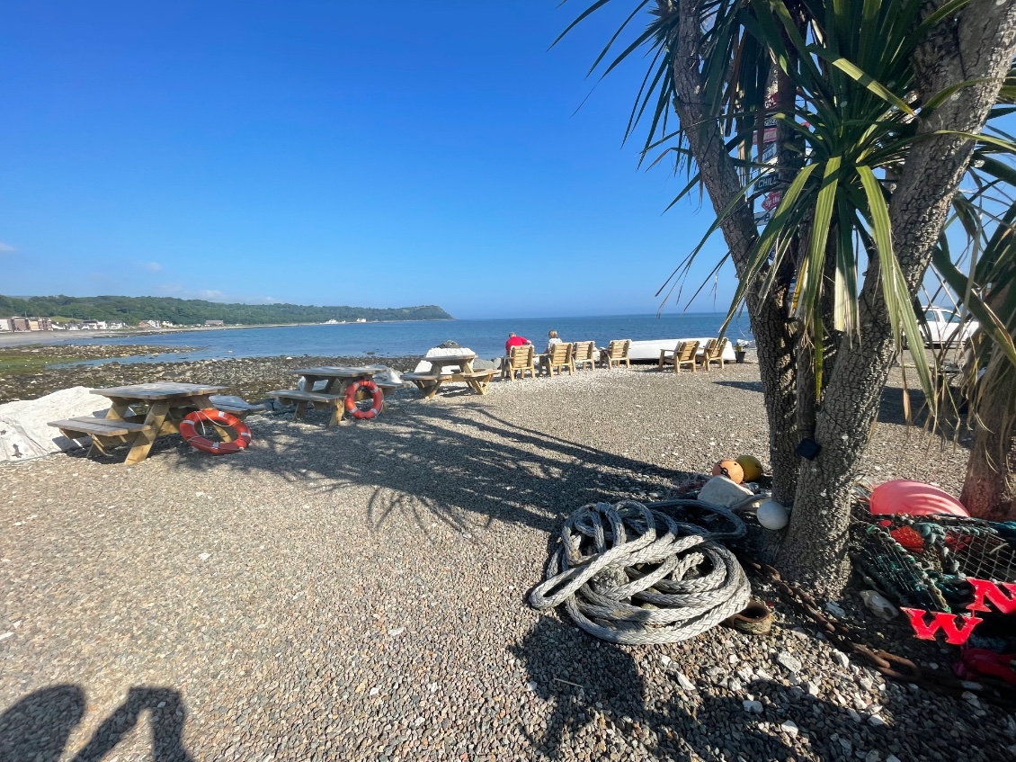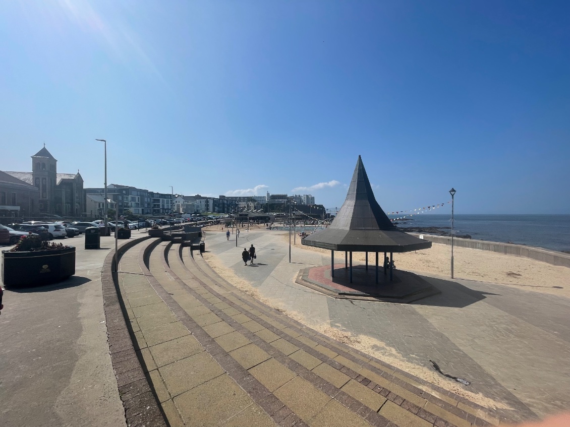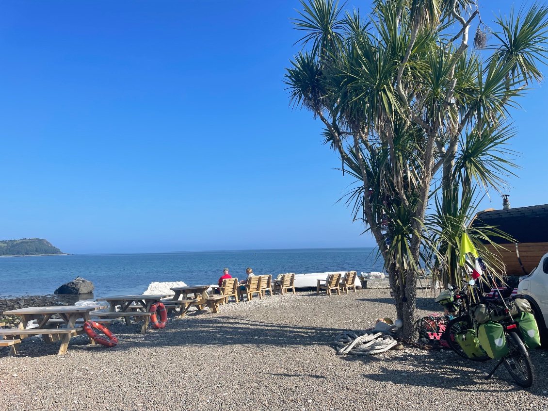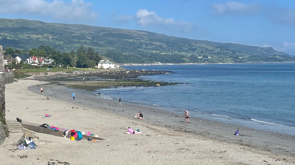 Pas pour longtemps car je m’arrête à Ballygally Beach. Je relève le bleu du ciel semblable à celui de la mer. Deux dames conversent assises sur des sièges vert-anis posés sur le sable blond. Elles sont seules sur l’immense plage. Au loin, dans la mer un cours de natation est donné à des personnes âgées. Là encore, leurs bouées vert-anis se détachent sur le bleu azur de la mer. Un joli espace détente est installé dans cette baie. Une cabane offre des boissons variées et des pâtisseries. Les tables sont en bois rectangulaires aux bancs fixés à celles-ci. Ce sont ces mêmes tables que l’on remarque partout ailleurs, résistantes à la pluie. Cordage, bouées et filets reposent au pied d’un cordyline.