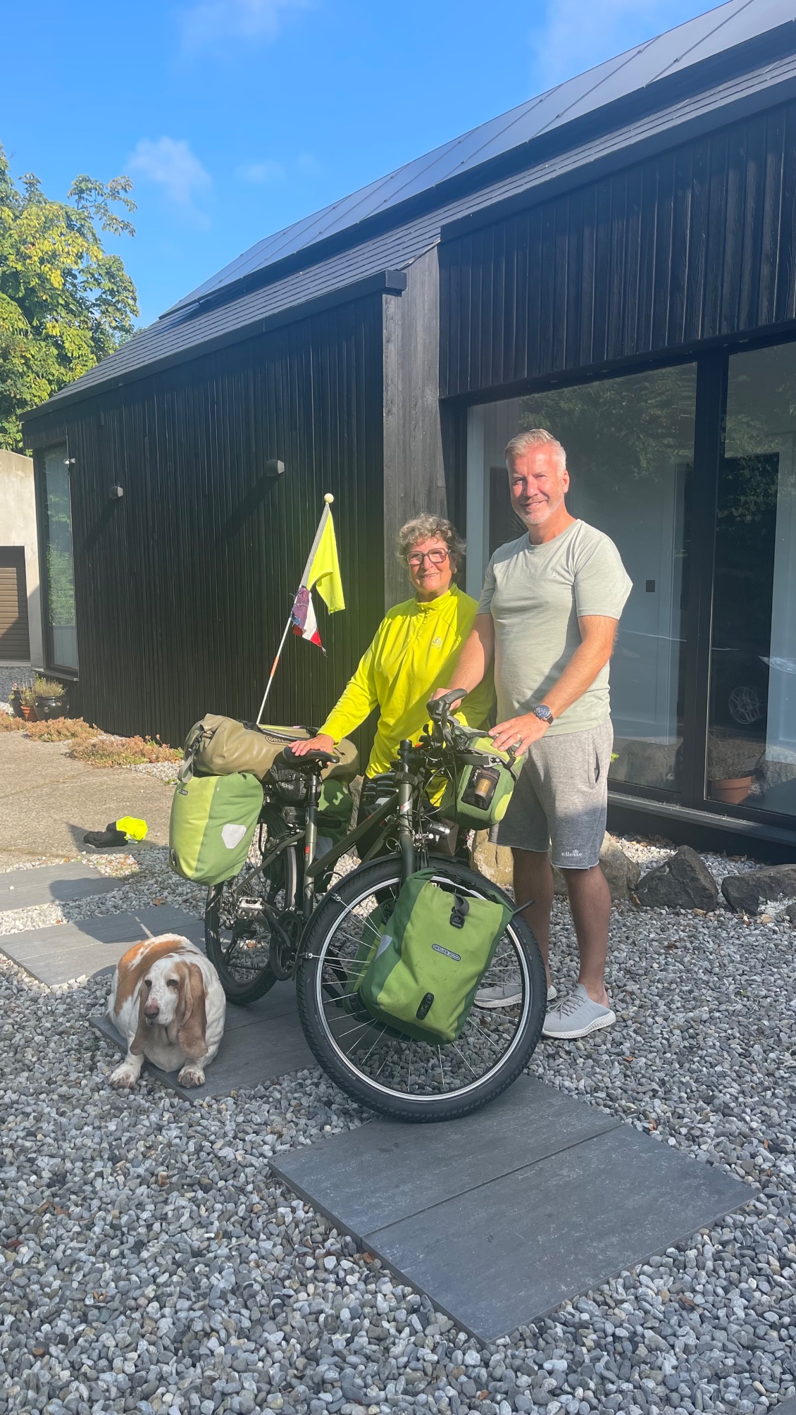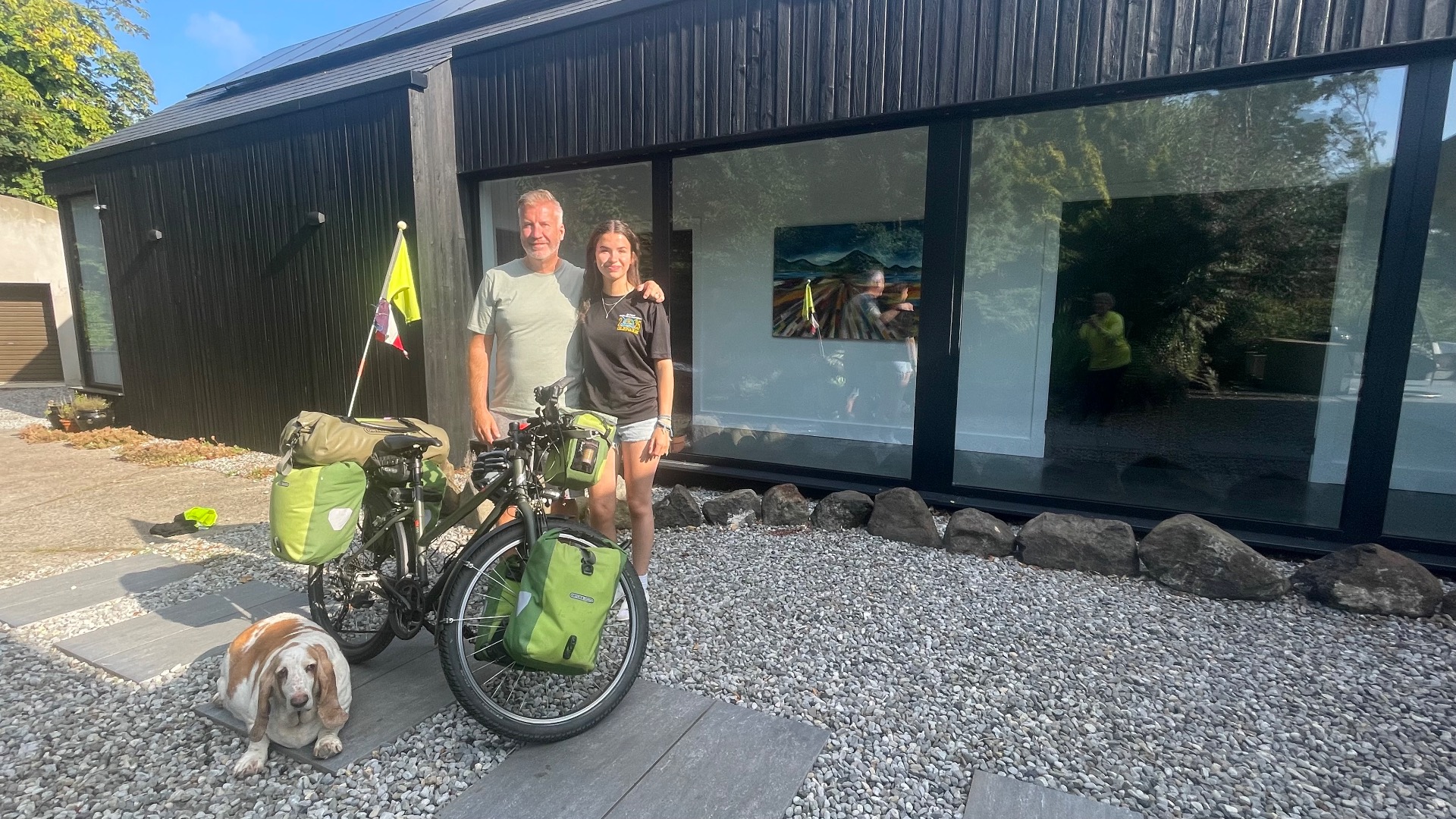 Puis nous posons pour une séance photos avec la reine de la circonstance : la bicyclette. Evie et son père se placent derrière l’élue, puis Rob et moi, sans oublier Daisy qui nous suit partout et s’installe au pied du vélo.