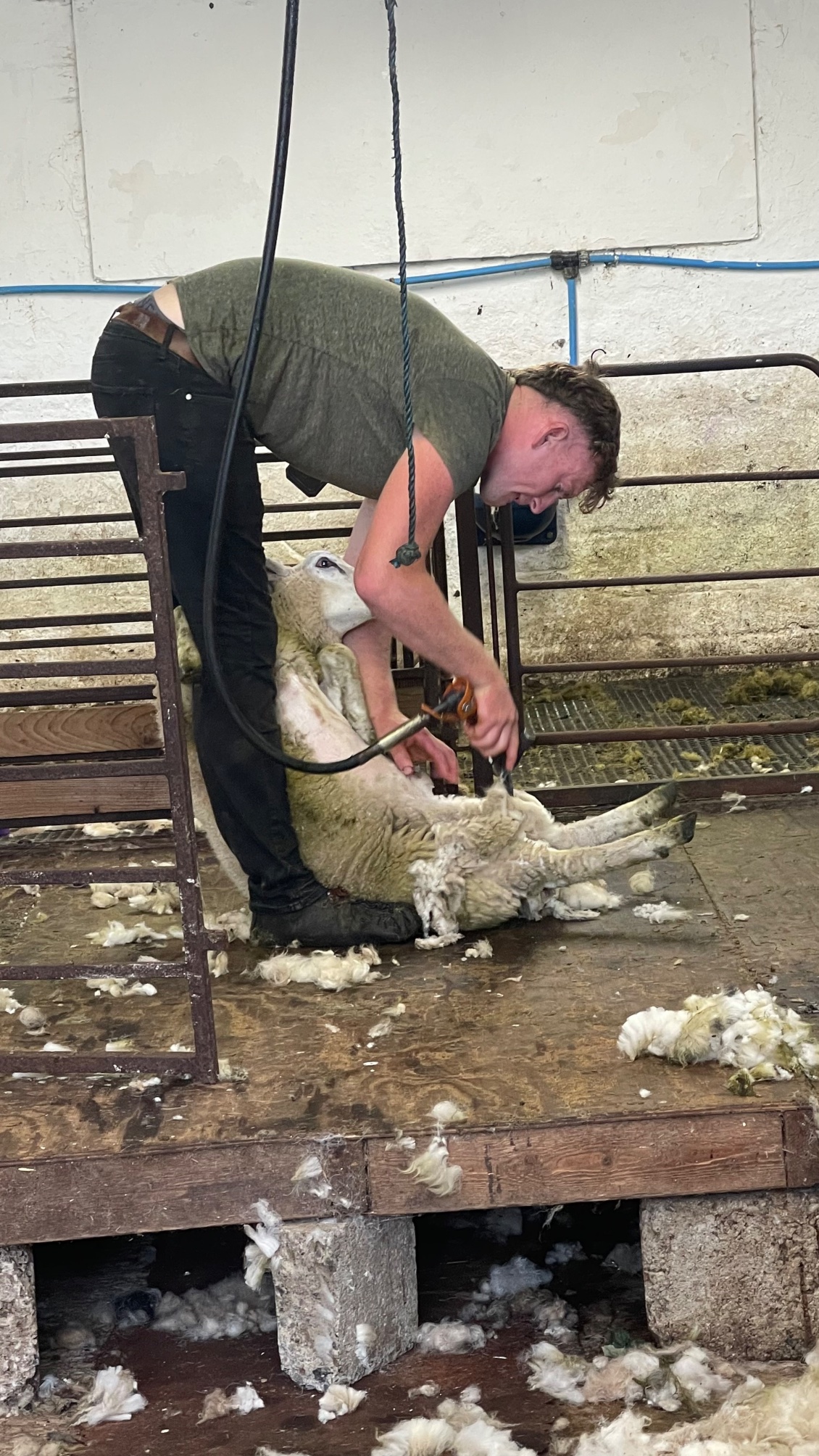 J’admire la dextérité de Cillian au cours de la tonte de plusieurs moutons. Ses gestes sont toujours identiques. Il immobilise l’animal en douceur. Le mouton est assis et calé entre ses jambes. Il suit un ordre de passage précis, en évitant les zones sensibles et travaille à un rythme maîtrisé. Néanmoins lorsqu’il le relâche, celui-ci file à toute allure, n’en demandant pas plus.