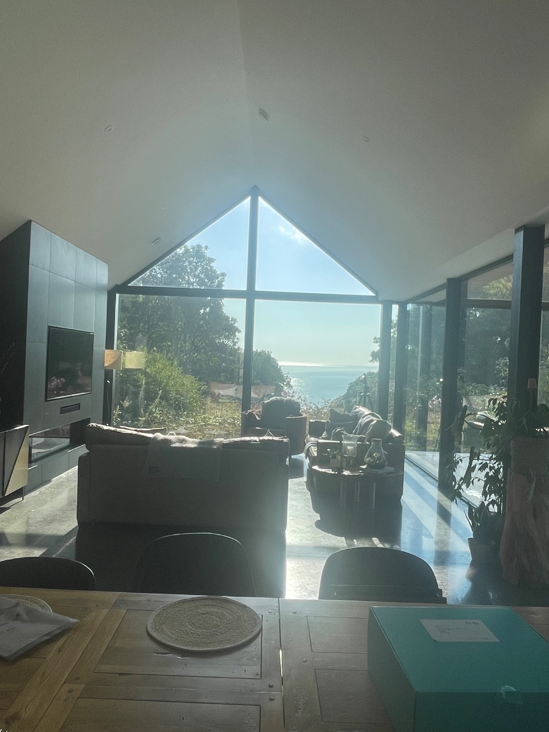 Deux corps de bâtiment très longs sont reliés. Une maison impressionnante ! Rob me fait contourner le bâtiment revêtu de mélèze brûlé et de pierre pour arriver sur une immense terrasse côté salon et cuisine. Les façades, sur lesquelles donnent un immense espace de vie sont vitrées.