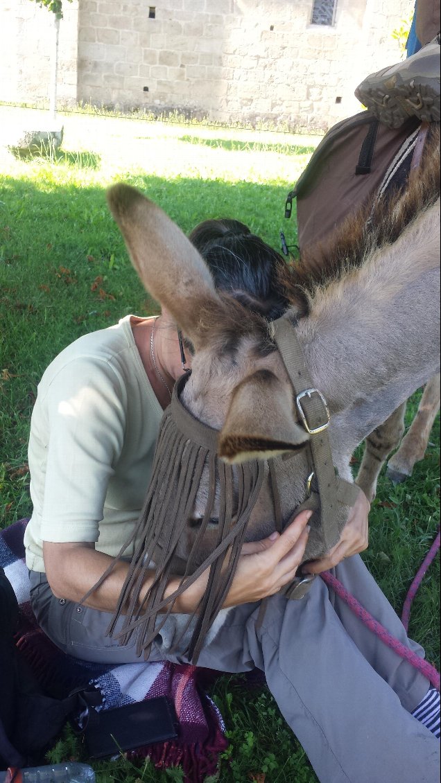 Après une heure de mésaventures dont je vous passe les détails (une ânesse de chaque côté, un chemin trop étroit pour les bâts, un passage par un champ, un débâtage...), nous étudions une déviation en utilisant le GPS de nos téléphones portables.Notre option consiste à regagner la route en lacets qui redescend sur Spontour...