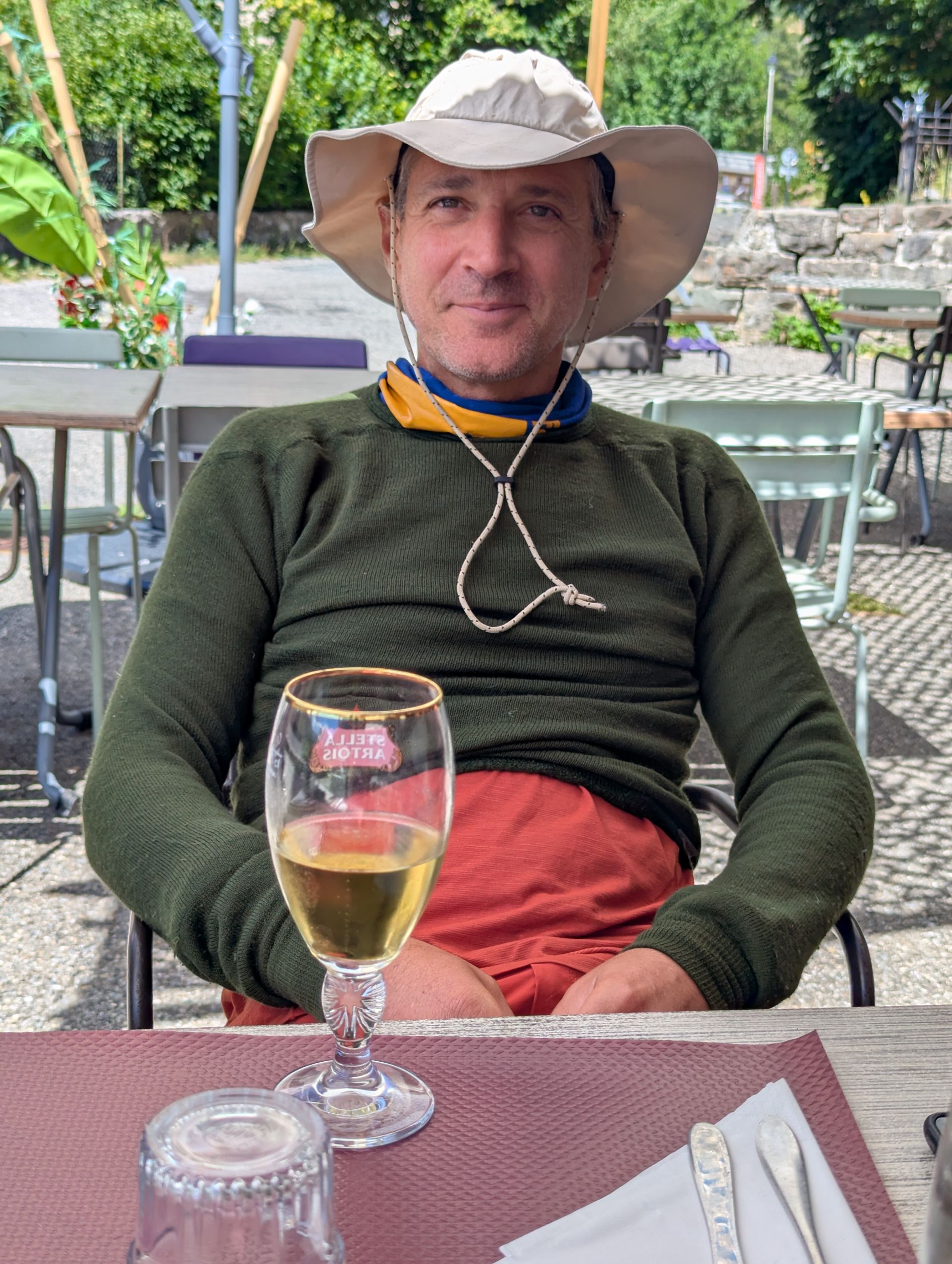 À l'heure dite, nous revoici en terrasse, cette fois pour un déjeuner de produits locaux. Mi-ombre mi-soleil, la température et le cadre sont idéals pour apprécier nos plats.