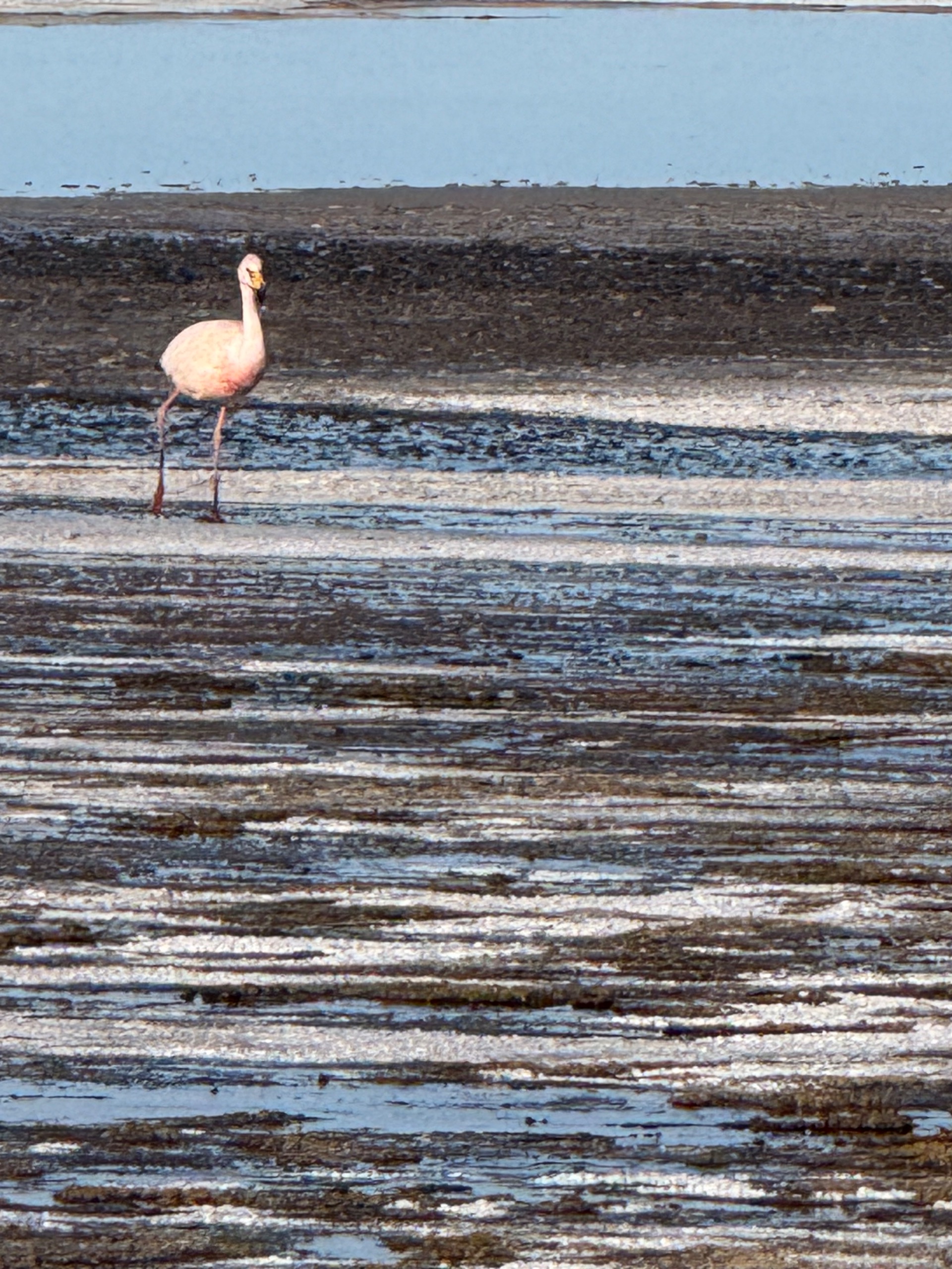 Après avoir quitté l’immensité blanche du Salar de Uyuni, j’ai enfin eu droit à une belle surprise : les premiers flamants roses, élégants, posés sur ces lagunes au milieu du désert de sel, un vrai contraste magique. 🌸🦩