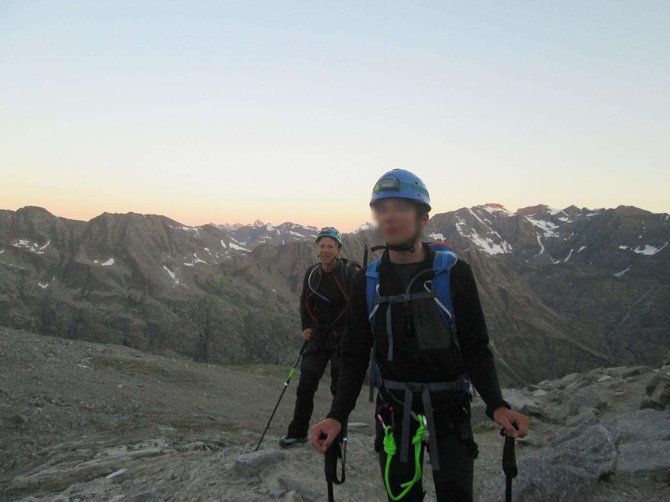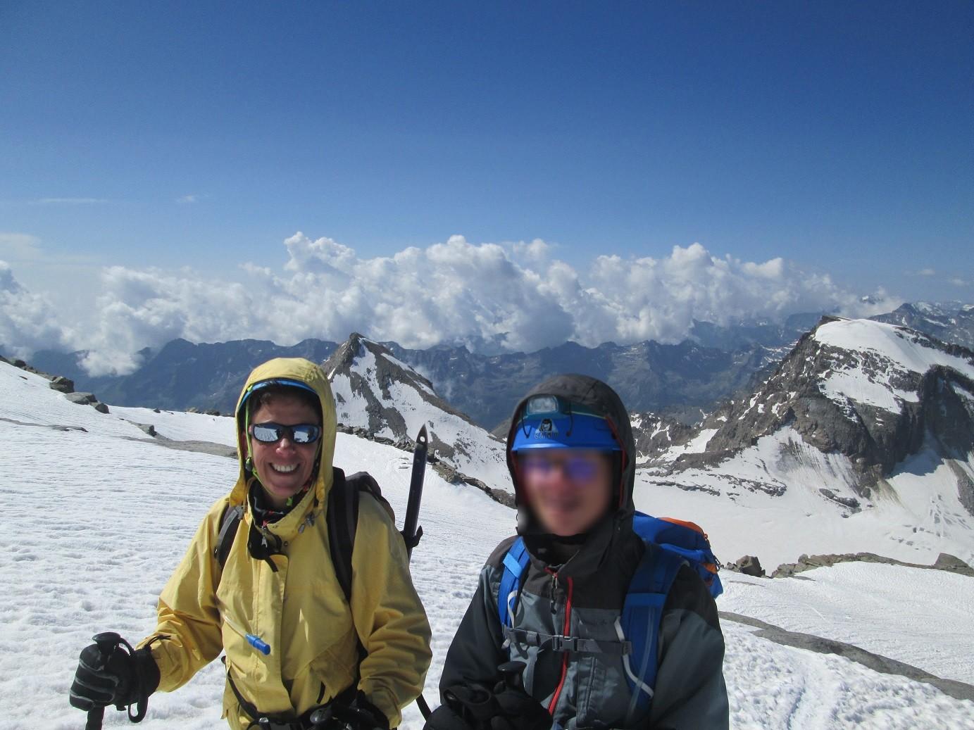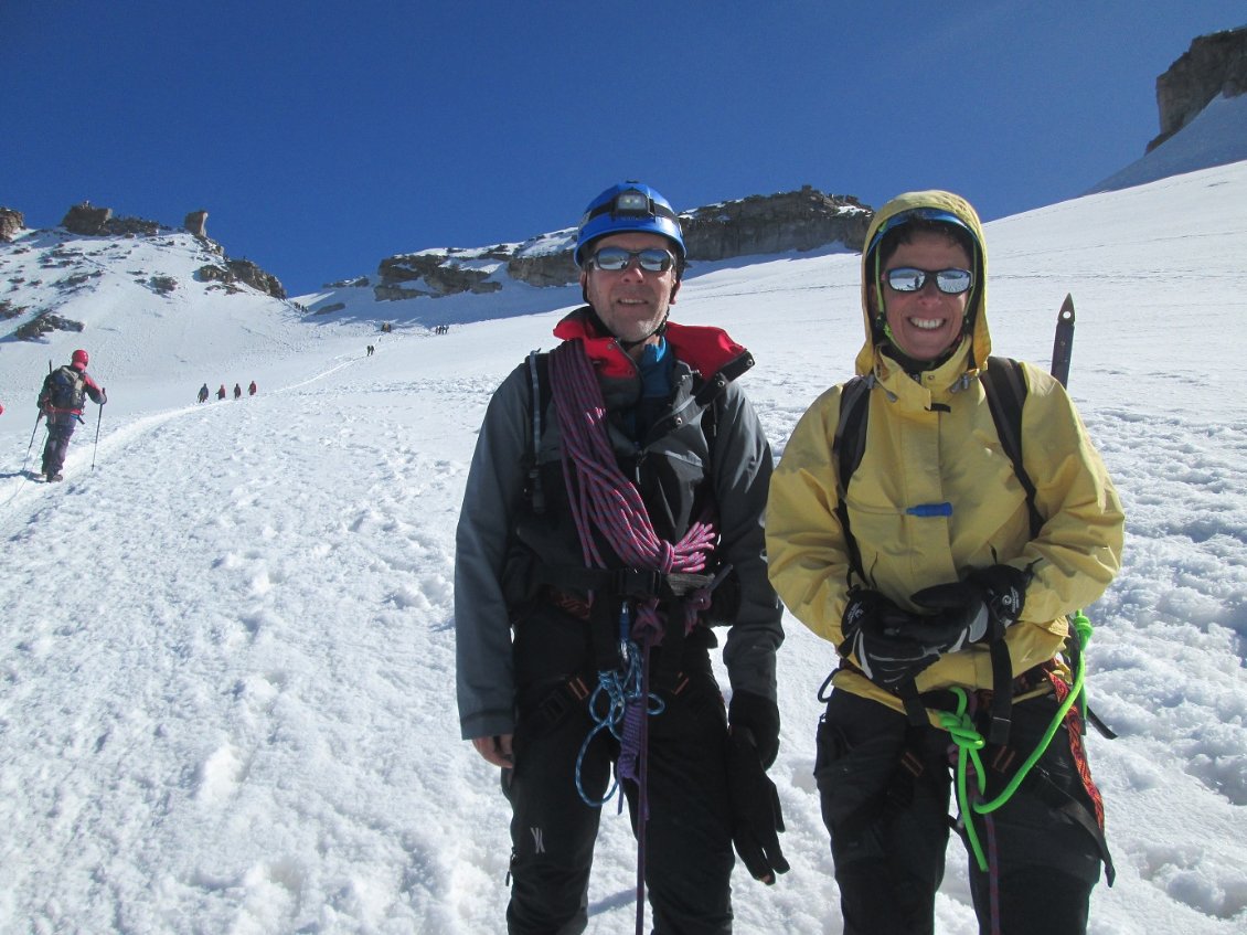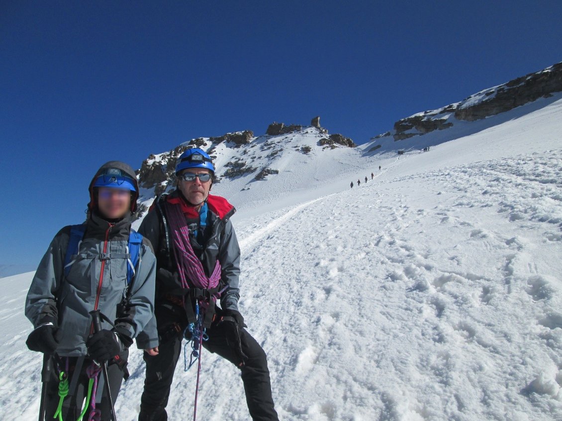 Levé à 3h30, petit déjeuner à 4h et départ à 4h30 à la frontale dans les pierriers. Les premiers névés apparaissent à moins de 3000 m et facilitent l'ascension. Le regel est bon et le restera longtemps. la trace est facile à suivre même s'il faut rester vigilant car l'itinéraire est long. Beaucoup de cordées, mais suffisamment espacées pour ne pas se marcher dessus. Nous perdons rapidement de vue nos compagnons de table la veille ... nous ne les reverrons pas. La dernière pente permet d'atteindre un col avant d'attaquer la partie rocheuse et les premiers rayons de soleil sont un bonheur car il fait froid. Nous laissons nos bâtons de rando que nous récupèrerons à la descente, mais gardons les piolets pour progresser sur la vire neigeuse plus ou moins verglacée. L'accès au rocher sommitale demande de la patience car pas mal de monde. On attend - dans le froid versant nord - que les cordées montent les barreaux scellés. On ne reste que quelques minutes au sommet (4061 m), puis entamons la descente le long d'une vire étroite, mais équipée de goujons et queues de cochons pour l'assurage. Longue descente vers le refuge pour fêter dignement cette première pour le fiston et le troisième 4000 pour Flo. Quant à moi, j'ai pris ma revanche sur 2011. 1330 m de dénivelé A/R et 9,8 km en 8h50. Une belle bambée et un bonheur qui se lit sur les visages.