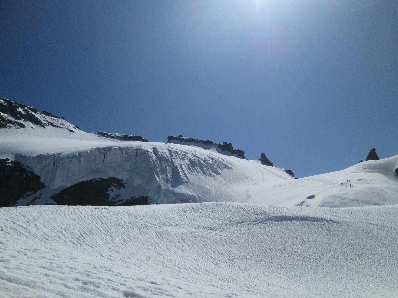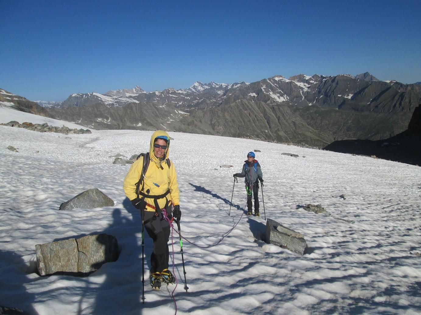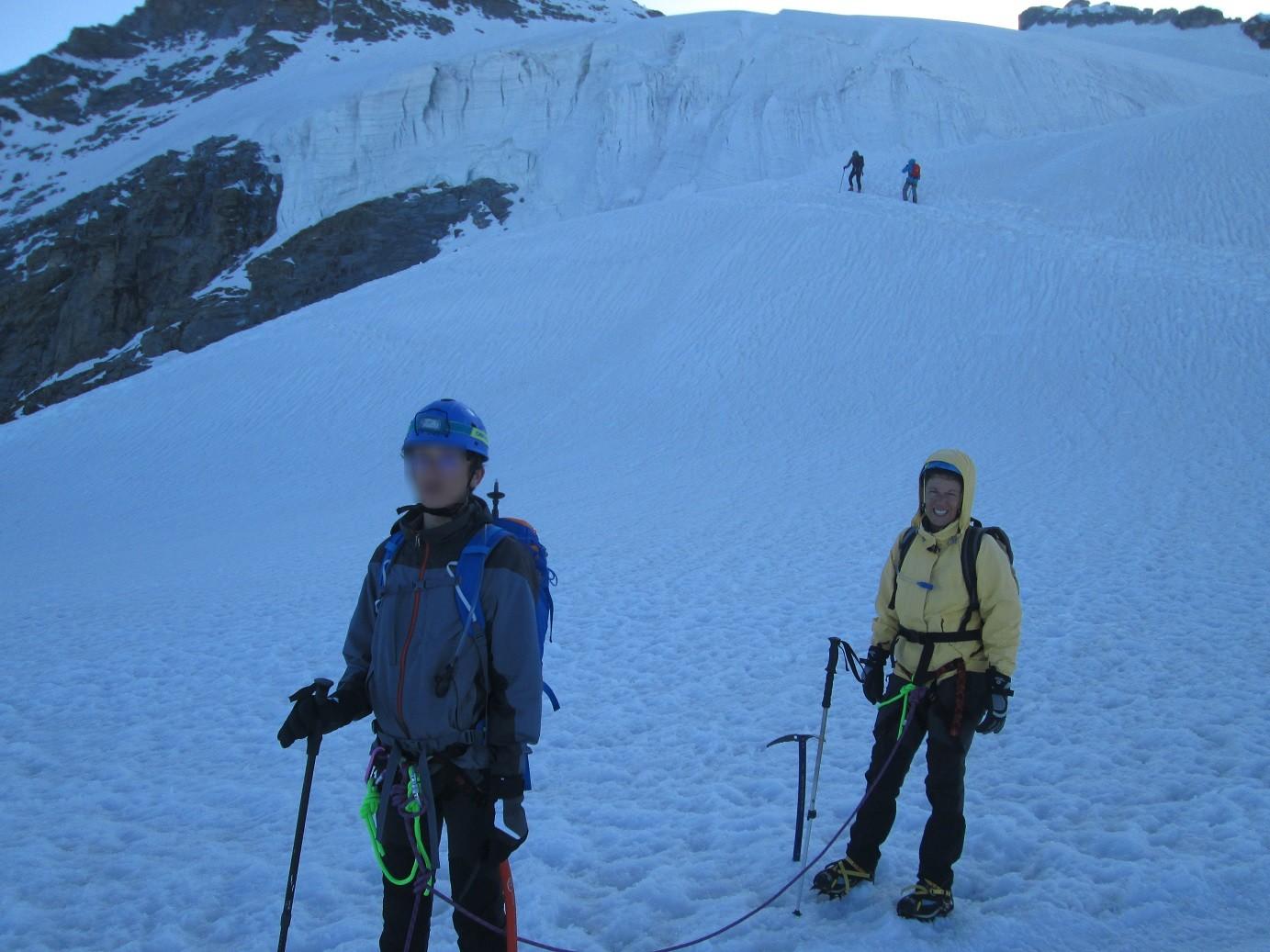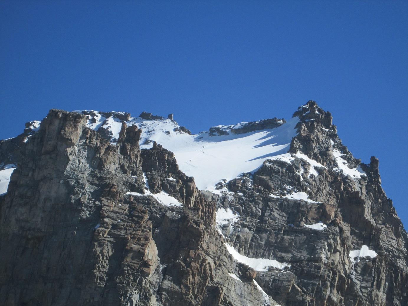 Levé à 3h30, petit déjeuner à 4h et départ à 4h30 à la frontale dans les pierriers. Les premiers névés apparaissent à moins de 3000 m et facilitent l'ascension. Le regel est bon et le restera longtemps. la trace est facile à suivre même s'il faut rester vigilant car l'itinéraire est long. Beaucoup de cordées, mais suffisamment espacées pour ne pas se marcher dessus. Nous perdons rapidement de vue nos compagnons de table la veille ... nous ne les reverrons pas. La dernière pente permet d'atteindre un col avant d'attaquer la partie rocheuse et les premiers rayons de soleil sont un bonheur car il fait froid. Nous laissons nos bâtons de rando que nous récupèrerons à la descente, mais gardons les piolets pour progresser sur la vire neigeuse plus ou moins verglacée. L'accès au rocher sommitale demande de la patience car pas mal de monde. On attend - dans le froid versant nord - que les cordées montent les barreaux scellés. On ne reste que quelques minutes au sommet (4061 m), puis entamons la descente le long d'une vire étroite, mais équipée de goujons et queues de cochons pour l'assurage. Longue descente vers le refuge pour fêter dignement cette première pour le fiston et le troisième 4000 pour Flo. Quant à moi, j'ai pris ma revanche sur 2011. 1330 m de dénivelé A/R et 9,8 km en 8h50. Une belle bambée et un bonheur qui se lit sur les visages.