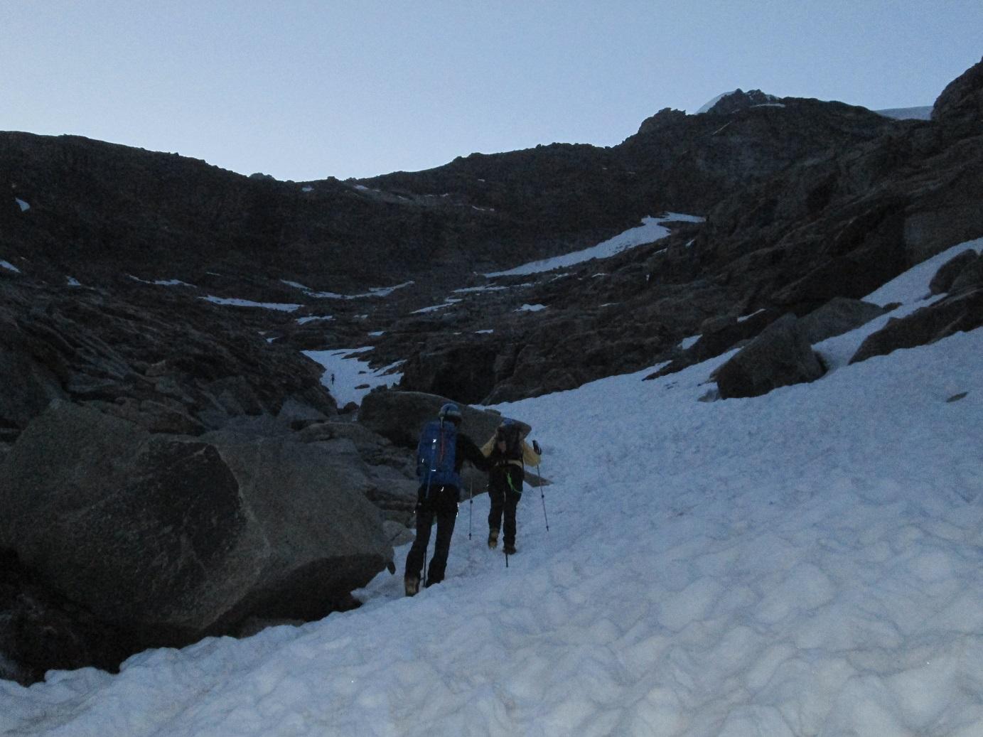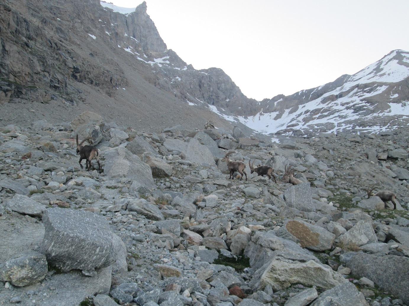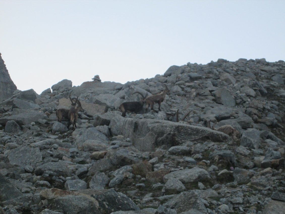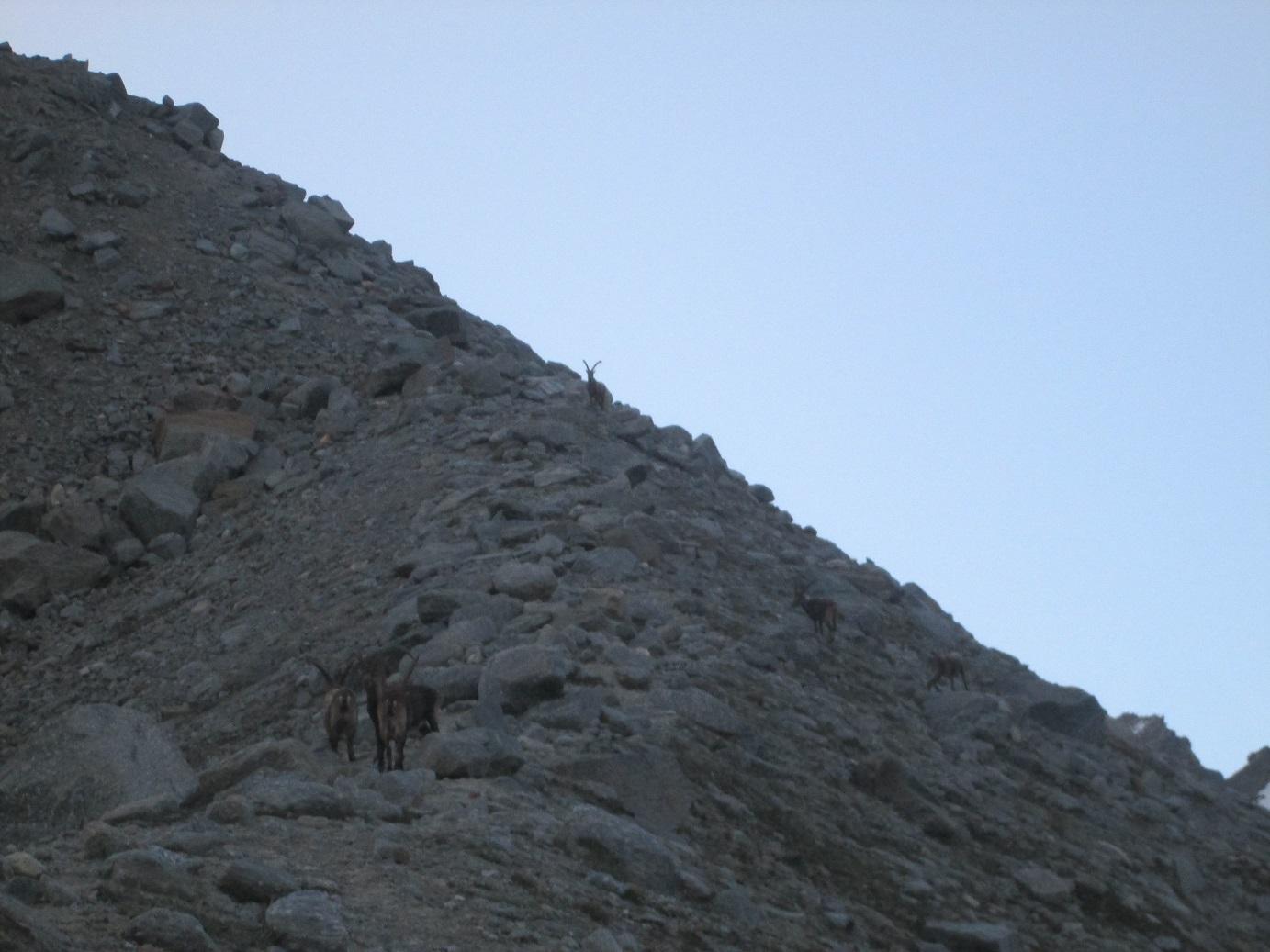 Levé à 4h30, départ à 5h15 pour la Tresenta. Nous croisons plusieurs bouquetins en remontant la moraine, puis nous atteignons les névés à partir desquels nous chaussons les crampons et nous encordons. L'enneigement n'est pas continu si l'on suit la voie normale. Aussi, nous tentons de suivre au maximum les langues neigeuses, mais les pentes deviennent de plus en plus raide (45°) et la neige est béton. Nous décidons de rejoindre les pierriers et déchaussons les crampons pour terminer à pied, mais la Tresenta n'est qu'un tas de cailloux immonde lorsqu'elle n'est plus enneigée. Nous décidons de nous arrêter 100 m sous le sommet car les conditions devenaient exécrables (blocs croulants) et nous voulons garder la forme pour le Grand Paradis. Afin de ne pas rechausser les crampons, nous descendons dans les blocs jusqu'à rejoindre les névés non sans avoir sorti la corde dans les passages raides et croulants. Bilan : 800 m de dénivelé et 7 km A/R en 7h.