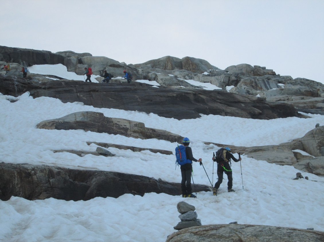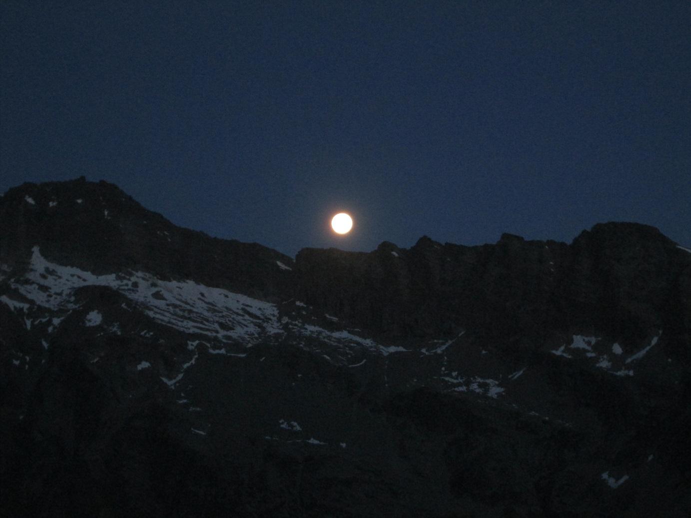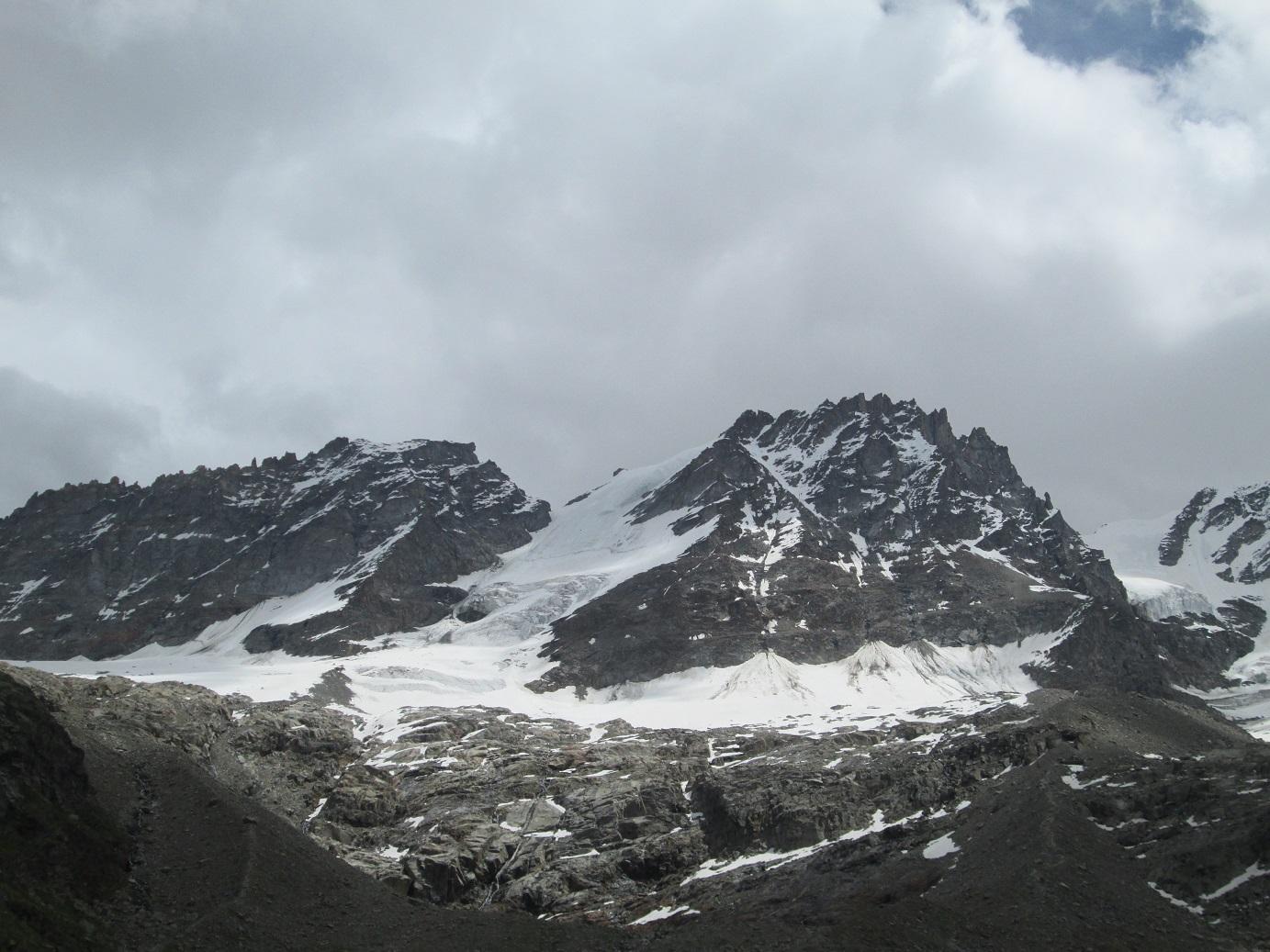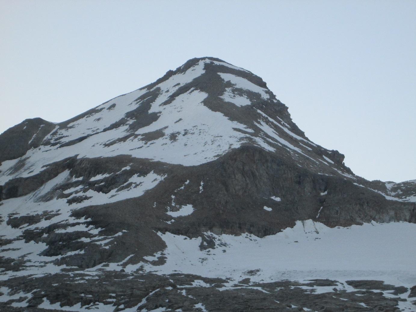 Levé à 4h30, départ à 5h15 pour la Tresenta. Nous croisons plusieurs bouquetins en remontant la moraine, puis nous atteignons les névés à partir desquels nous chaussons les crampons et nous encordons. L'enneigement n'est pas continu si l'on suit la voie normale. Aussi, nous tentons de suivre au maximum les langues neigeuses, mais les pentes deviennent de plus en plus raide (45°) et la neige est béton. Nous décidons de rejoindre les pierriers et déchaussons les crampons pour terminer à pied, mais la Tresenta n'est qu'un tas de cailloux immonde lorsqu'elle n'est plus enneigée. Nous décidons de nous arrêter 100 m sous le sommet car les conditions devenaient exécrables (blocs croulants) et nous voulons garder la forme pour le Grand Paradis. Afin de ne pas rechausser les crampons, nous descendons dans les blocs jusqu'à rejoindre les névés non sans avoir sorti la corde dans les passages raides et croulants. Bilan : 800 m de dénivelé et 7 km A/R en 7h.