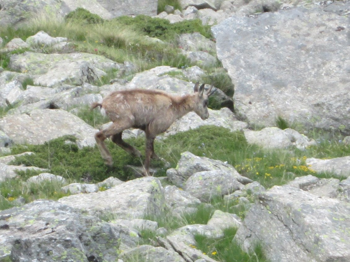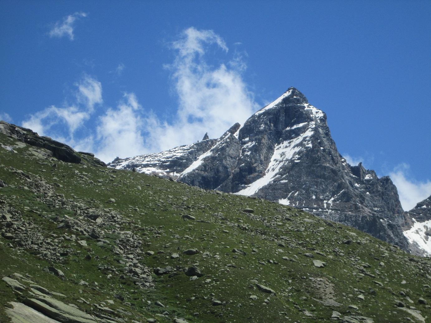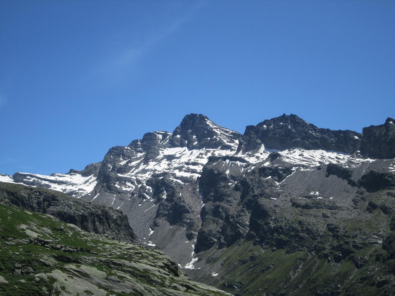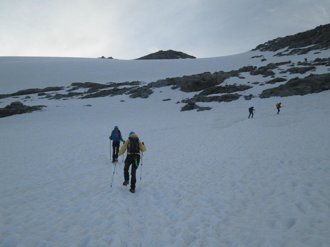 Levé à 4h30, départ à 5h15 pour la Tresenta. Nous croisons plusieurs bouquetins en remontant la moraine, puis nous atteignons les névés à partir desquels nous chaussons les crampons et nous encordons. L'enneigement n'est pas continu si l'on suit la voie normale. Aussi, nous tentons de suivre au maximum les langues neigeuses, mais les pentes deviennent de plus en plus raide (45°) et la neige est béton. Nous décidons de rejoindre les pierriers et déchaussons les crampons pour terminer à pied, mais la Tresenta n'est qu'un tas de cailloux immonde lorsqu'elle n'est plus enneigée. Nous décidons de nous arrêter 100 m sous le sommet car les conditions devenaient exécrables (blocs croulants) et nous voulons garder la forme pour le Grand Paradis. Afin de ne pas rechausser les crampons, nous descendons dans les blocs jusqu'à rejoindre les névés non sans avoir sorti la corde dans les passages raides et croulants. Bilan : 800 m de dénivelé et 7 km A/R en 7h.