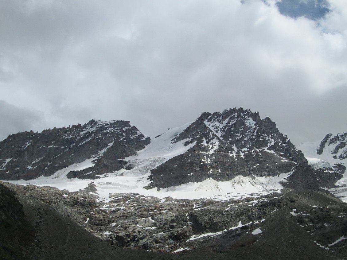 Après avoir consulté le gardien au retour de la Tresenta, nous décidons de décaler la grande course au jeudi. En effet, beaucoup de cordées vont tenter l'ascension ce mercredi et le plafond nuageux sera bas avec du vent. Nous partons donc pour une rando sur le sentier reliant les deux refuges : Chabod et Vittorio Emanuele II en A/R. La météo fut conforme aux prévisions : nuages sur les sommets, vent et quelques gouttes ... Une jolie ballade de 560 m de dénivelé et 11,2 km en 5h.