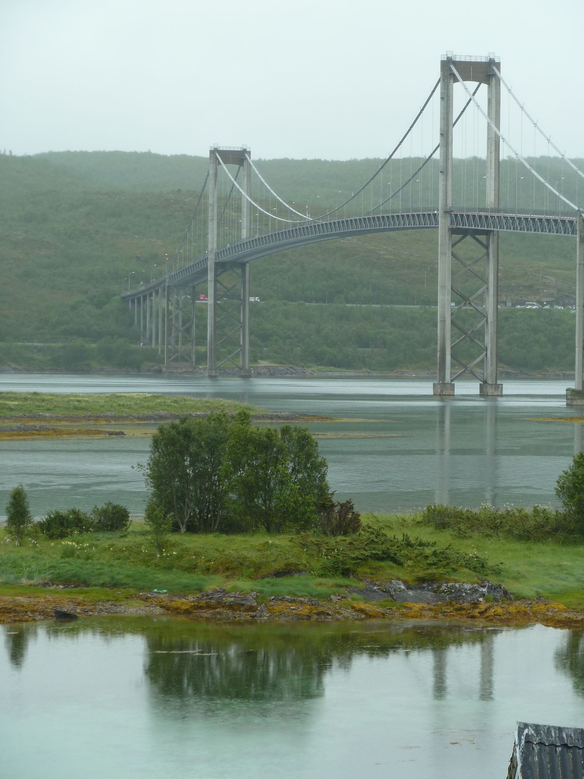 On s'arrête sur la route pour observer le courant de Saltstraumen, qui apparait lorsque la marée remplit ou vide un fjord par une étroite embouchure. Pas trop impressionnant ce jour là, mais on imagine ce que cela peut donner lors des forts coefficients !