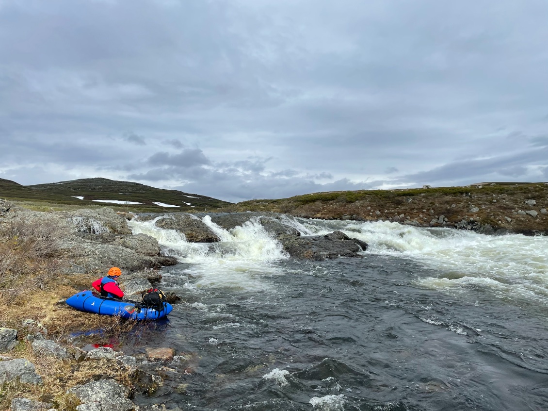 Nous décidons de bifurquer directement vers la rivière et d’embarquer. Le vent est fort, nous devons être vigilants et lester nos packrafts pendant la préparation. Si un packraft part sur la rivière avec ce vent, il sera très difficile de le récupérer. Heureusement, ce vent violent sera dans notre dos. Le début de la rivière est très large avec des déversoirs parfois importants, comme ce premier gros rapide de classe IV que je décide de porter.
