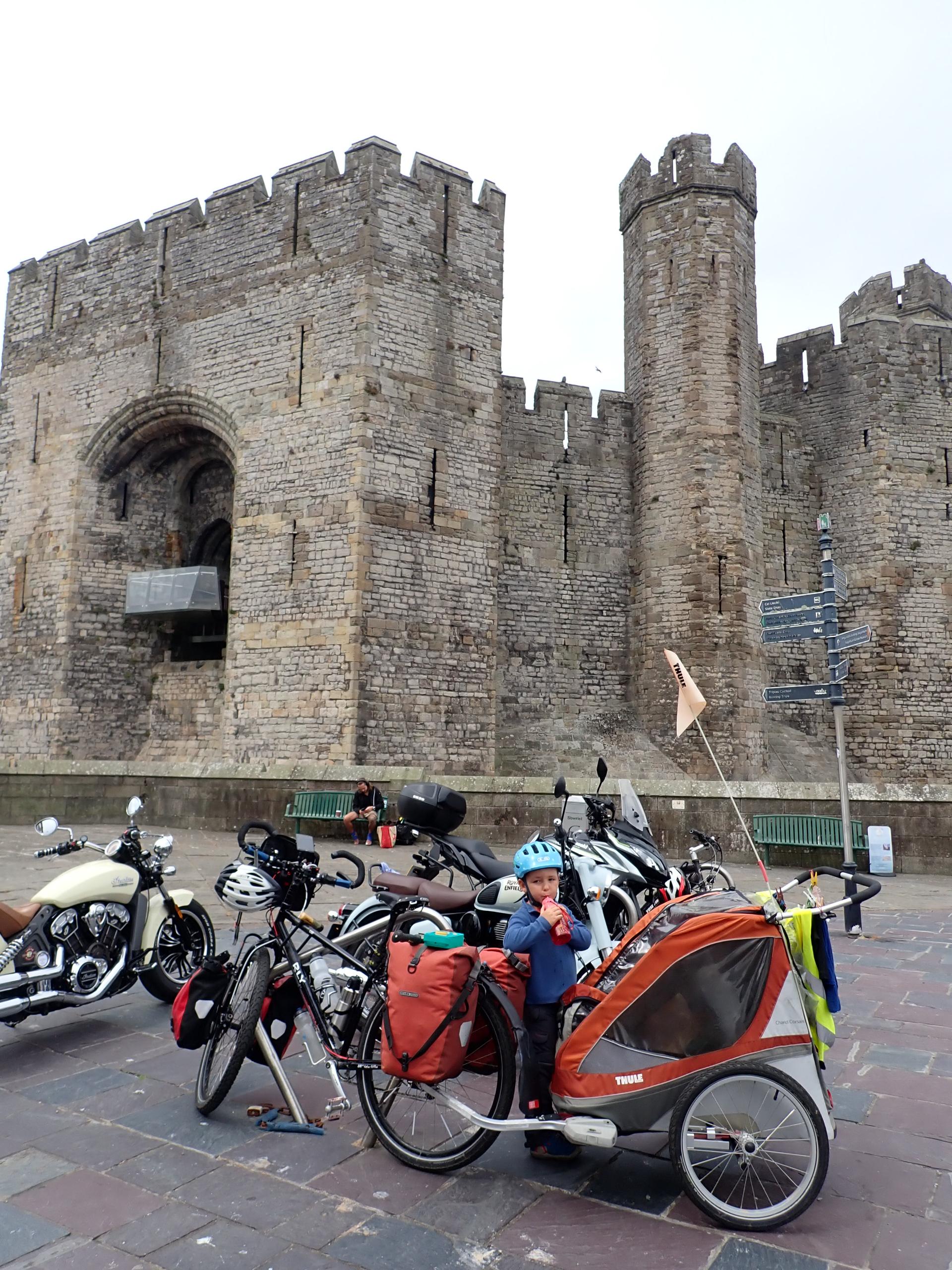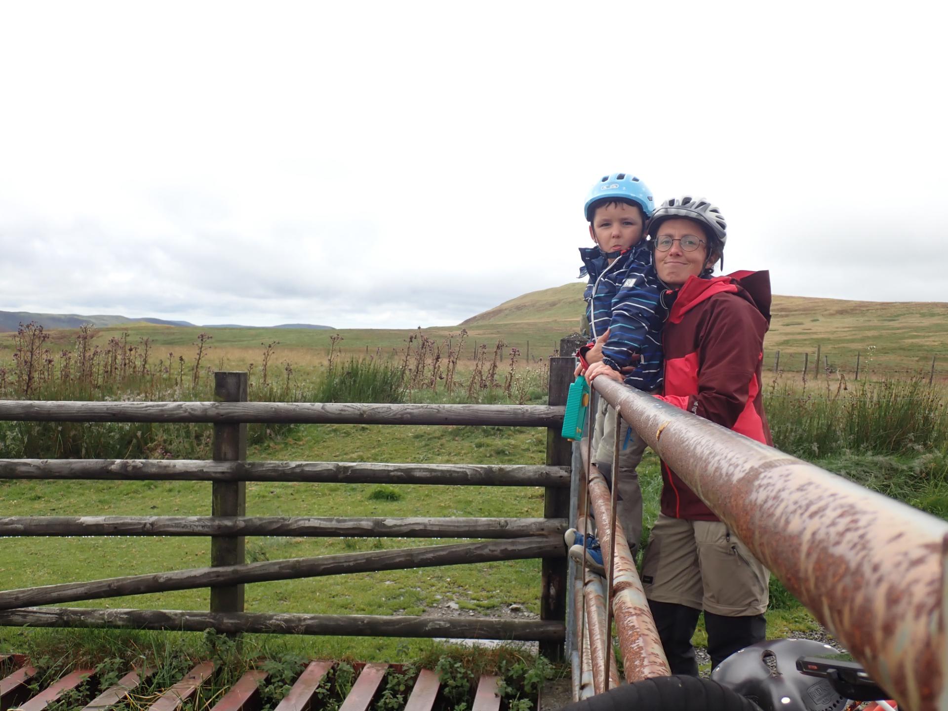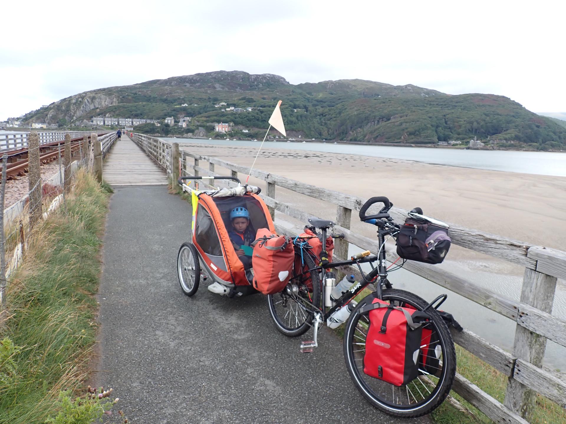 Un garçon de 4 ans en remorque et sa maman à vélo pour deux semaines au pays de Galles.