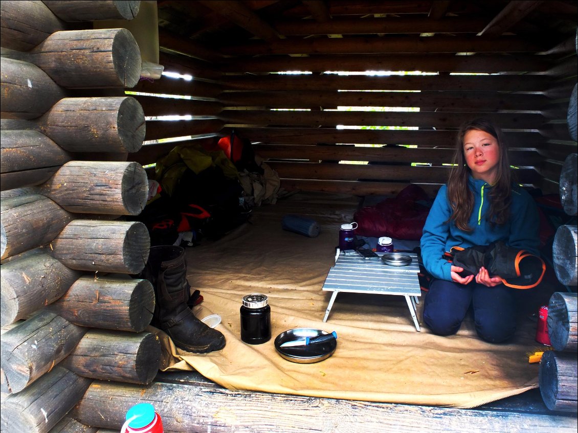 Nous nous dirigeons vers un shelter repéré sur une carte mais malheureusement pour nous, il sera inutilisable et comme il n'y a aucun terrain pour planter la tente, nous trouvons refuge dans la cabane à bois du camp, qu'il nous faut nettoyer avant de s'installer.