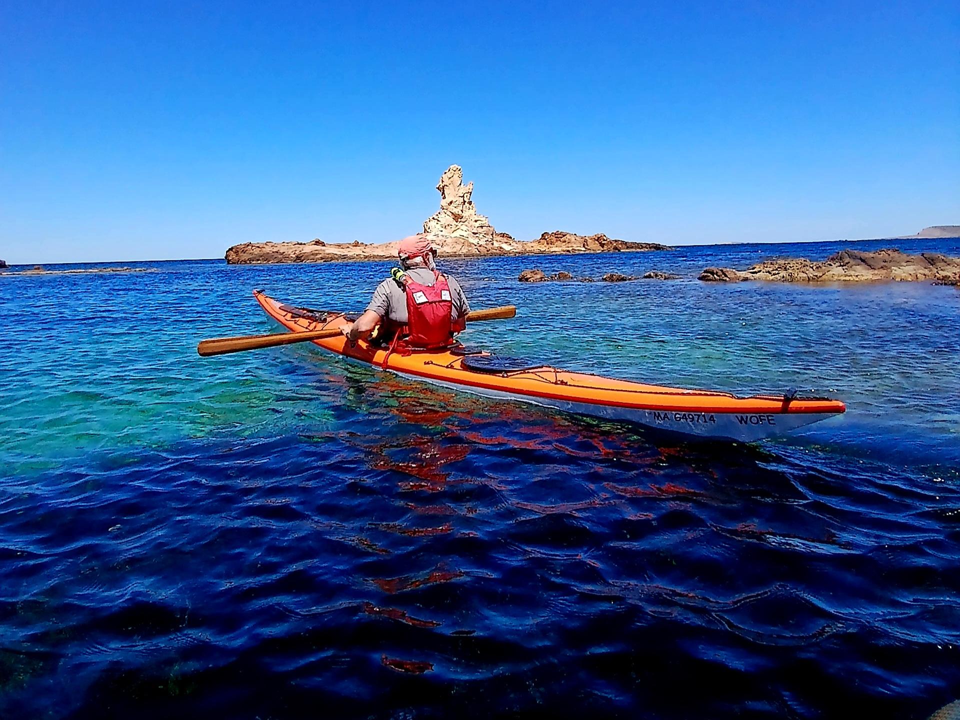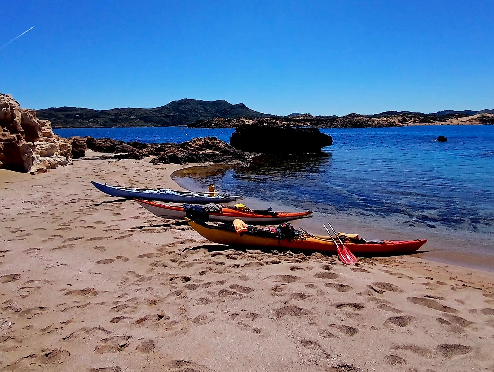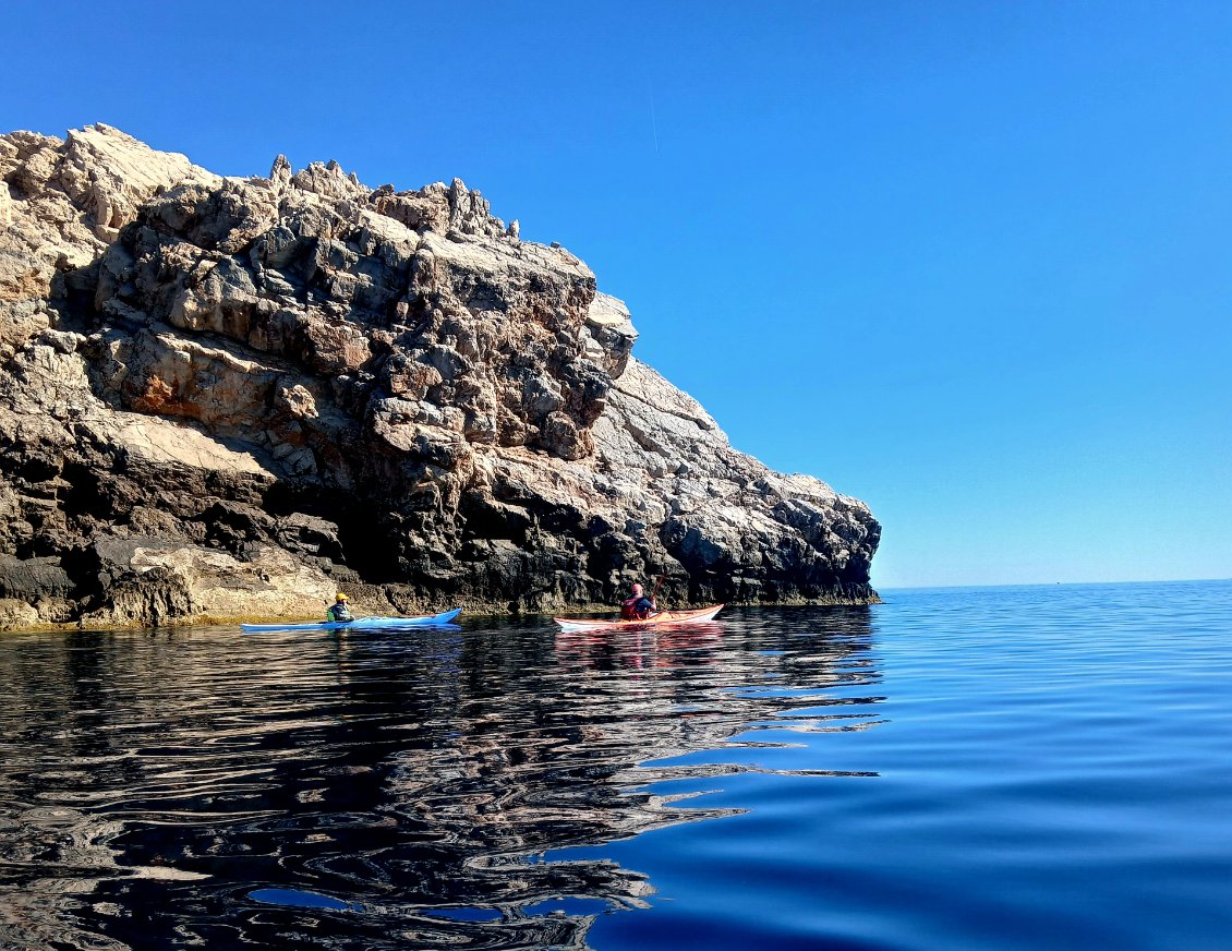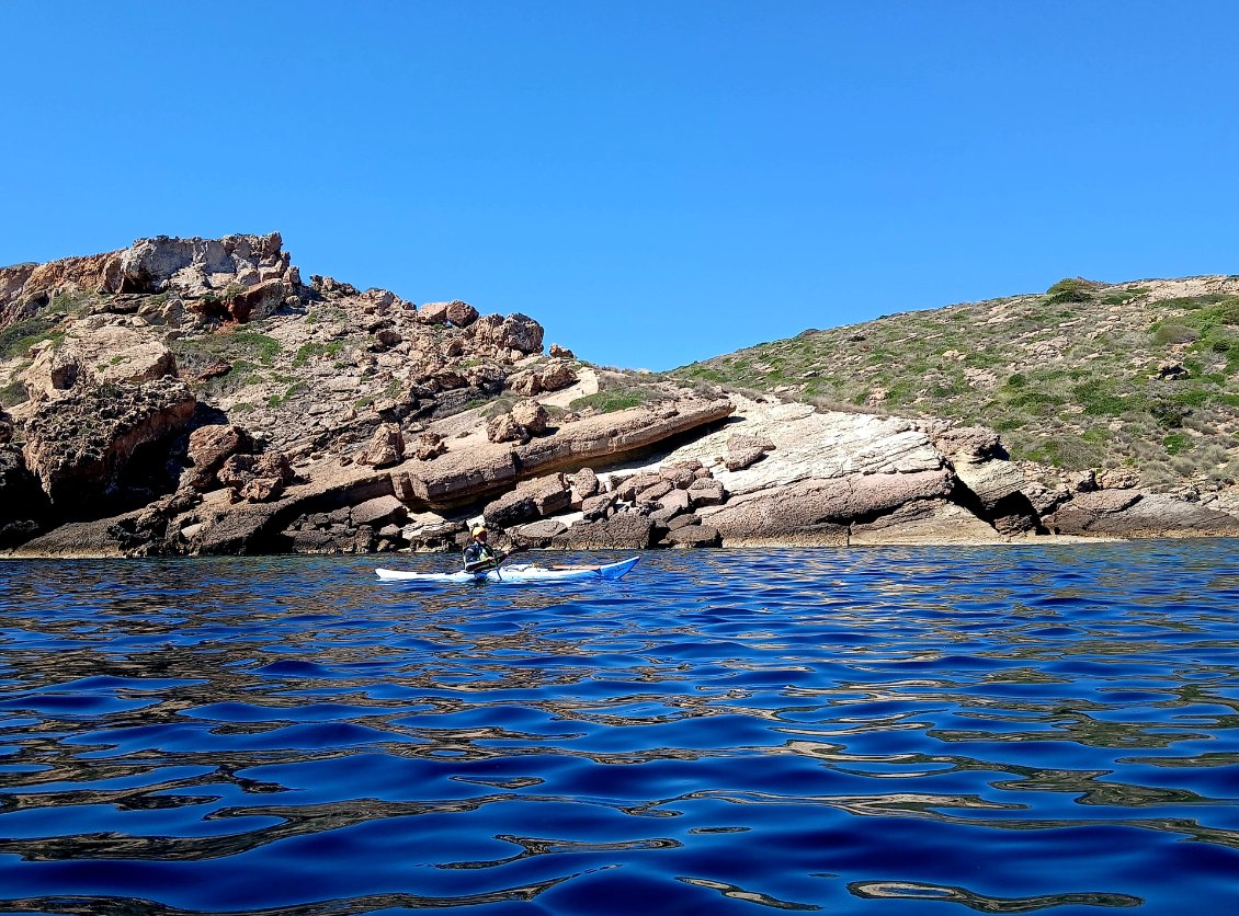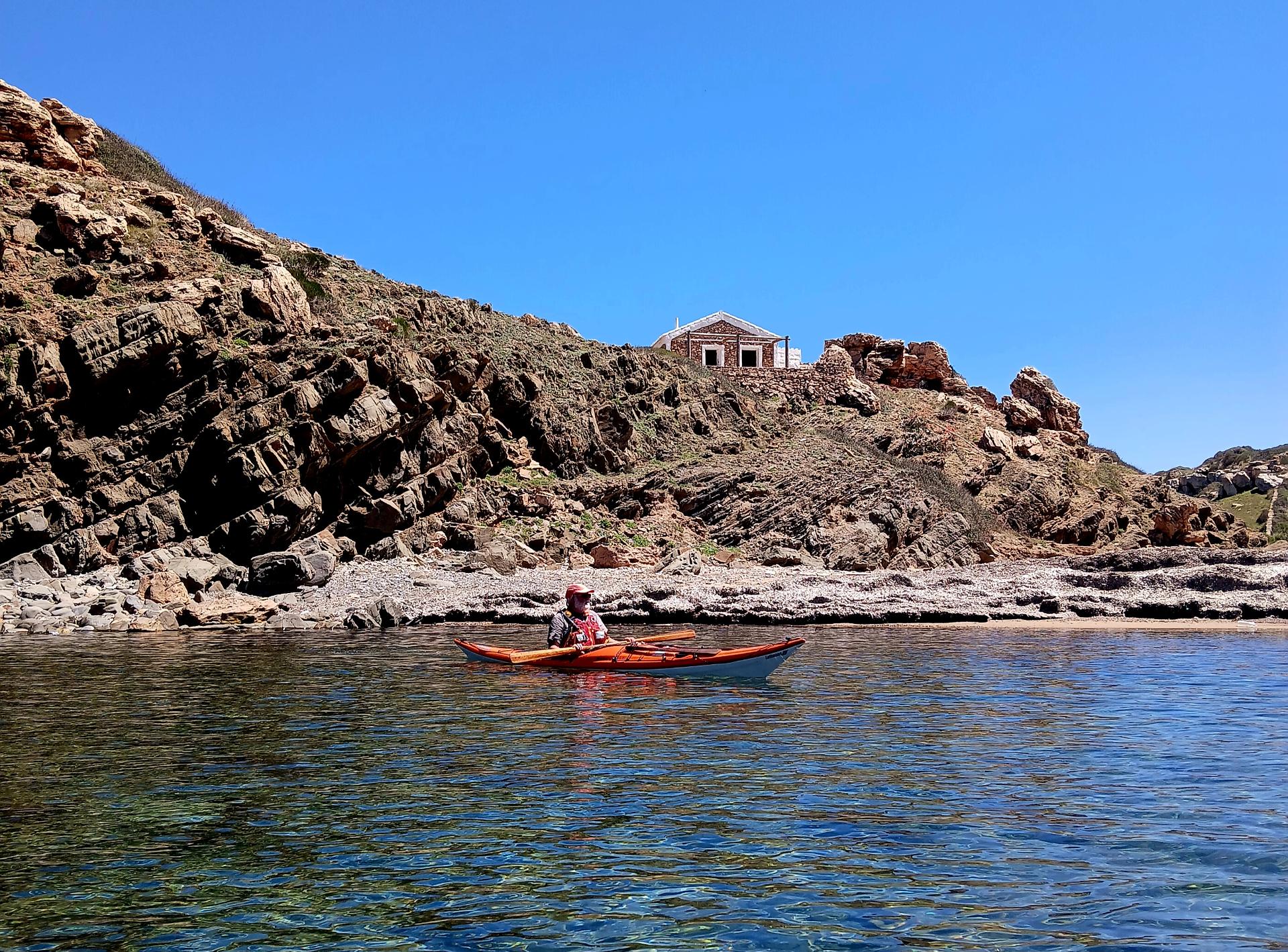 Ce matin la mer est d'huile. Notre sillage laisse une ligne parfaite, ponctuée de part et d'autre par les coups de pagaie. Après un bref arrêt logistique au port de Fornells, nous faisons route au nord pour poursuivre le périple. Le ciel est exempt du moindre nuage, l'ambiance est identique à celle d'hier, la visibilité est parfaite. Rien ne vient perturber l'horizon qui finit par se confondre avec le ciel et nos regards se portent aussi loin que nos capacités visuelles le permettent. Les curiosités géologiques se succèdent : les falaises sont tantôt constituées de conglomérats chaotiques, tantôt de couches rocheuse soigneusement superposées. Durant les deux jours de navigation nous en prenons plein les yeux. C'est comme si la côte septentrionale de l'île s'amuse à prendre toutes les formes et à se parer de toutes les couleurs, rien que pour nous. Au détour d'une anfractuosité, d'une grotte, d'un passage étroit que nous découvrons grâce à notre sagacité, l'île se donne à nous. La mer exhale des arômes intenses, délicats parfois, mais toujours authentiques. Bienfaisante, elle nous montre son visage le plus assagi et nous laisse ainsi évoluer calmement au plus près du grès et du calcaire, dans des criques secrètes, au bas des falaises abruptes, dans les grottes et tunnels profonds ou encore sur les eaux turquoises qui bordent les plages. L'itinéraire se déroule ainsi, de l'émerveillement à la contemplation, sans manquer les pauses déjeuner où nous atténuons les ardeurs du soleil par de fraîches baignades, prolongées d'une sieste.
