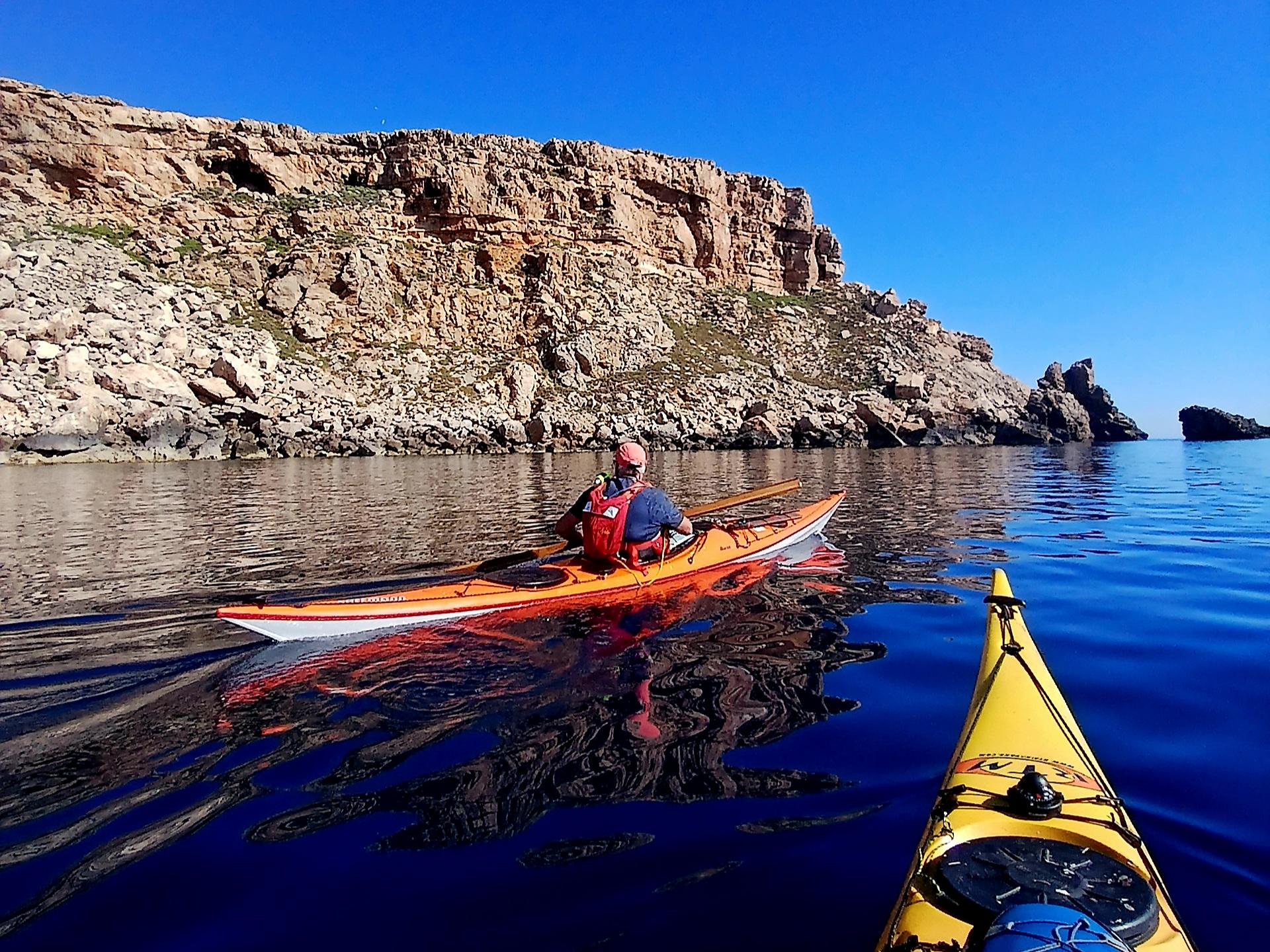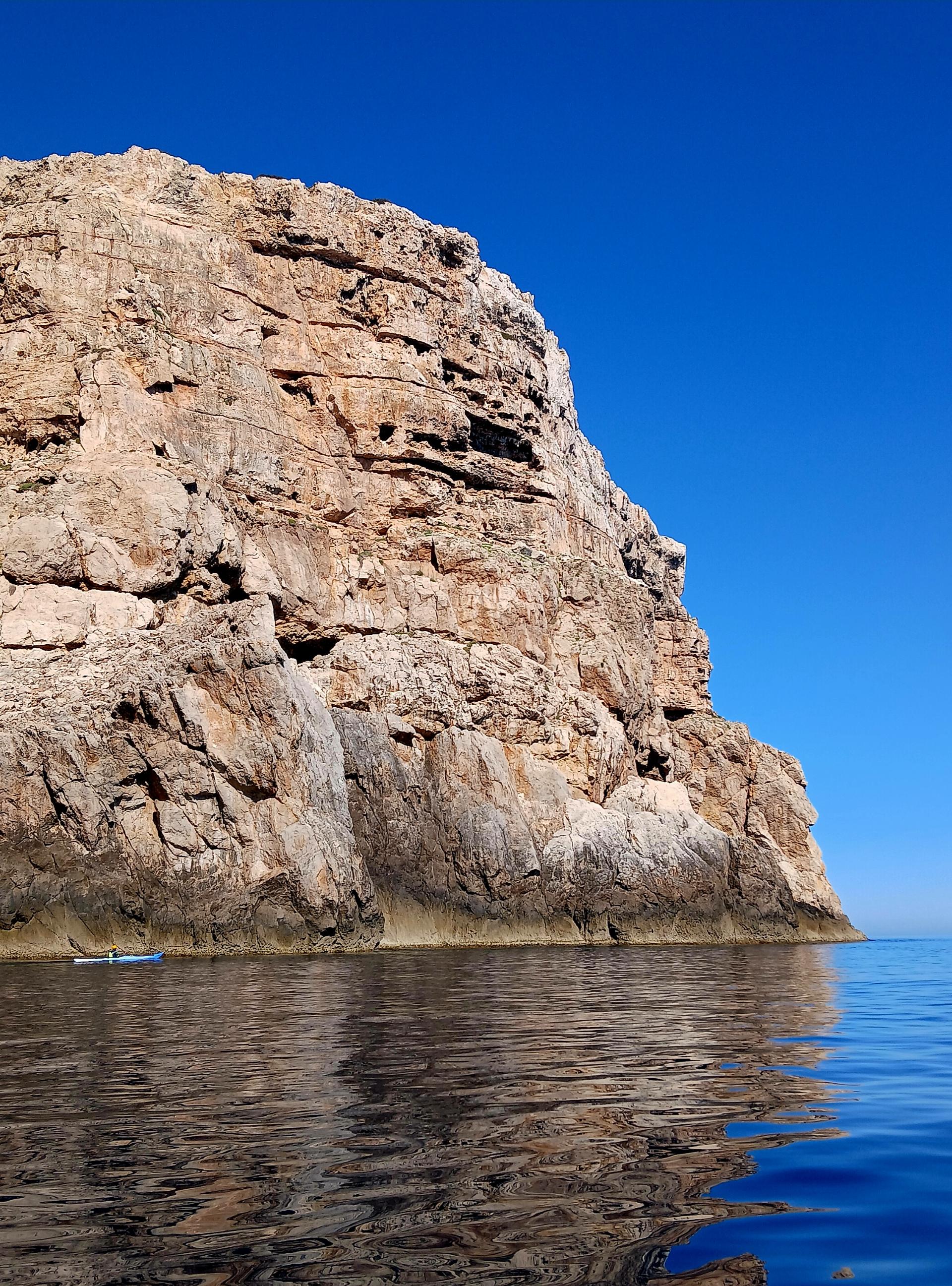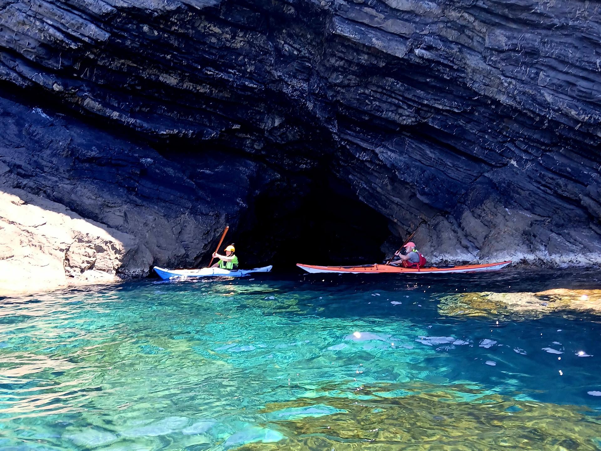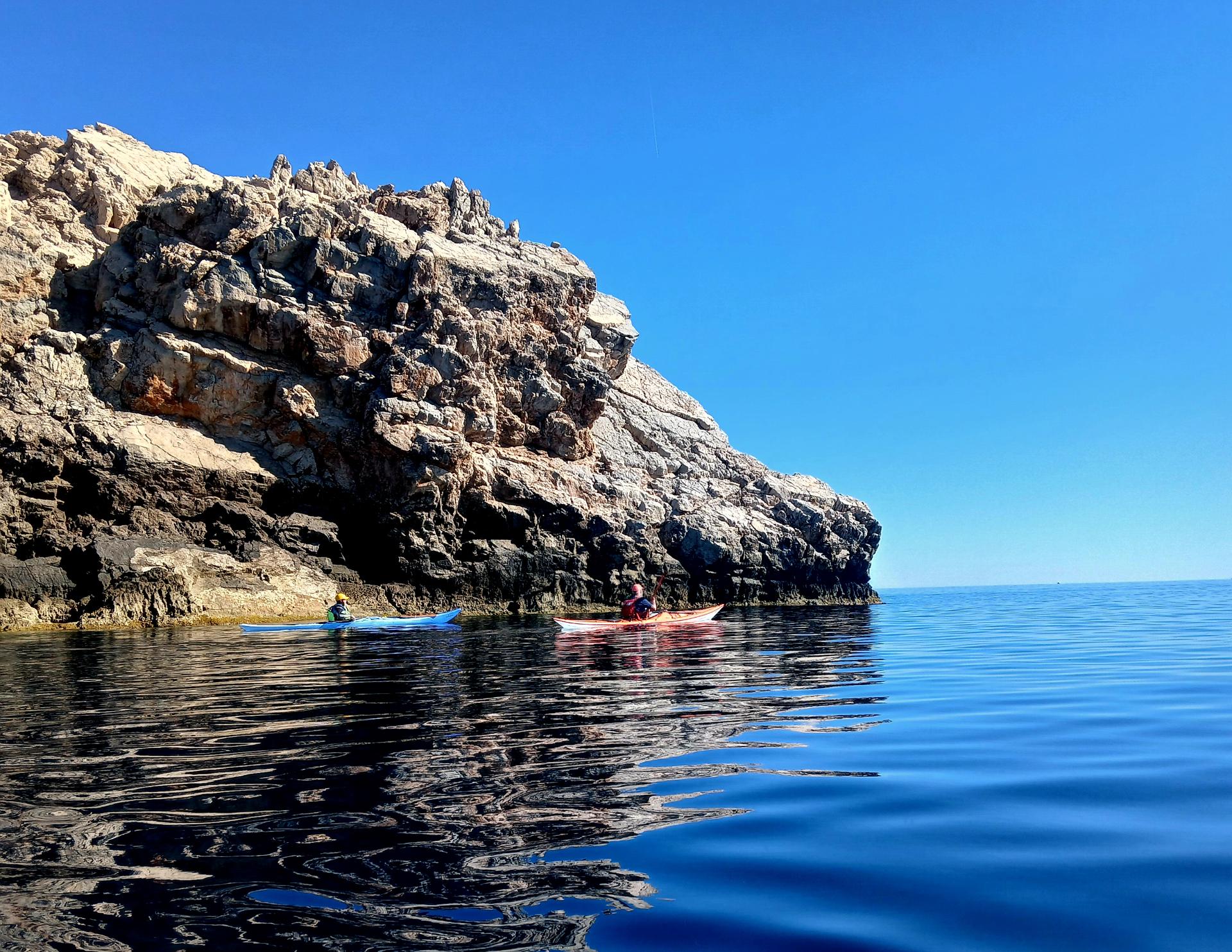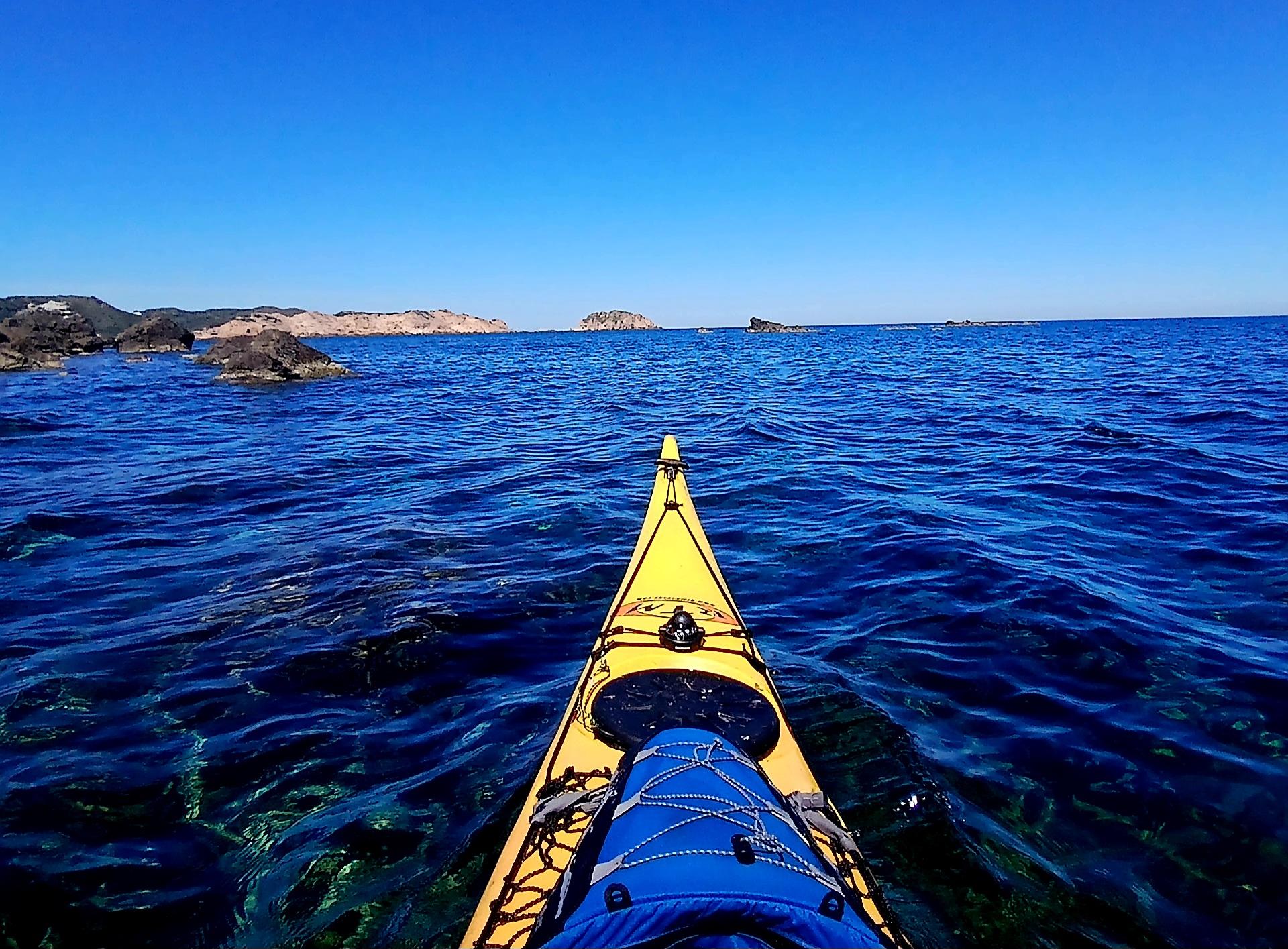 Ce matin la mer est d'huile. Notre sillage laisse une ligne parfaite, ponctuée de part et d'autre par les coups de pagaie. Après un bref arrêt logistique au port de Fornells, nous faisons route au nord pour poursuivre le périple. Le ciel est exempt du moindre nuage, l'ambiance est identique à celle d'hier, la visibilité est parfaite. Rien ne vient perturber l'horizon qui finit par se confondre avec le ciel et nos regards se portent aussi loin que nos capacités visuelles le permettent. Les curiosités géologiques se succèdent : les falaises sont tantôt constituées de conglomérats chaotiques, tantôt de couches rocheuse soigneusement superposées. Durant les deux jours de navigation nous en prenons plein les yeux. C'est comme si la côte septentrionale de l'île s'amuse à prendre toutes les formes et à se parer de toutes les couleurs, rien que pour nous. Au détour d'une anfractuosité, d'une grotte, d'un passage étroit que nous découvrons grâce à notre sagacité, l'île se donne à nous. La mer exhale des arômes intenses, délicats parfois, mais toujours authentiques. Bienfaisante, elle nous montre son visage le plus assagi et nous laisse ainsi évoluer calmement au plus près du grès et du calcaire, dans des criques secrètes, au bas des falaises abruptes, dans les grottes et tunnels profonds ou encore sur les eaux turquoises qui bordent les plages. L'itinéraire se déroule ainsi, de l'émerveillement à la contemplation, sans manquer les pauses déjeuner où nous atténuons les ardeurs du soleil par de fraîches baignades, prolongées d'une sieste.