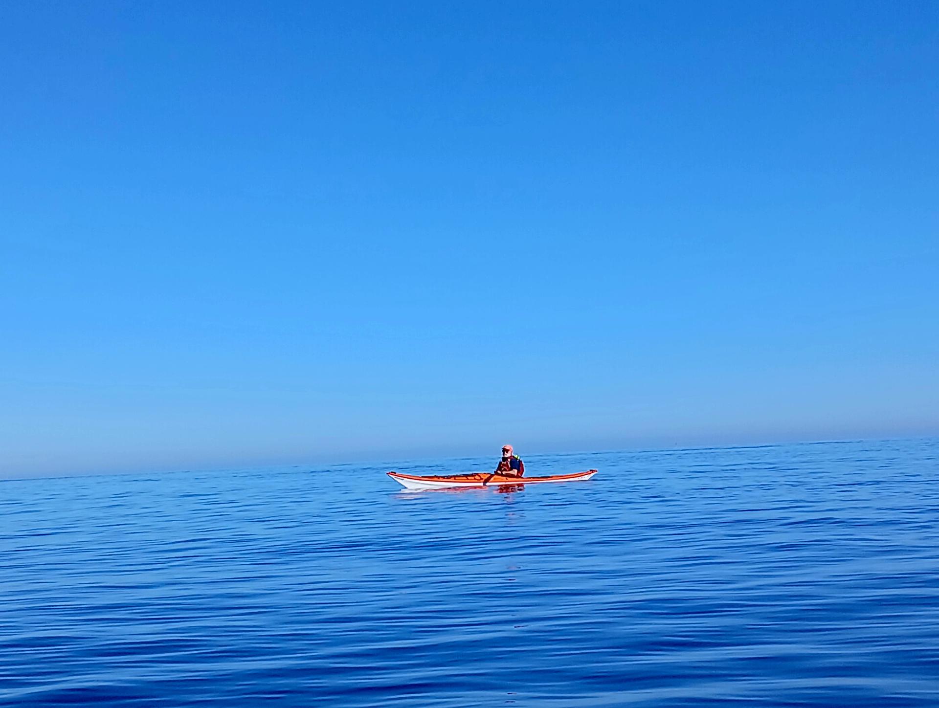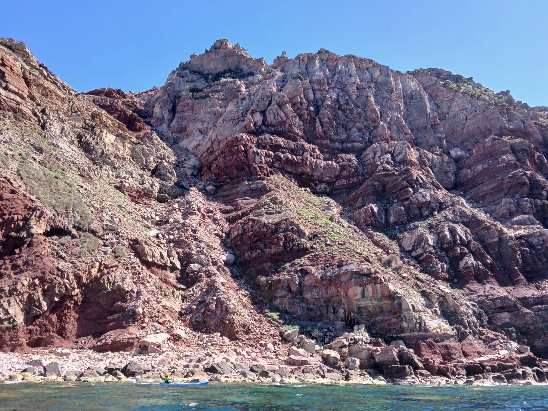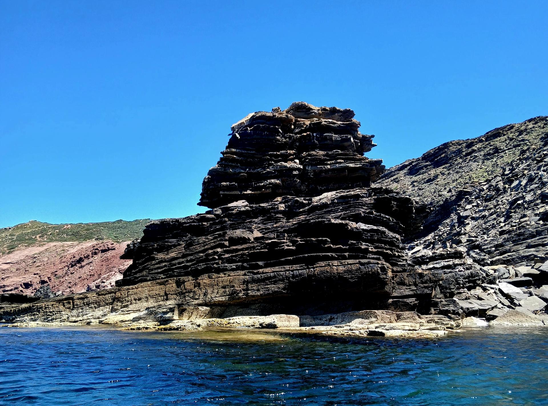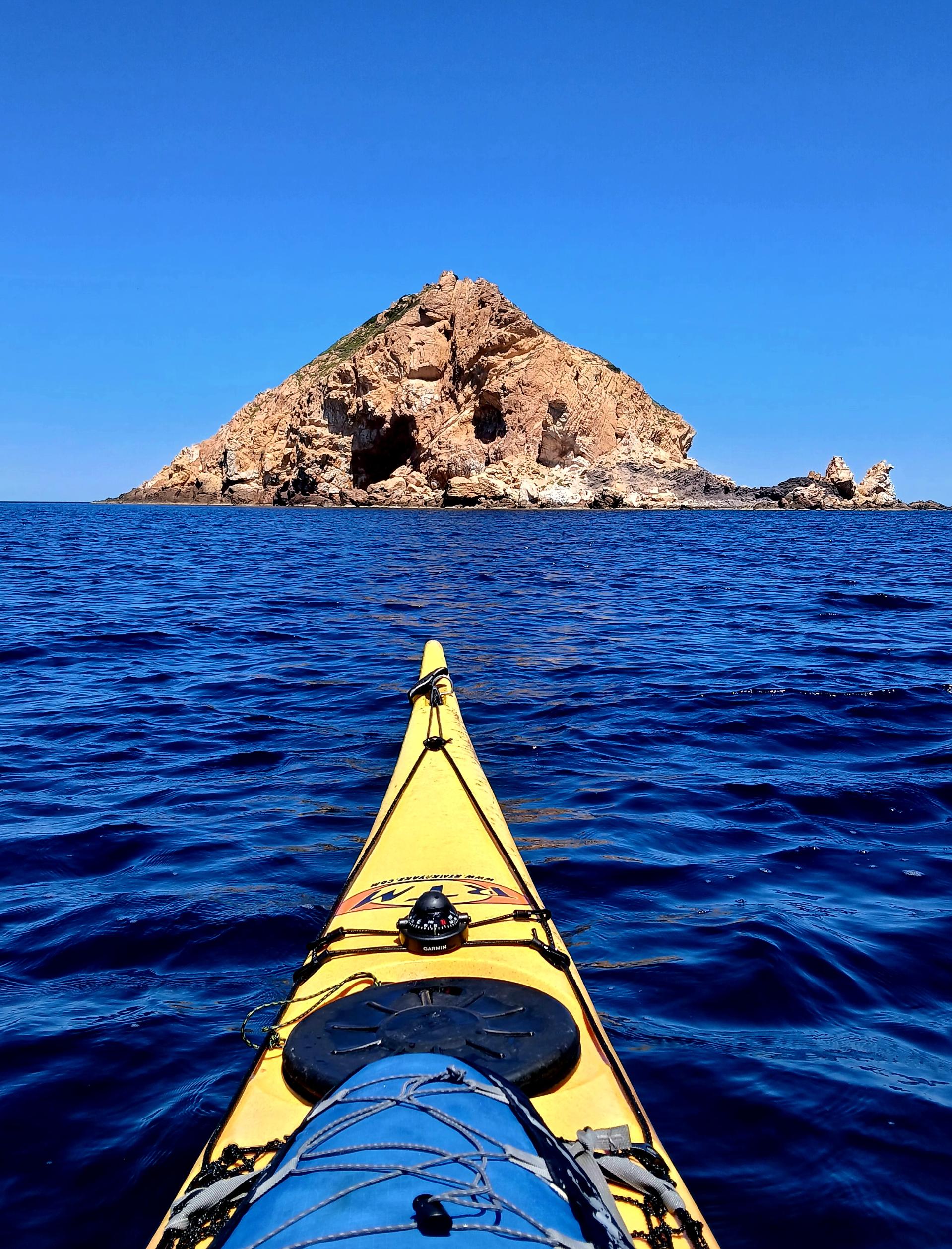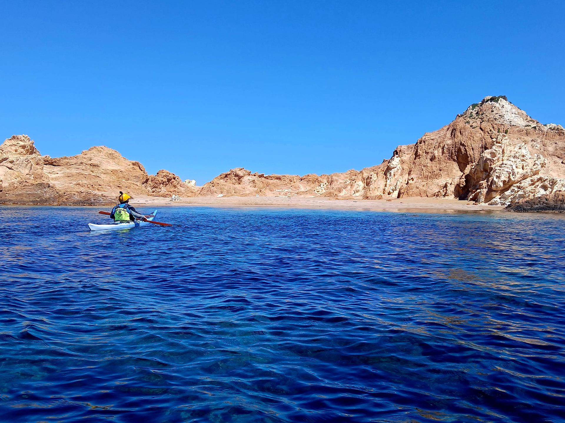 Ce matin la mer est d'huile. Notre sillage laisse une ligne parfaite, ponctuée de part et d'autre par les coups de pagaie. Après un bref arrêt logistique au port de Fornells, nous faisons route au nord pour poursuivre le périple. Le ciel est exempt du moindre nuage, l'ambiance est identique à celle d'hier, la visibilité est parfaite. Rien ne vient perturber l'horizon qui finit par se confondre avec le ciel et nos regards se portent aussi loin que nos capacités visuelles le permettent. Les curiosités géologiques se succèdent : les falaises sont tantôt constituées de conglomérats chaotiques, tantôt de couches rocheuse soigneusement superposées. Durant les deux jours de navigation nous en prenons plein les yeux. C'est comme si la côte septentrionale de l'île s'amuse à prendre toutes les formes et à se parer de toutes les couleurs, rien que pour nous. Au détour d'une anfractuosité, d'une grotte, d'un passage étroit que nous découvrons grâce à notre sagacité, l'île se donne à nous. La mer exhale des arômes intenses, délicats parfois, mais toujours authentiques. Bienfaisante, elle nous montre son visage le plus assagi et nous laisse ainsi évoluer calmement au plus près du grès et du calcaire, dans des criques secrètes, au bas des falaises abruptes, dans les grottes et tunnels profonds ou encore sur les eaux turquoises qui bordent les plages. L'itinéraire se déroule ainsi, de l'émerveillement à la contemplation, sans manquer les pauses déjeuner où nous atténuons les ardeurs du soleil par de fraîches baignades, prolongées d'une sieste.