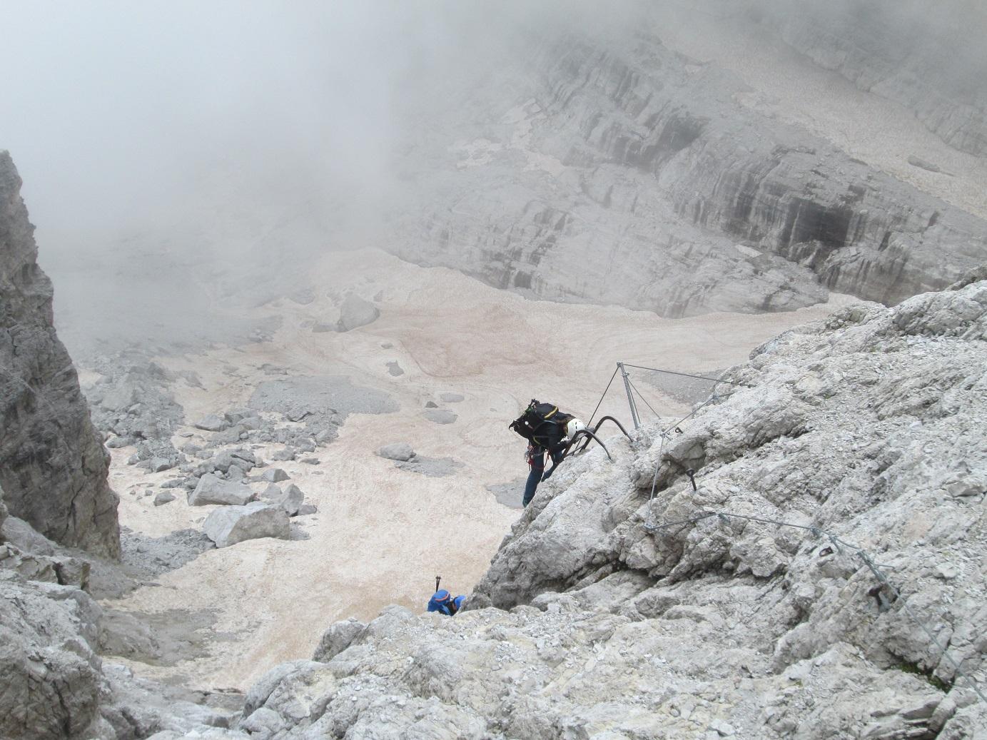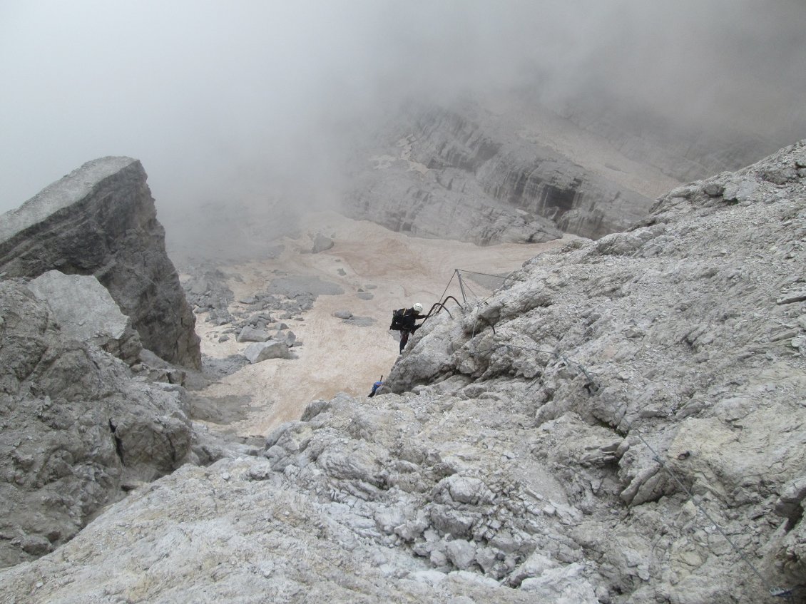 Une des deux plus grosses étapes de notre tour de la Brenta. Nous quittons le refuge Brentei assez tôt pour une longue journée. Notre premier objectif est la Bocca di Brenta (2552 m) atteinte via le sentier 318 qui débouche à la fin de la via ferrata delle Bocchette Centrale. Une pente de neige sous le col nous tente bien, mais semble assez exposée aux chutes de pierre d'autant que l'itinéraire normal passe dans les barres rocheuse équipées de câbles et barreaux (nous prenons finalement cette option). Nous atteignons rapidement le refuge Pedrotti en travaux. De là, nous prenons vers le sud-ouest le sentier 358 qui remonte un vallon glaciaire avec des passages dans des éboulis pas très stables et assez raides. La fin est plus commode car de nombreux névés persistent et facilitent la montée. Le seul point technique est un passage équipé de barreaux qui se trouvent dans la rimaye et nous oblige à un bon pas d'escalade en 3 en grosses avant une dernière pente pour atteindre la Sella della Tosa (2868 m). Nous déjeunons avant d'attaquer la via ferrata Brentari. Une longue vire câblée et quelques échelles mènent à la Bocca della Tosa (2845 m) où la via "plonge" dans la Val d'Ambiez. La longue descente s'effectue par des vires et des échelles directement jusqu'au glacier d'Ambiez. Une très longue échelle inclinée, puis verticale, puis quelques barreaux nous mènent sur une pente très raide avec un passage de rimaye assez sport sans crampons. Le brouillard enveloppe maintenant le Val d'Ambiez, aussi nous suivons la trace au GPS jusqu'au refuge. La descente de la moraine est assez rude en cette fin de journée. Le refuge Agostini propose seulement une soixantaine de couchage, mais avec une ambiance plus typée montagne que nous apprécions.