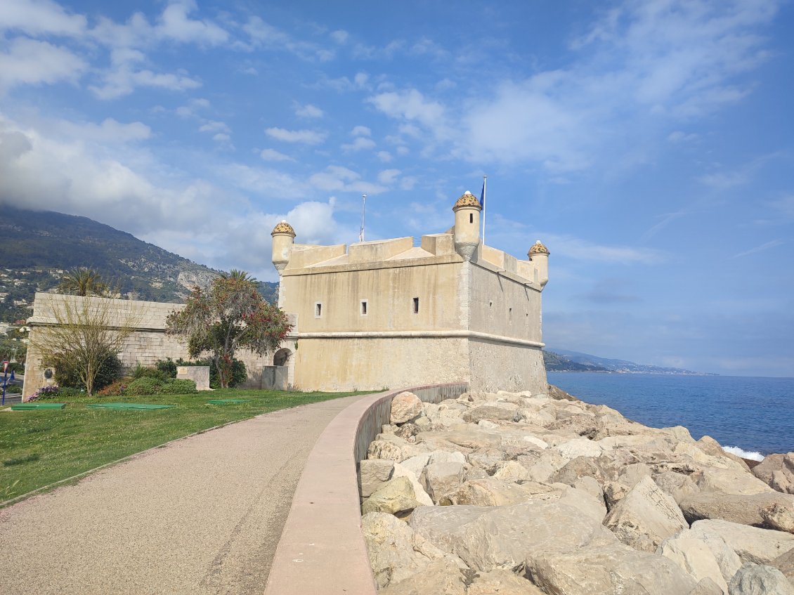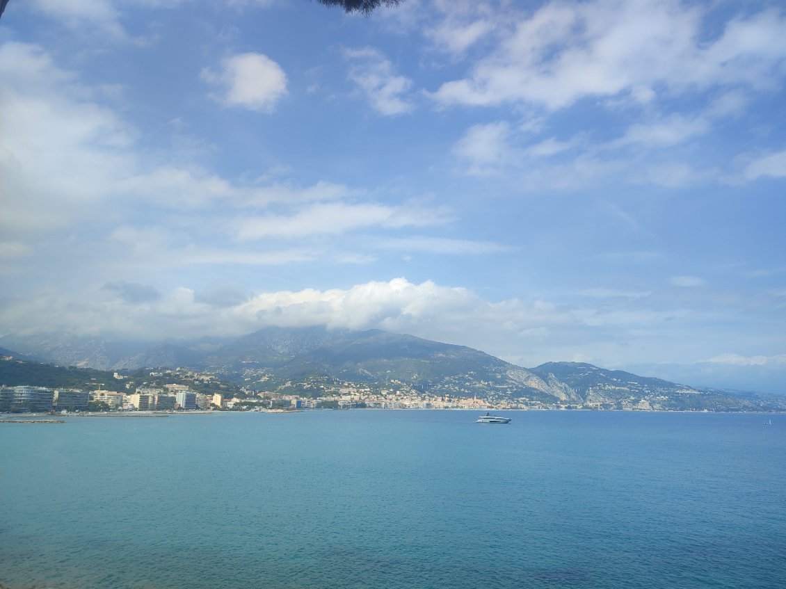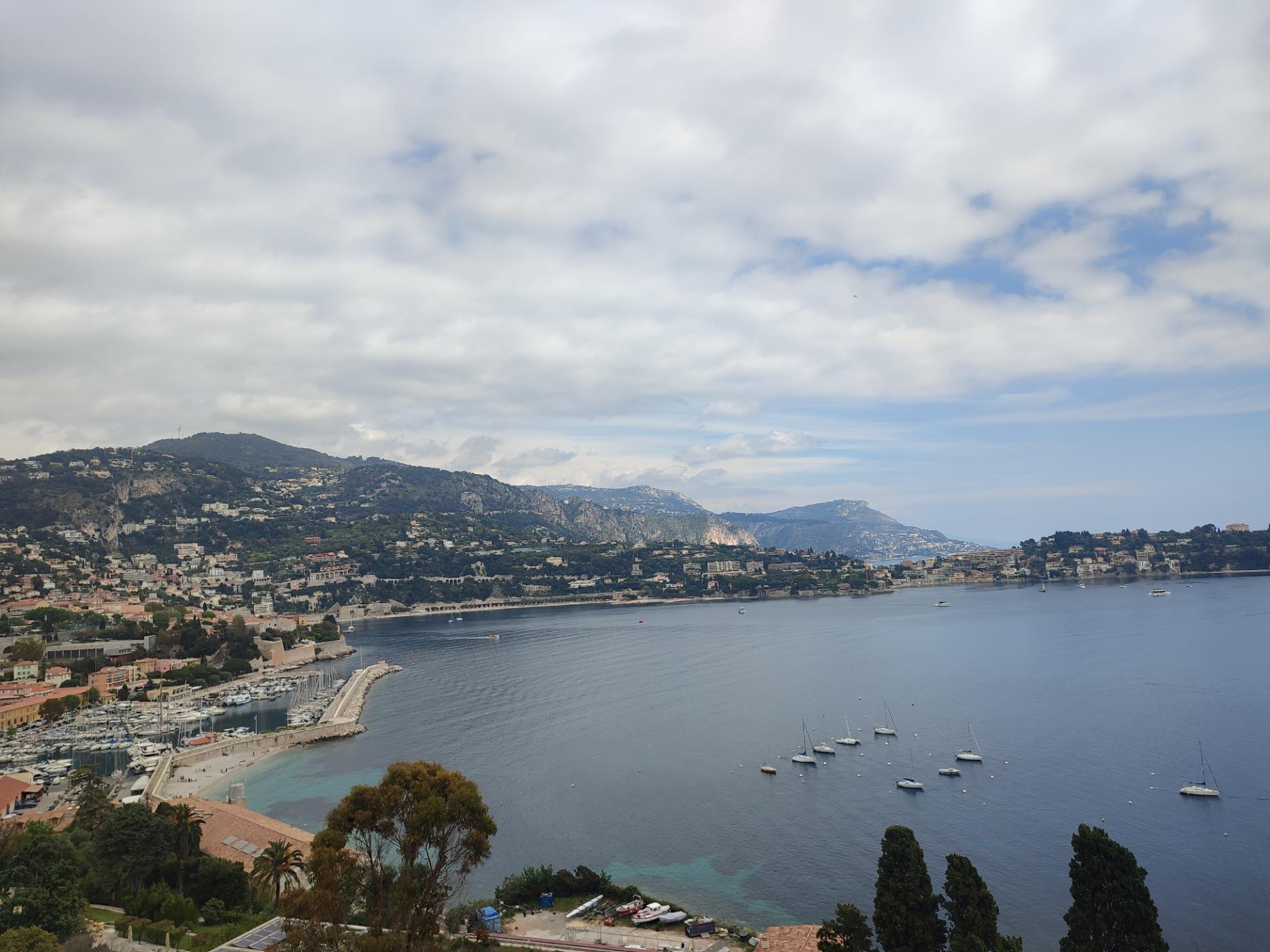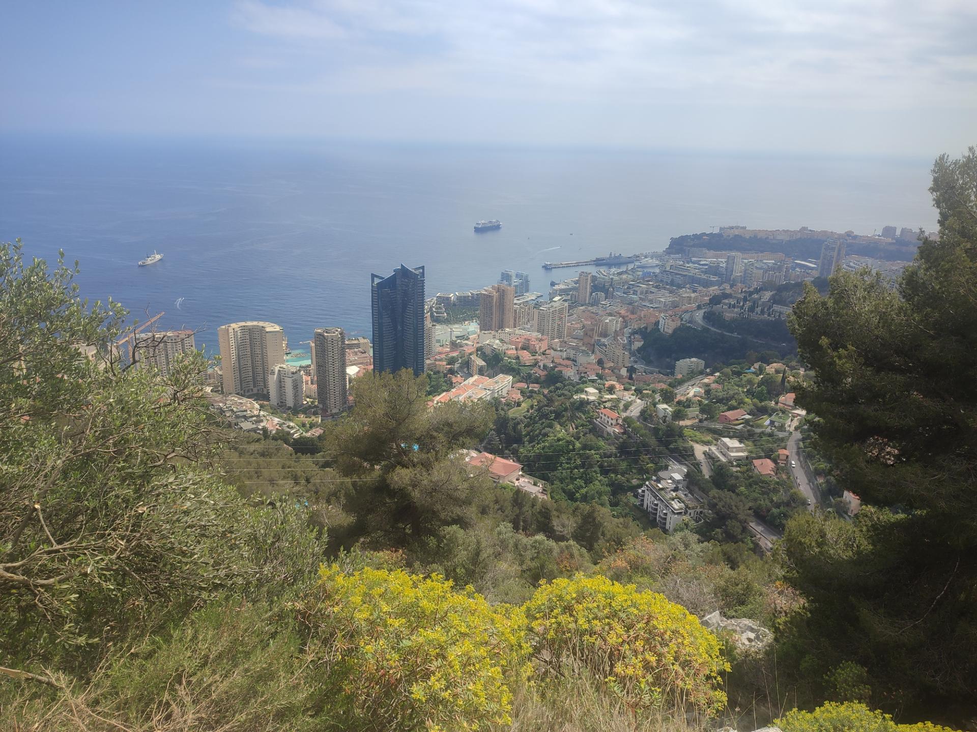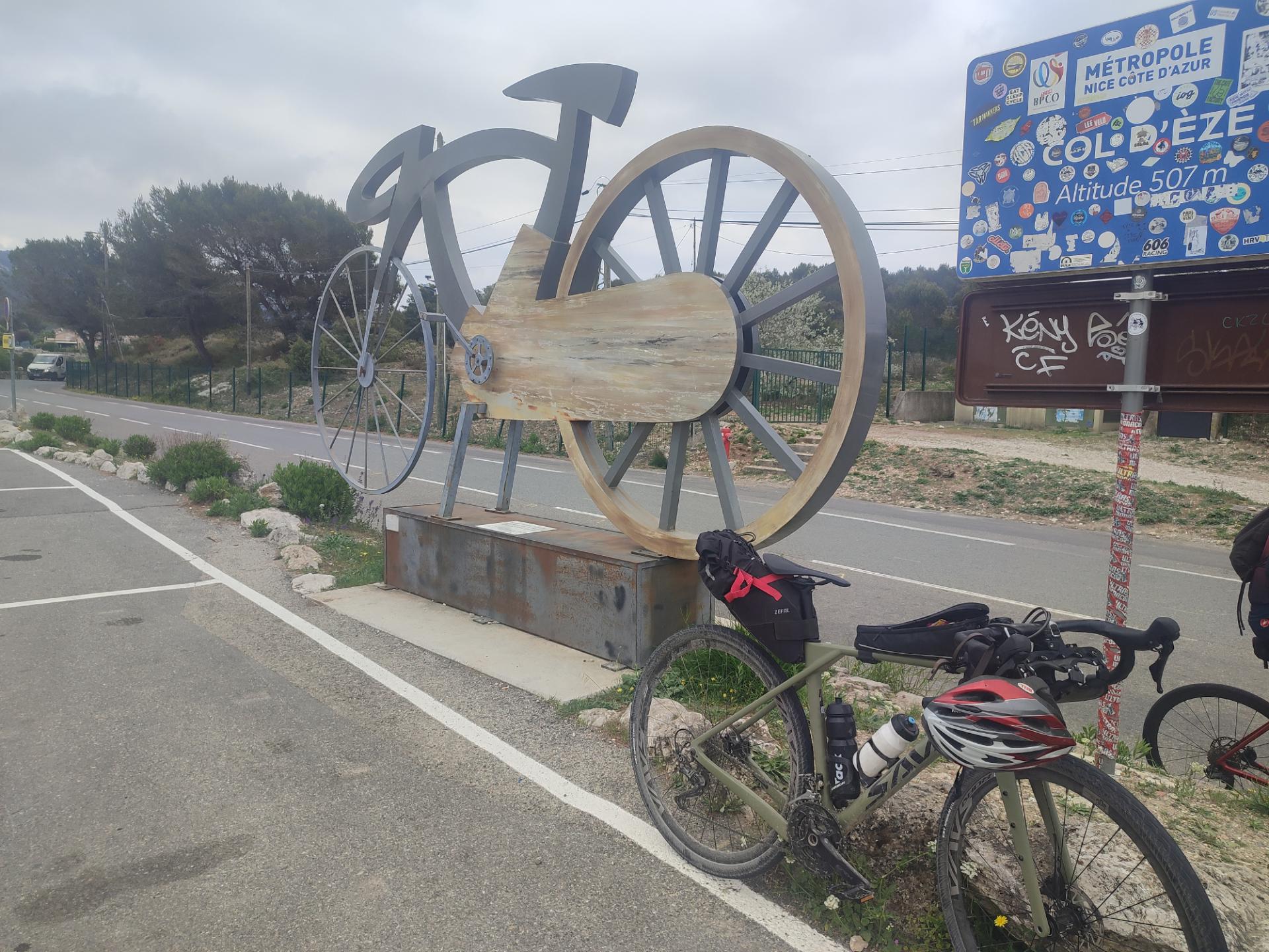 Dépôt des affaires à l'hôtel, repas de pâtes — il faut préparer le col. Je repars direction Villefranche-sur-Mer, sachant que la difficulté arrive. Quasiment 8 km à monter avec une pente moyenne de 6,2 %. Je grimpe à mon rythme, toute la transmission sur le petit plateau. Des travaux en circulation alternée me font mettre le pied à terre une fois — la crainte de ne pas pouvoir redémarrer. Je m'en sors. Un autre cycliste...