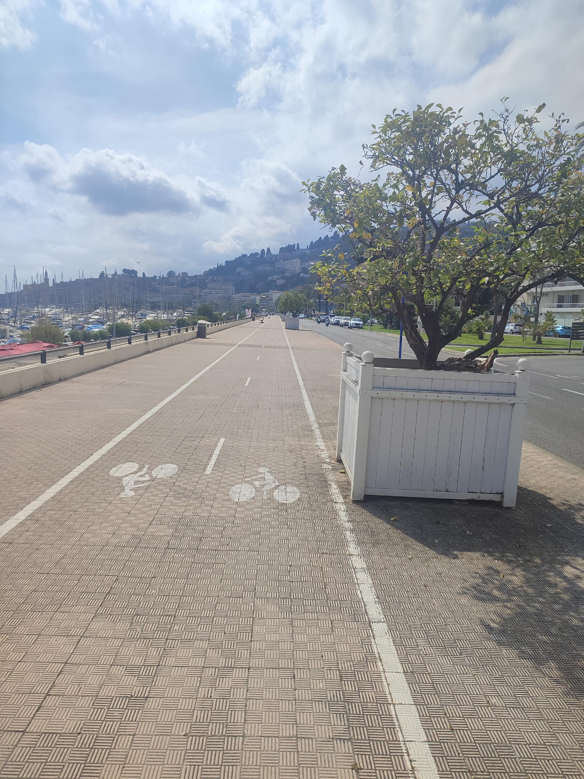 Auribeau-sur-Siagne, les chemins du GR51, puis Mandelieu-la-Napoule où la mer apparaît enfin. À partir de la plage de la Bocca, la côte s'ouvre et je vais la longer jusqu'à Nice. Cannes, qui prépare son festival — hôtels, bateaux, Croisette, luxe partout. Juan-les-Pins, Antibes, et l'arrivée sur la Promenade des Anglais, bondée de monde. Un couple de cyclistes me sert de lièvre pour m'économiser jusqu'à la place Masséna.