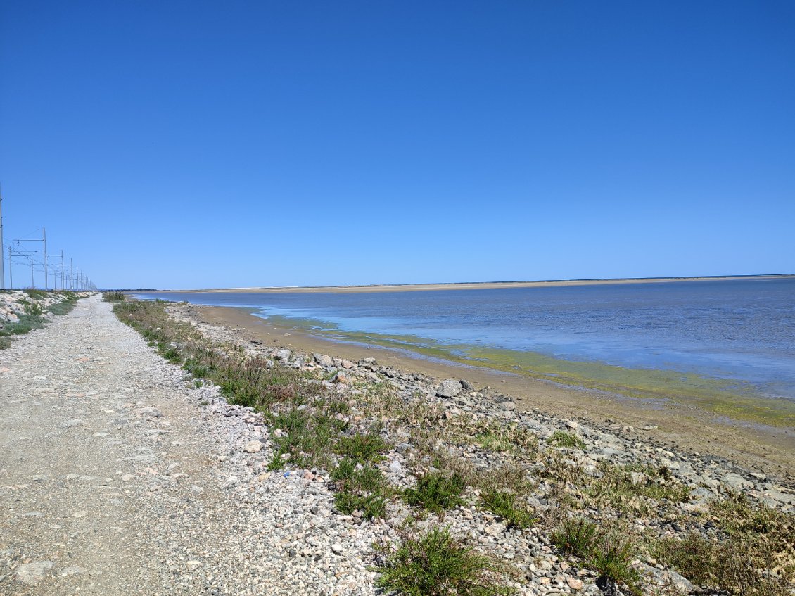 La plus longue étape du programme. Nuit en camping camarguais, moustiques compris, avec un tarp trempé d'humidité au matin. Le temps de faire sécher les affaires, départ à 8h20.