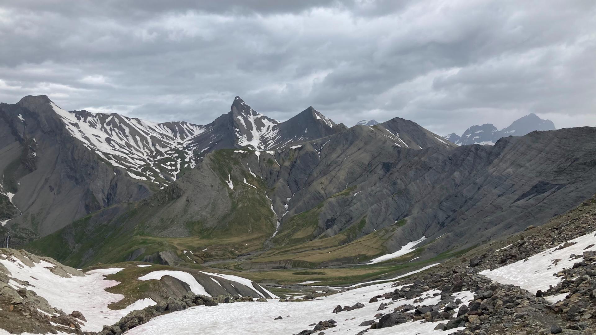 Jour 6 : Une grosse journée, sous une météo très changeante aujourd'hui... Début de matinée sur un névé en dévers jusqu'au pas de la Cavale, où la pluie commence à tomber. Descente vers le refuge du pré de la Chaumette où je prends un café et surtout des renseignements sur l'état d'enneigement des cols à venir. La quantité de neige est gérable pour les cols de la Valette, de Gouiran et de Vallonpierre... Après un pique-nique entre 2 averses, je descends vers le refuge de Vallonpierre où je pensais planter ma tente mais il est encore tôt, et surtout il se met à pleuvoir des cordes! Je décide donc de pousser 3-4h supplémentaires pour rejoindre le gîte d'étapes de La Chapelle en Valgaudémar que j'avais réservé pour la nuit suivante!