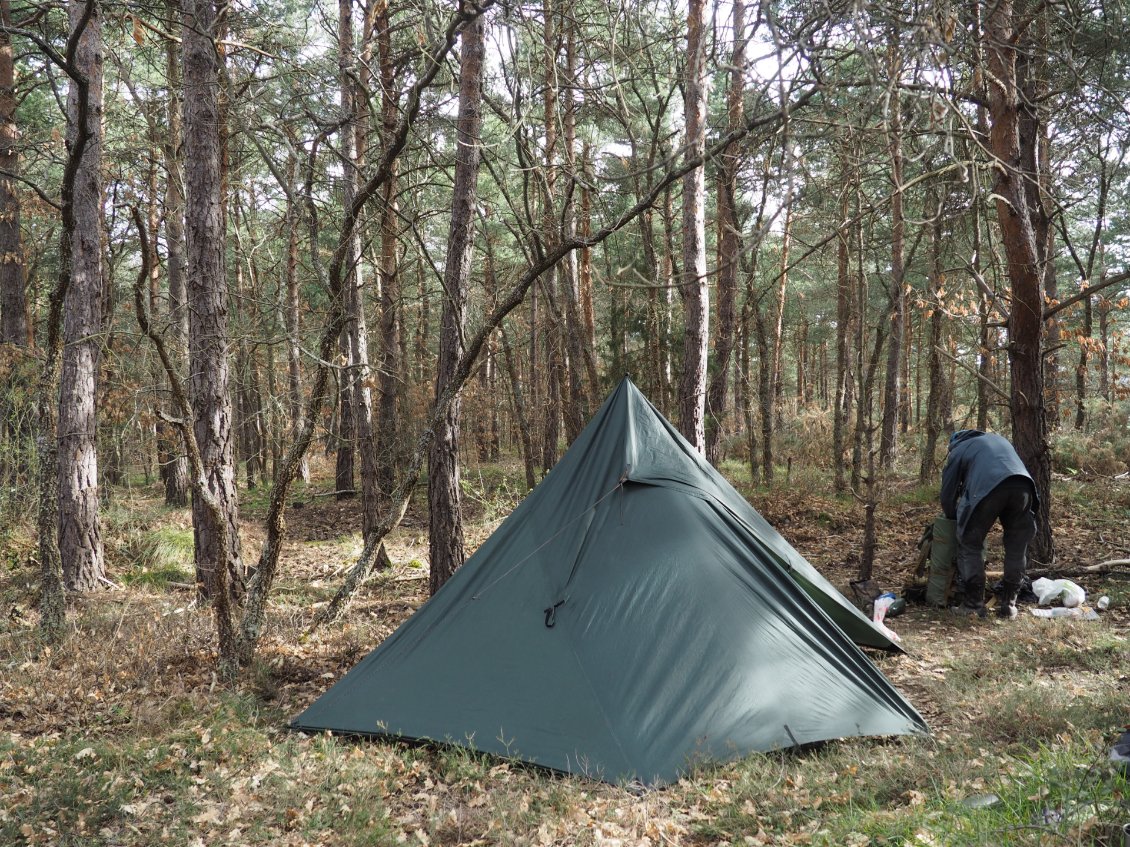 Personne ne nous dérange, jusqu’à ce que le vent se lève vers 16h. Il se faufile entre les arbres pour venir fouetter le tarp. Je reconfigure le tipi en utilisant les attaches qu’on n’avait pas encore utilisées, pour tendre les parois latérales et éviter que le vent les enfonce. Ça donne une forme bizarre au tipi, mais c’est efficace, et ça fait un peu moins de bruit.