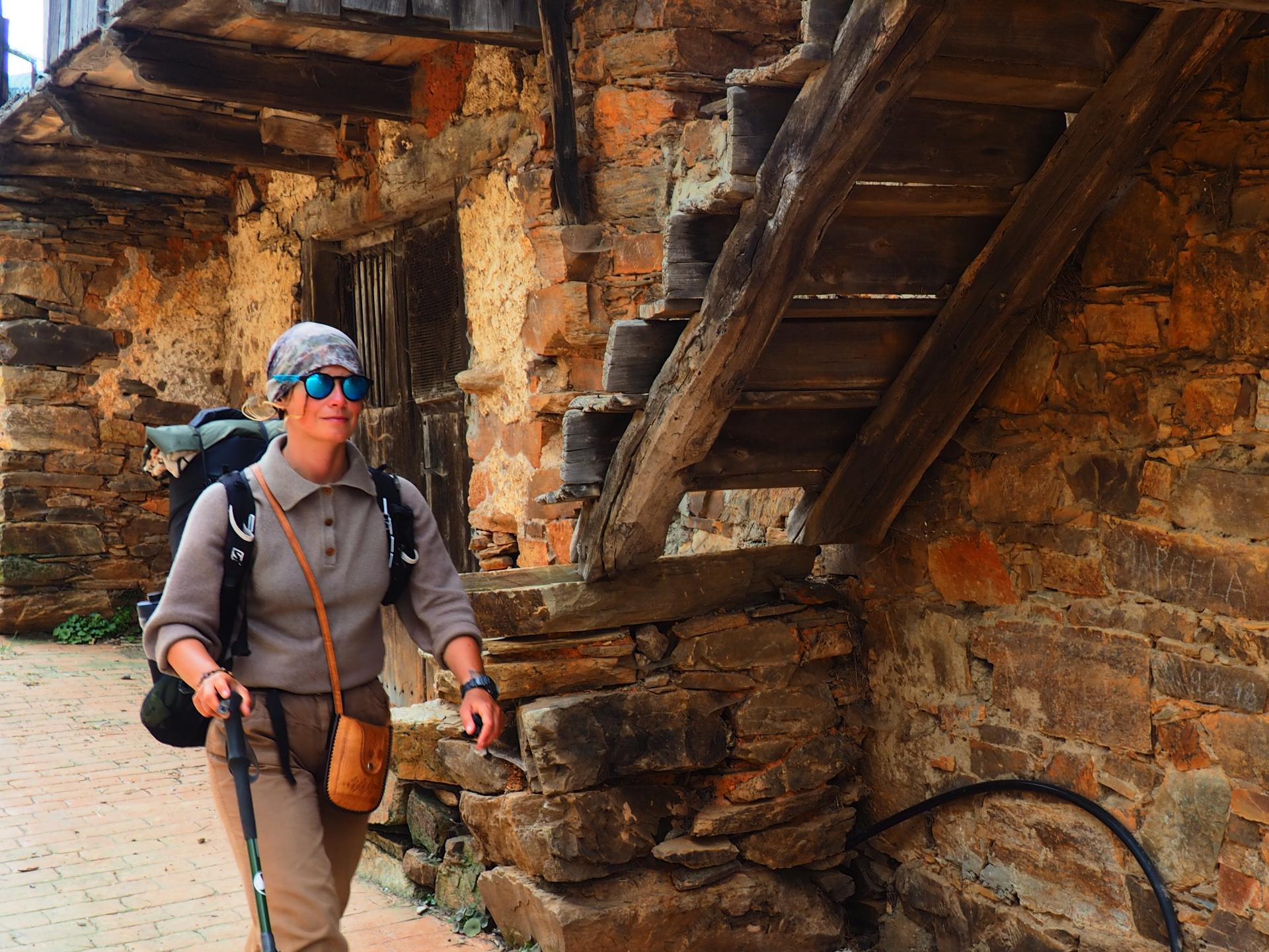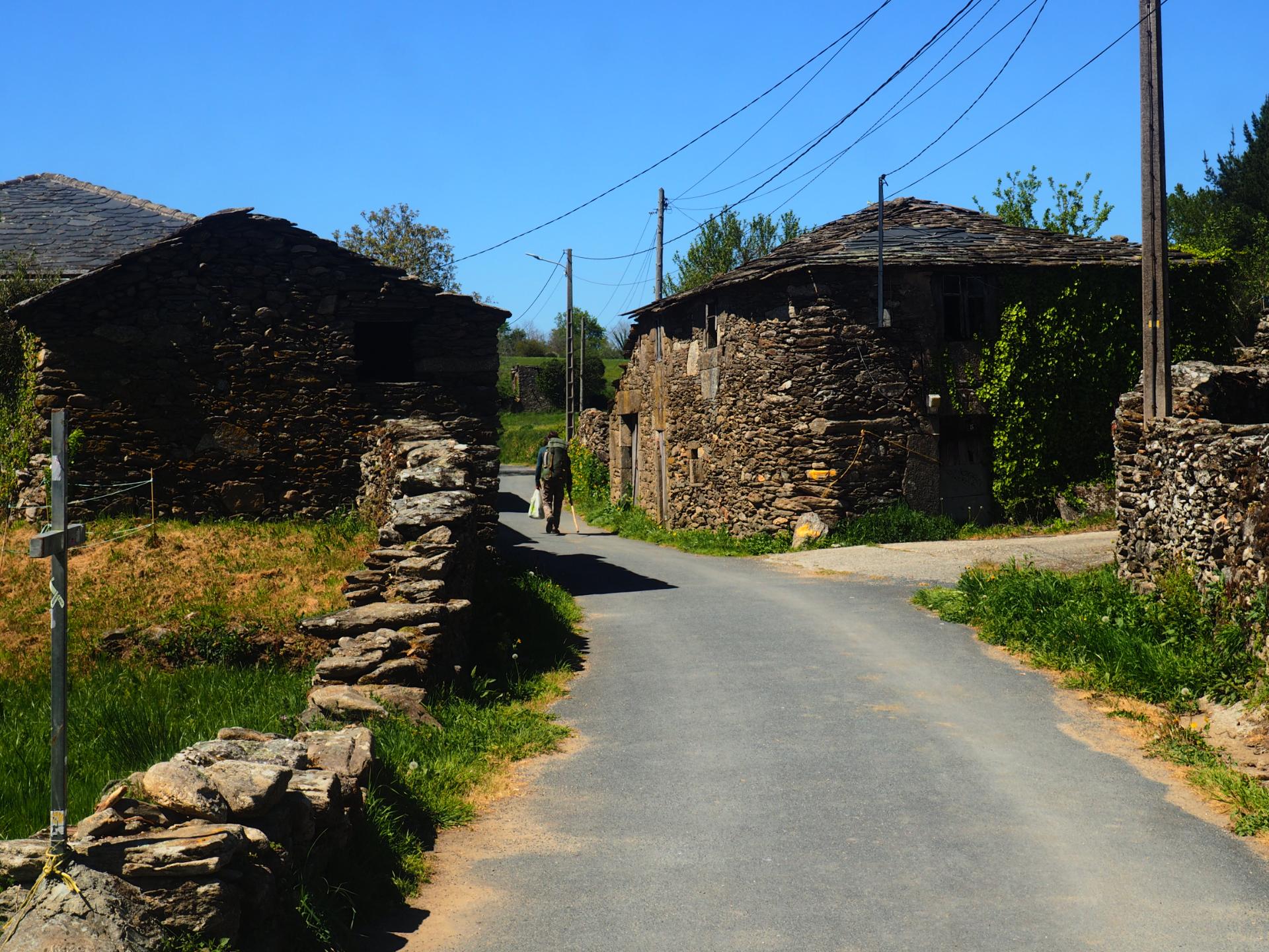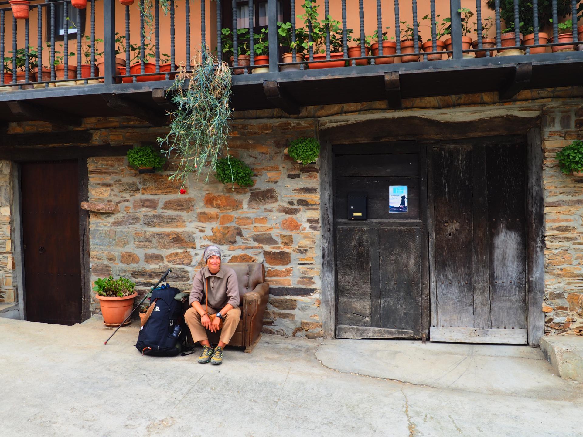 On passe Santa Catalina de Somoza. Quelques pèlerins en terrasse nous regardent comme si on venait d’une autre planète. Le village est superbe : maisons en pierre, encadrements de portes en bois repeints de couleurs vives — rouge, bleu, vert — ça ressort à merveille.