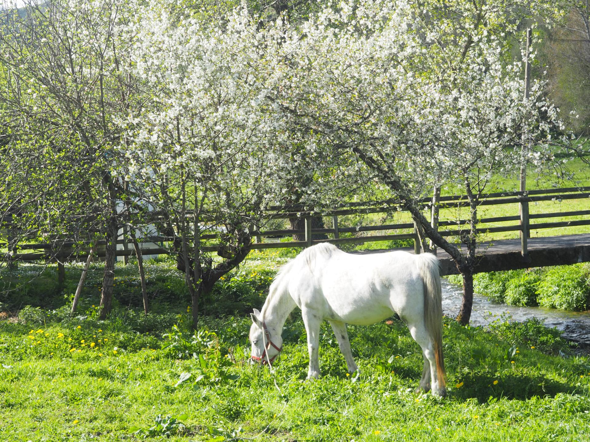 On entre dans Las Herrerías, tout est paisible. Des chevaux blancs broutent tranquillement, le soleil brille, l’eau coule doucement, le vert est d’un éclat digne d’un Walt Disney. On s’assoit un moment sur un banc, hypnotisés par ce décor.