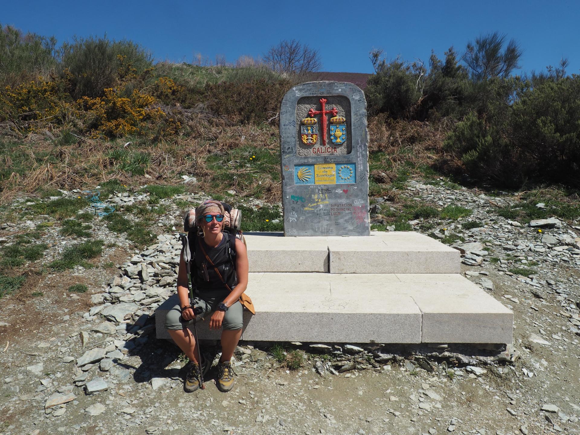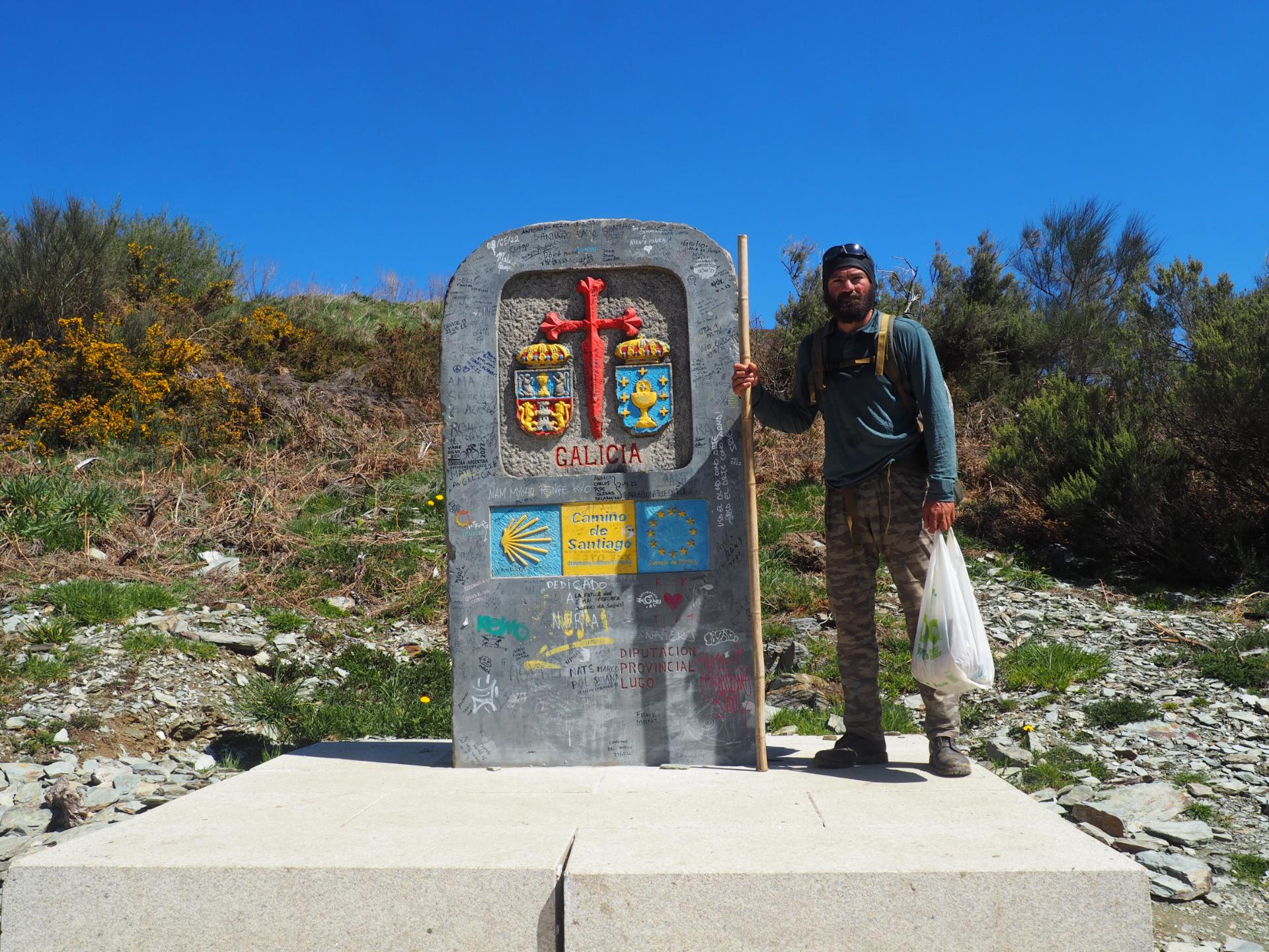 Le paysage est splendide, météo parfaite, conditions optimales pour entrer en Galice. On y est. Un peu plus haut, une jolie stèle marque l’entrée officielle en Galice, une région qu’on avait hâte de découvrir. Le blason y représente un calice, symbole du Saint Graal et de l’eucharistie, que la légende relie au passage de saint Jacques sur ces terres. Petite photo souvenir, et on file vers le sommet du col, 1 293 m, où l’on découvre ce petit hameau mythique du Camino, avec une vue panoramique sur les prairies verdoyantes et les montagnes de León. Une route permet l’accès au sommet, donc sans surprise, c’est blindé de monde en ce dimanche matin.