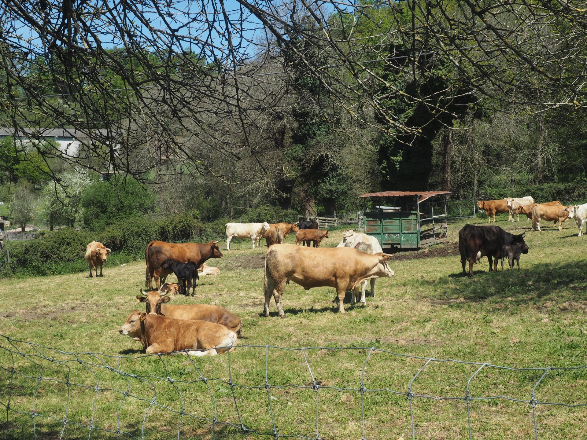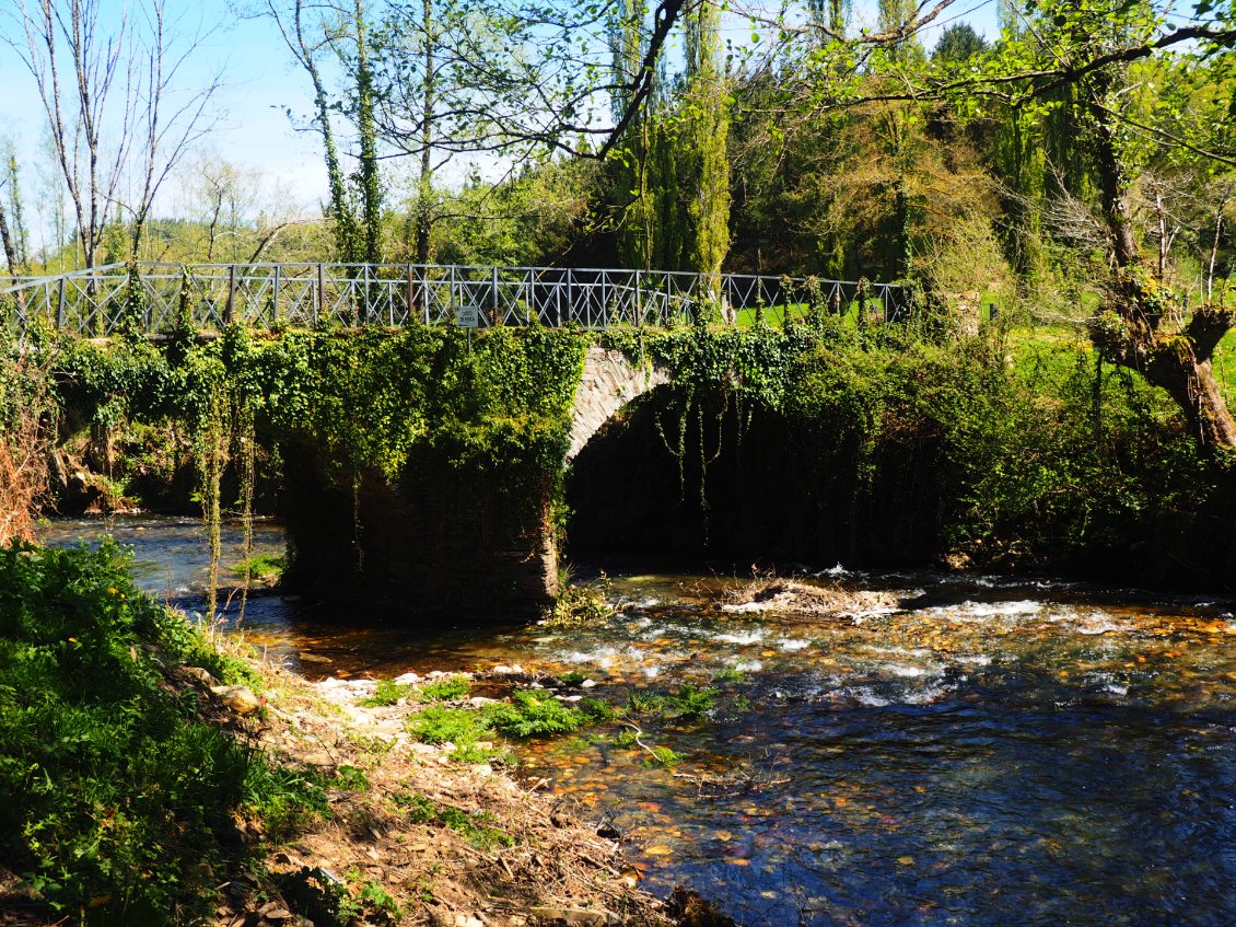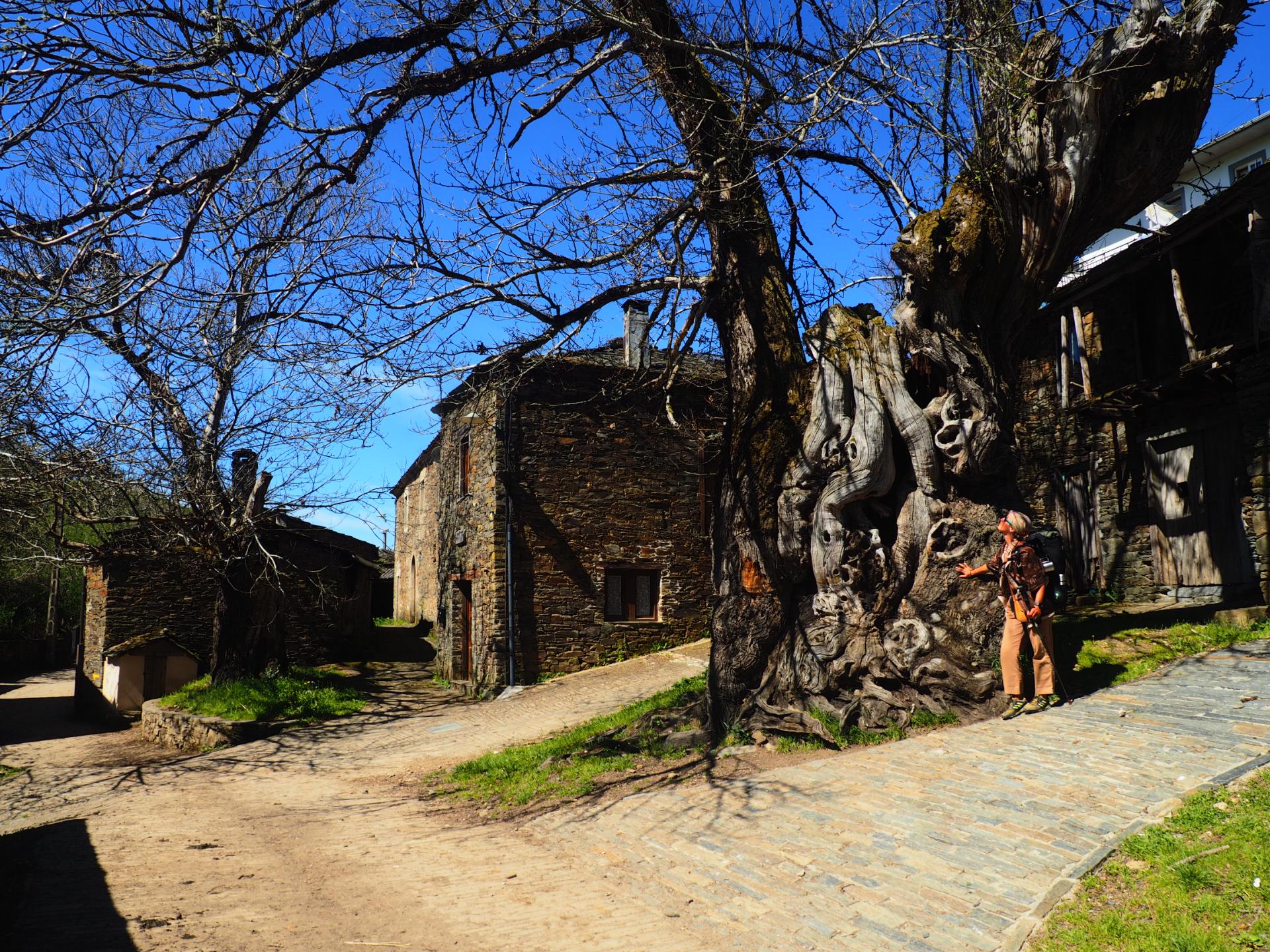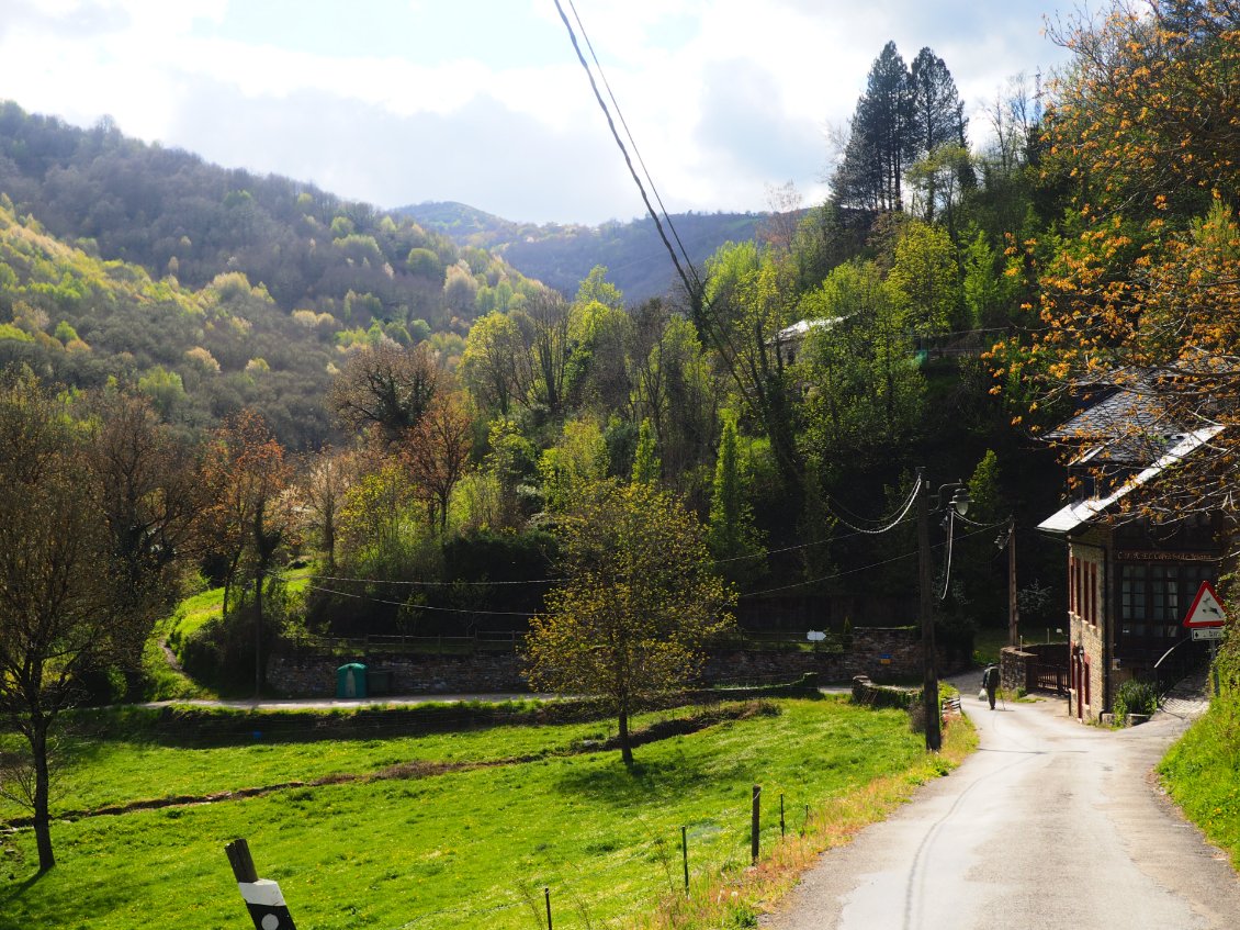 Premier village de l’étape : Pereje. D’énormes hêtres centenaires gardent l’entrée. Ici, clairement, le temps semble s’être figé en 1058. Malgré la route qui longe le bled, les vieilles baraques tanguent comme des navires. Certaines sont à vendre, je serais curieux de connaître le prix… mais il faudra un sacré lifting. Des cours d’eau se faufilent entre les maisons et les vieux moulins par des petits canaux, ça donne au village un vrai air de Moyen Âge.