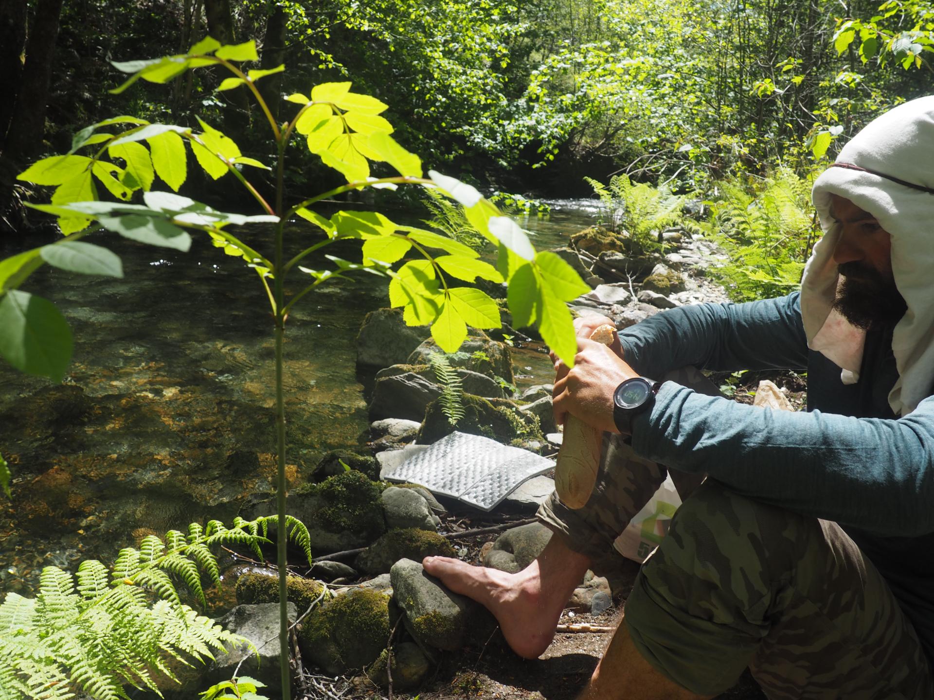 Bon, il faut attaquer l’ascension et s’avancer un peu pour demain. Le terrain n’est pas évident pour le bivouac : dense, humide, souvent en dévers. On bataille un moment avant de trouver un balcon, juste assez large pour le tipi, avec le rio en contrebas.