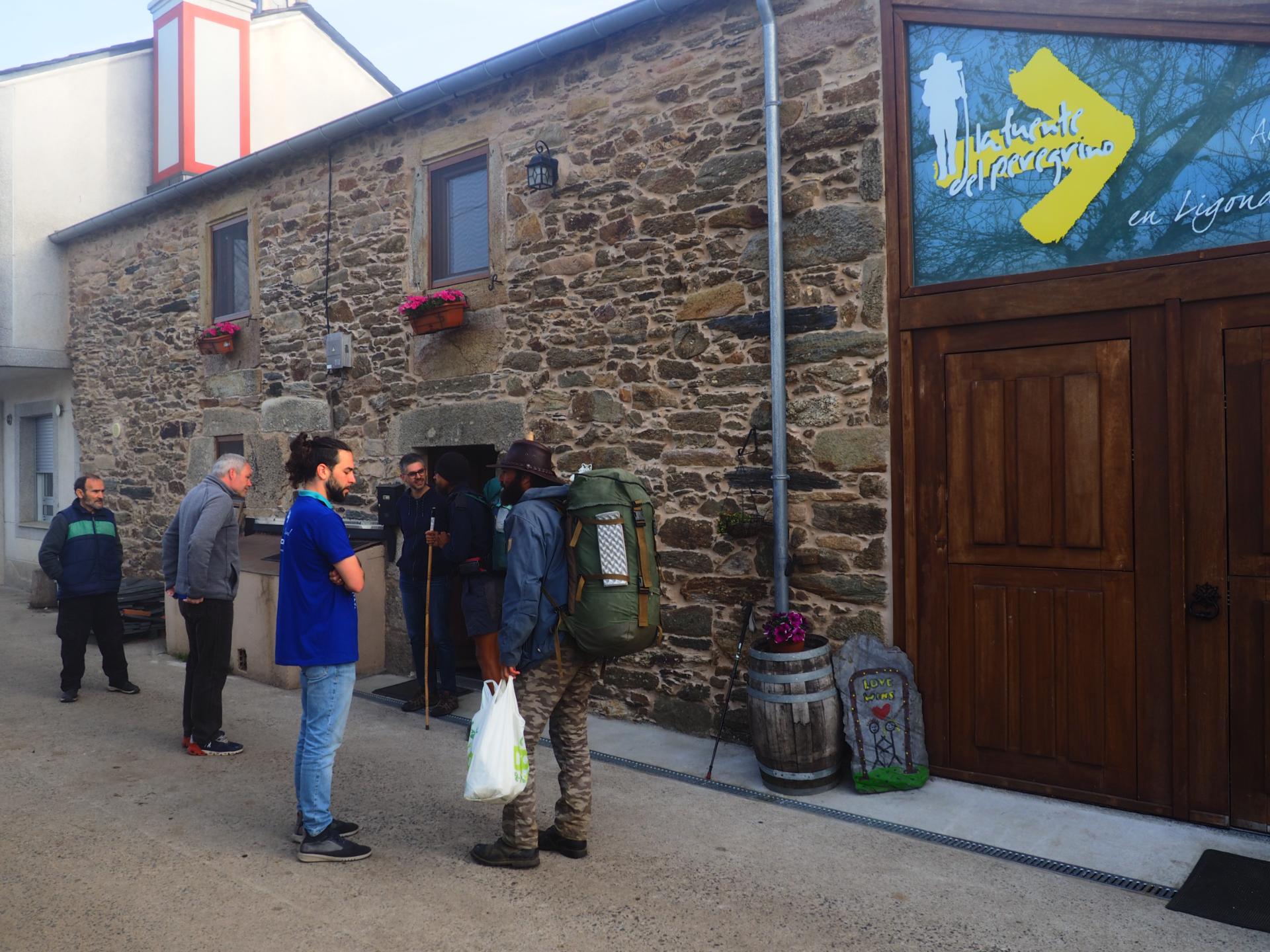 Je repère un point d’eau sur la carte, à Ligonde. Une fontaine, je pense. En entrant dans le village, on tombe sur la Fuente del Peregrino, « la fontaine du pèlerin », en pierre, façonnée par le temps, mais dont l’eau, elle, semble immortelle. En face, un groupe est attablé sur une terrasse et nous salue. Ils portent tous le même tee-shirt. On papote un peu : ce sont des volontaires venus passer une semaine dans le donativo d’à côté, qui porte le même nom que la fontaine. Une ancienne grange retapée à la fin des années 90 pour accueillir les pèlerins.