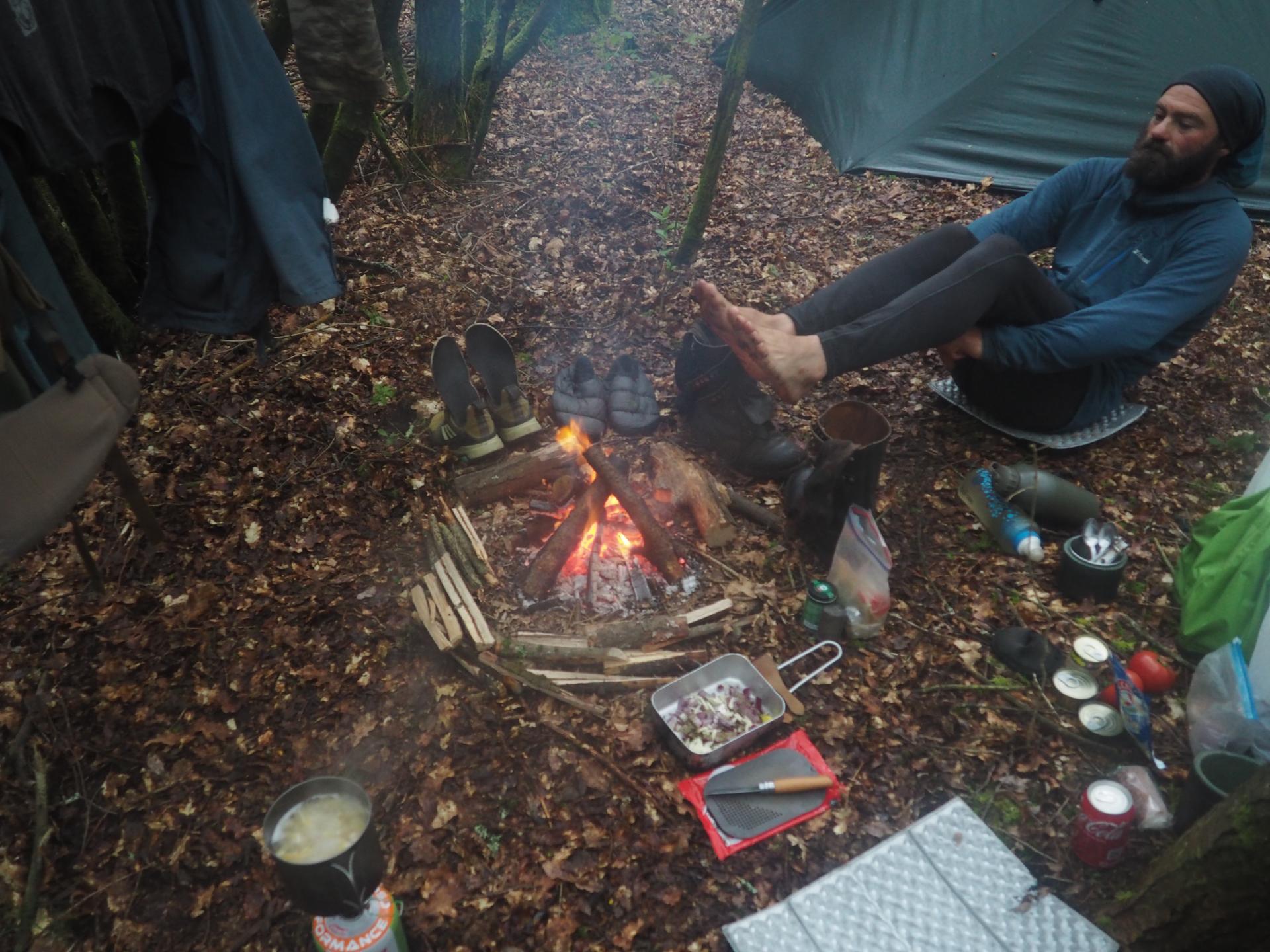 Je note quand même un drôle de paradoxe qui s’installe en nous : le luxe du bivouac nous rend exigeants. On est mieux sur notre camp cinq étoiles, finalement. Comment apprécier un dortoir bruyant quand tu dors paisiblement à la lisière d’une forêt ? Comment savourer de la junk food quand tu cuisines des bons plats au feu de bois ? Comment bien dormir sur un matelas moelleux et une pièce surchauffée quand tu t’es habitué au sol ferme et aux nuits fraîches ?