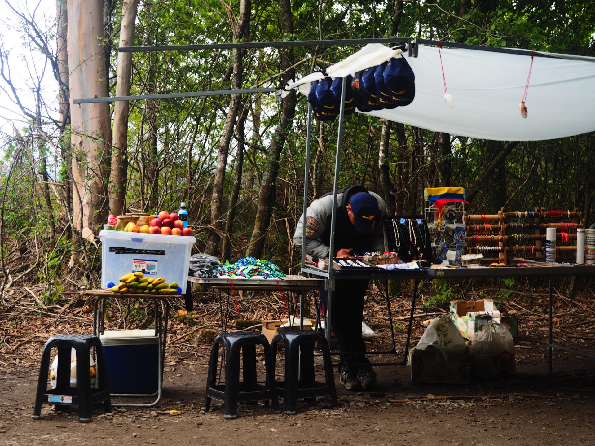On décide d’y faire honneur, sans se jeter sur tout ce qui bouge — même si l’envie ne manque pas. Un verre de rouge, quelques fruits, un bout de fromage, on reste sages. Il n’y a personne, les pèlerins défilent sans même voir ce petit paradis. On profite de la pause et du soleil pendant qu’un drapeau de la Jamaïque flotte au-dessus de nous. Le propriétaire serait-il jamaïcain ?