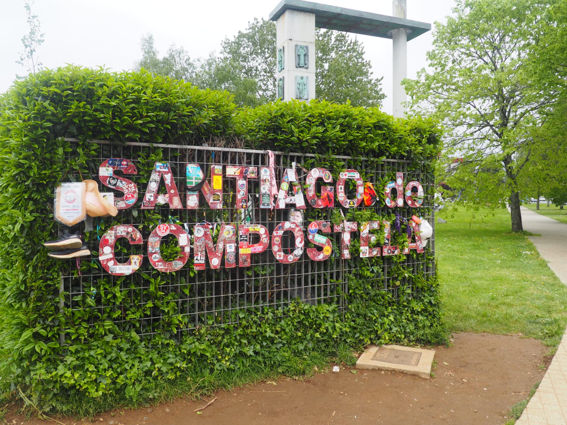 On longe l’aéroport un moment, puis on arrive devant un totem couvert d’offrandes. Une coquille de Saint-Jacques y est sculptée, “Santiago” gravé dessus. On y laisse un petit chapelet.