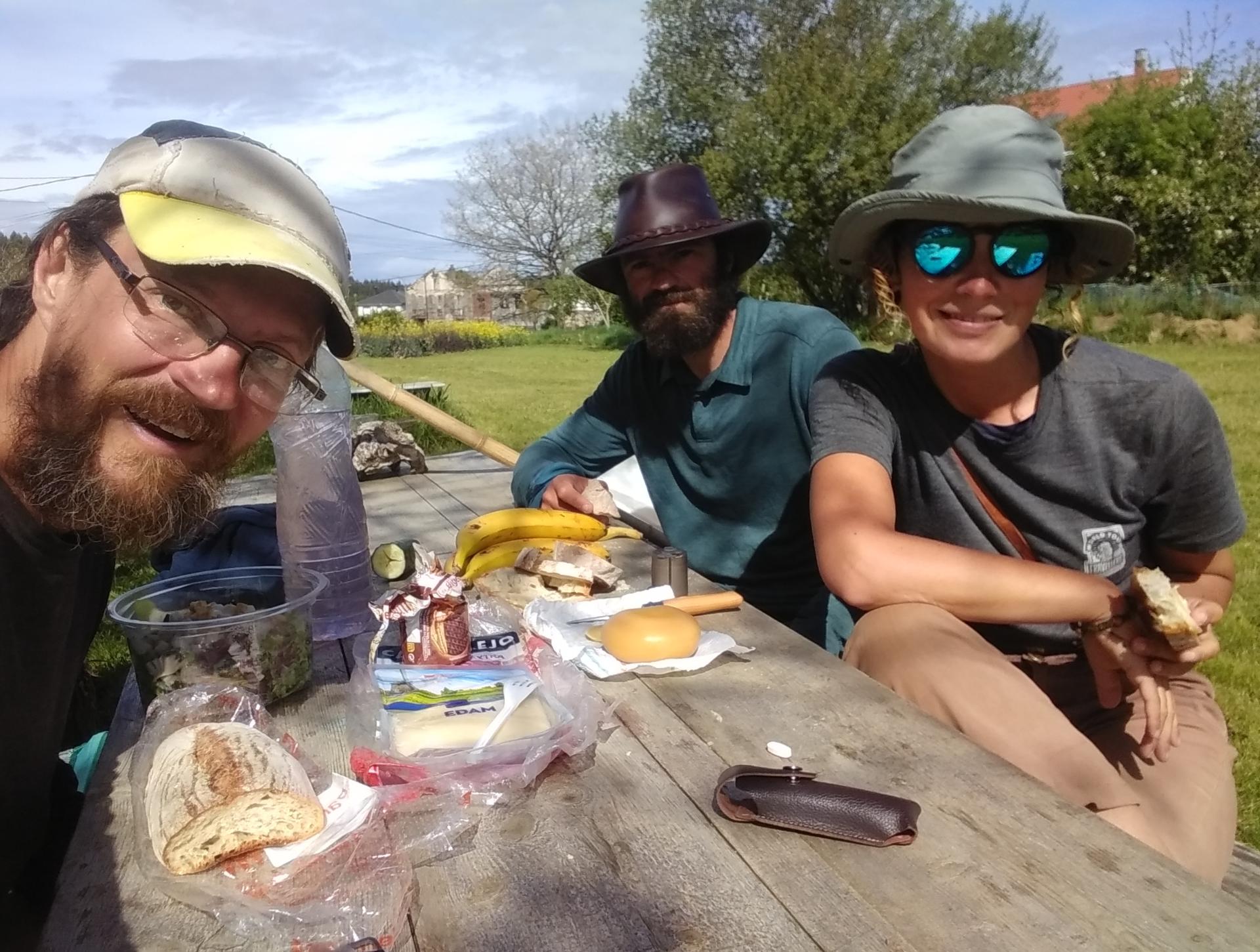 Au dîner, c’est poulet au curry, riz, salade, vin rouge, pomme au four et cookies en dessert. J’ai un peu honte, car Ada, elle, s’en tient au jeûne avec un bouillon que les volontaires lui ont gentiment préparé. On est une dizaine à table : les volontaires et deux pèlerins, Sven et Vicenzo. On rencontre aussi les gérants, deux couples sympathiques, un américain et un français. C’est eux qui ont transformé cette vieille grange en refuge chaleureux.