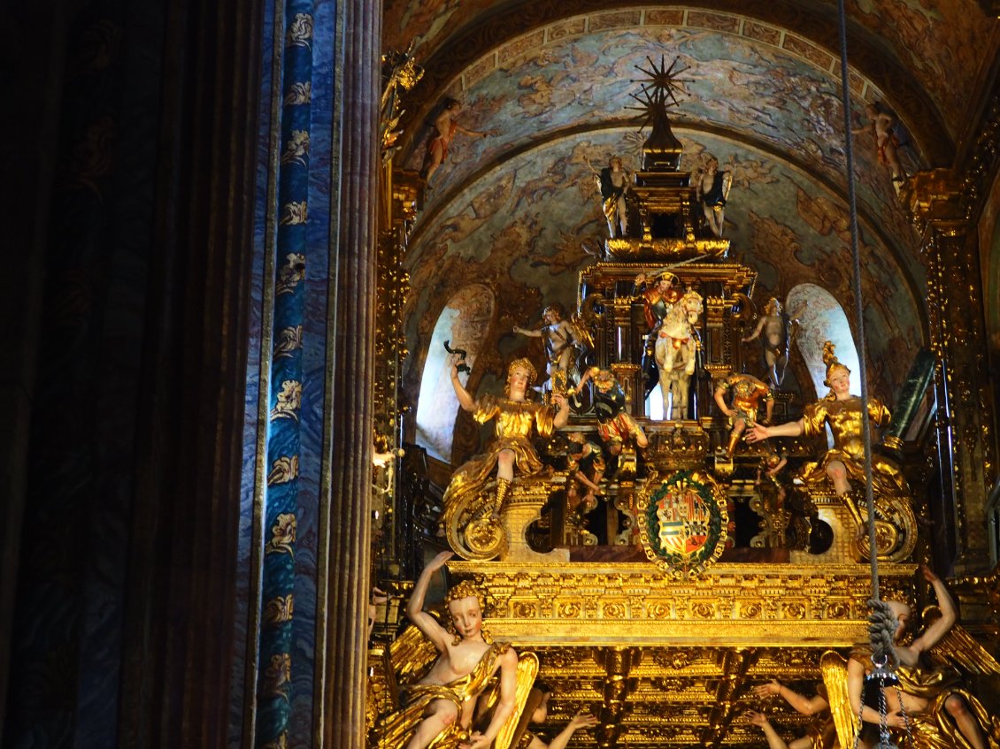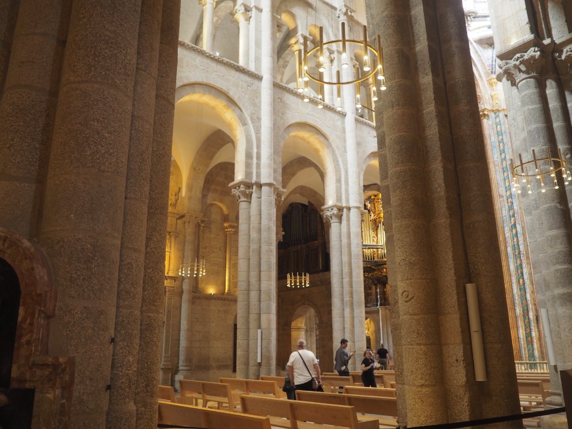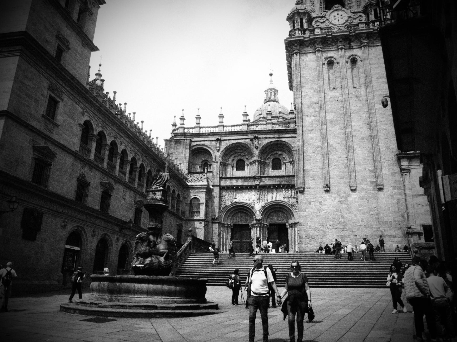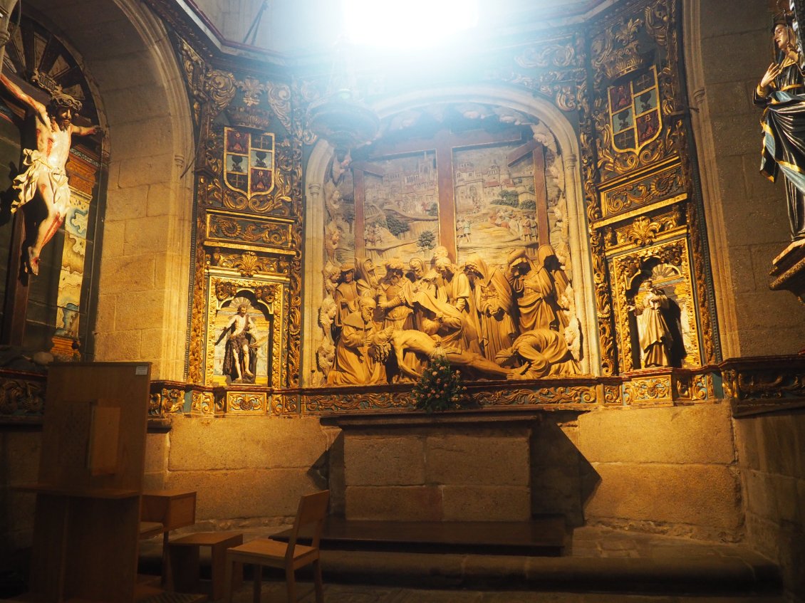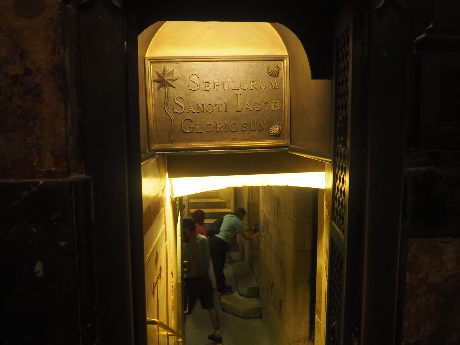On entre enfin dans l’immense cathédrale. Le décor est indescriptible. On s’assoit au fond, face à l’autel majestueux, et on se recueille un long moment. Les pèlerins défilent, se prosternent ; certains sont boiteux, d’autres s’effondrent en larmes. L’émotion est palpable. Calmement, on prend le temps de faire le tour. Ada prend quelques clichés, pas tous les jours qu’on voit une cathédrale comme celle-ci. Il y a de nombreuses pièces, de petites chapelles… et enfin, la sépulture, dans une crypte sous l’autel : le tombeau de l’apôtre Saint-Jacques le Majeur. L’histoire raconte que ses disciples auraient transporté ses reliques ici, en Galice. On se tient là, juste devant, et repensons à notre bénédiction à la cathédrale du Puy, le jour de notre départ le 15 janvier, puis à tout ce périple, cette sacrée aventure, qui prend symboliquement fin ici, face à Saint-Jacques.