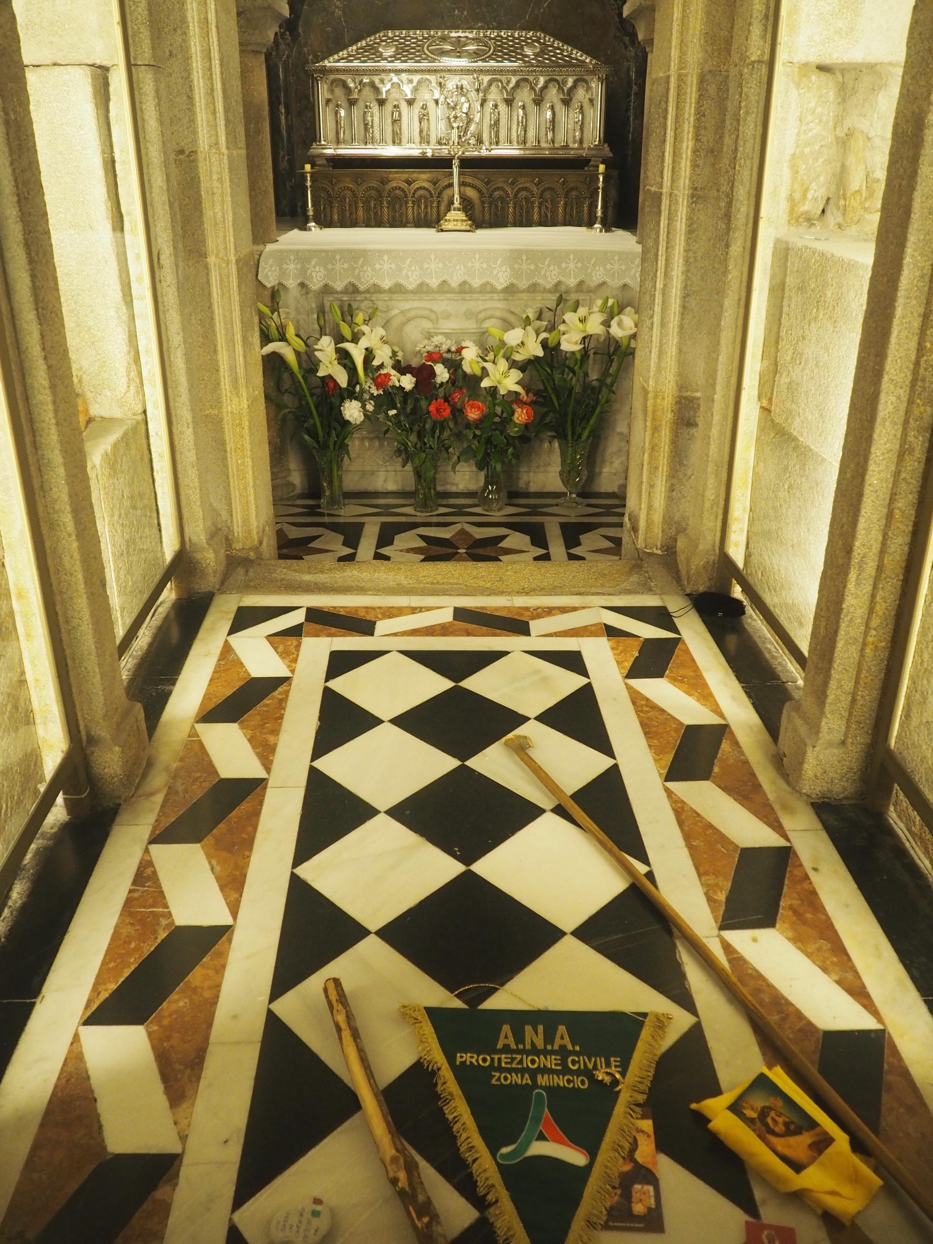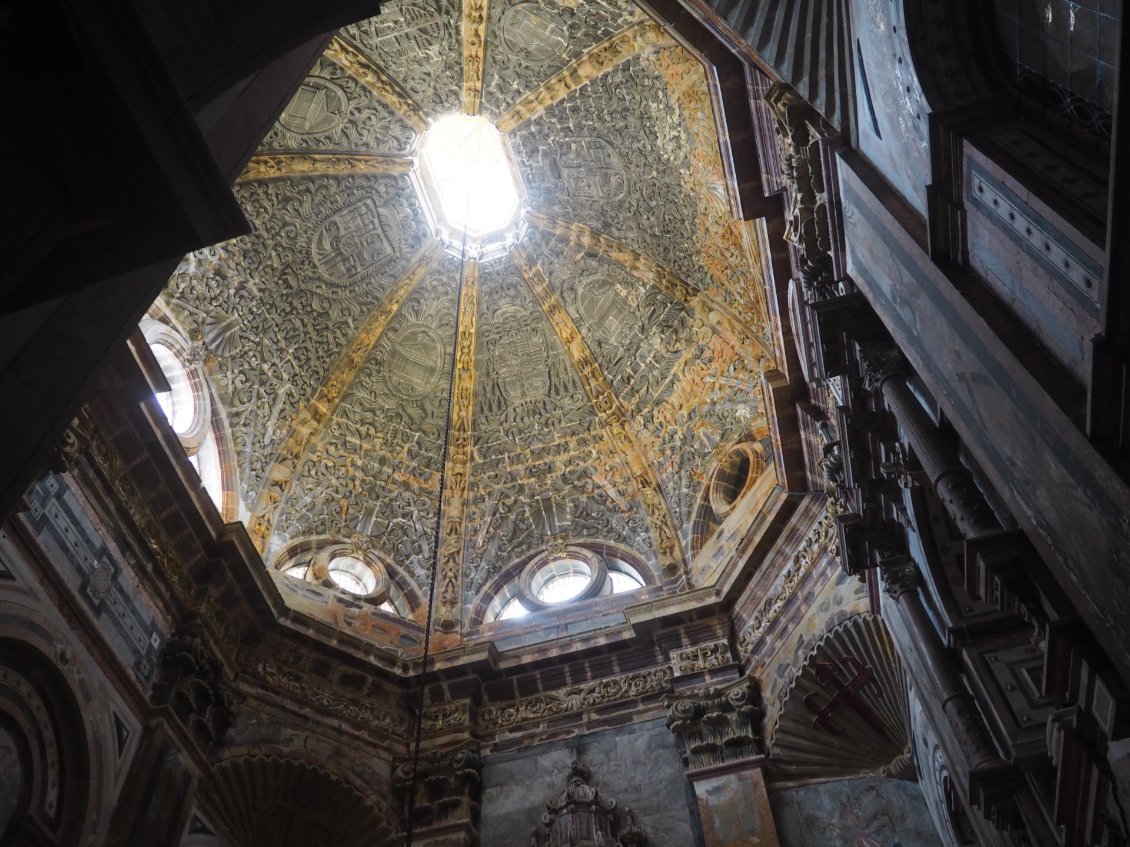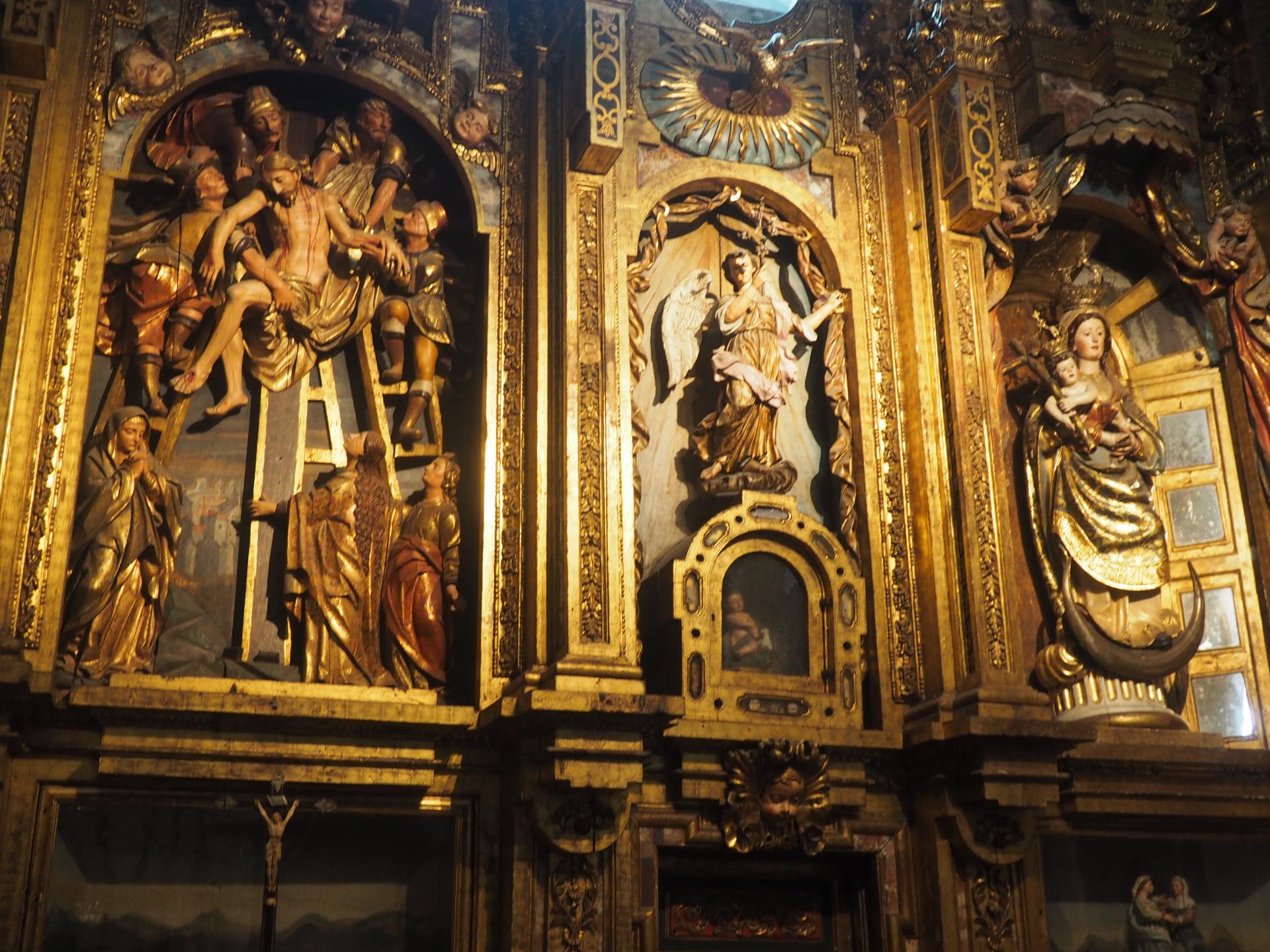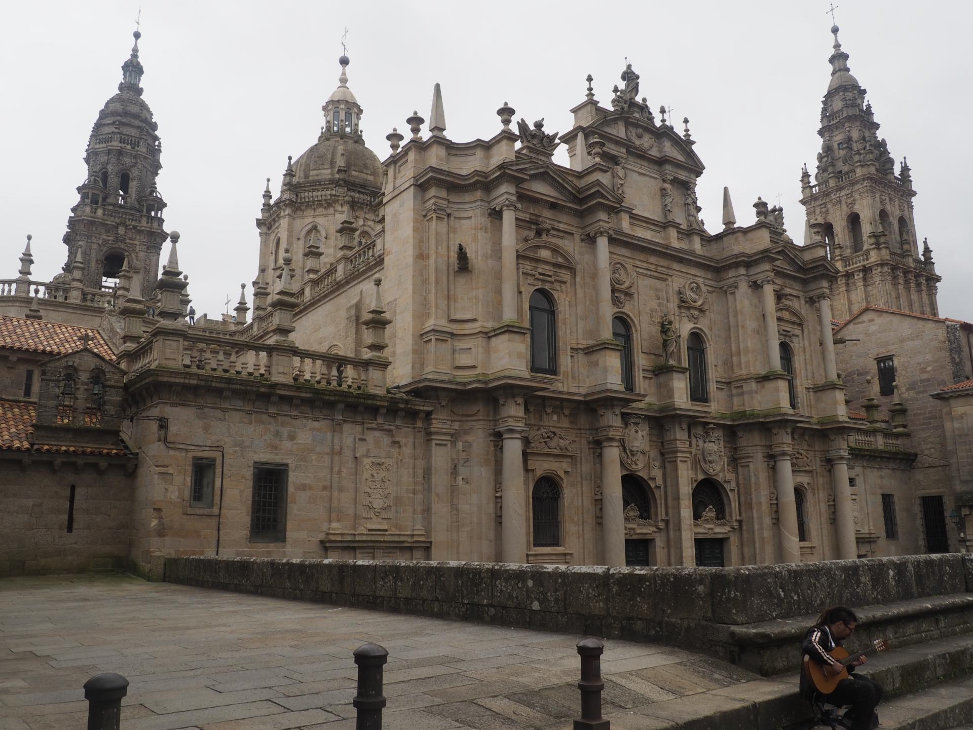 On entre enfin dans l’immense cathédrale. Le décor est indescriptible. On s’assoit au fond, face à l’autel majestueux, et on se recueille un long moment. Les pèlerins défilent, se prosternent ; certains sont boiteux, d’autres s’effondrent en larmes. L’émotion est palpable. Calmement, on prend le temps de faire le tour. Ada prend quelques clichés, pas tous les jours qu’on voit une cathédrale comme celle-ci. Il y a de nombreuses pièces, de petites chapelles… et enfin, la sépulture, dans une crypte sous l’autel : le tombeau de l’apôtre Saint-Jacques le Majeur. L’histoire raconte que ses disciples auraient transporté ses reliques ici, en Galice. On se tient là, juste devant, et repensons à notre bénédiction à la cathédrale du Puy, le jour de notre départ le 15 janvier, puis à tout ce périple, cette sacrée aventure, qui prend symboliquement fin ici, face à Saint-Jacques.
