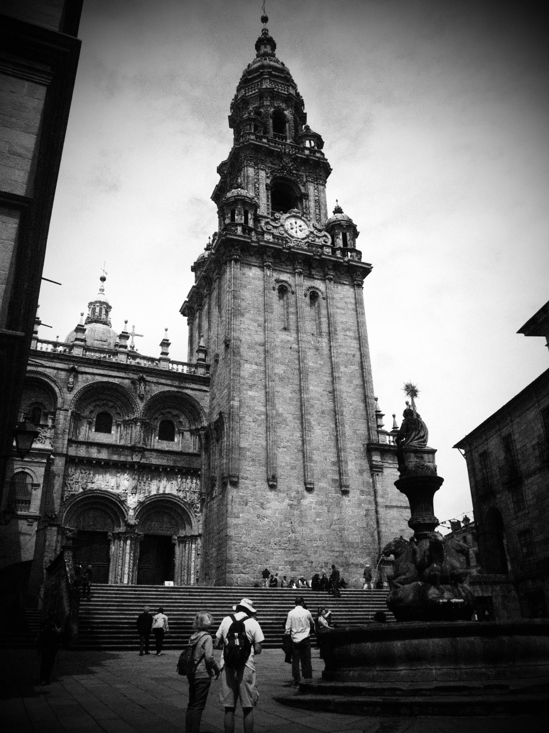 Nous voilà face à la cathédrale, assiégée de selfies. Certains pèlerins arrivent déjà le téléphone en main, incapables de profiter d’un instant de calme… le troisième œil, comme je l’appelle : tout se vit aujourd’hui à travers un écran, même les émotions les plus fortes.