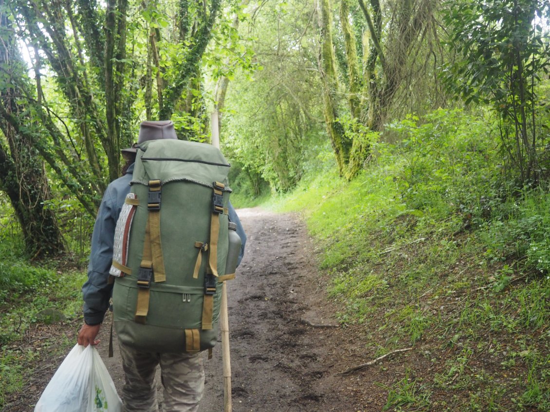 Nous voilà en route avec Sven, qui a chopé le chemin quatre mois auparavant à Barcelone. Il passait dans le coin et a pris le pas. En mode ultraminimaliste : tout est fait maison, rafistolé, optimisé, rien n’est laissé au hasard pour rendre la marche limpide et légère. Il jongle entre auberges et bivouac : un tarp et un duvet, basta. Il déplie, il dort, il marche. Une logistique bien pensée, rustique mais loin d’être bête.