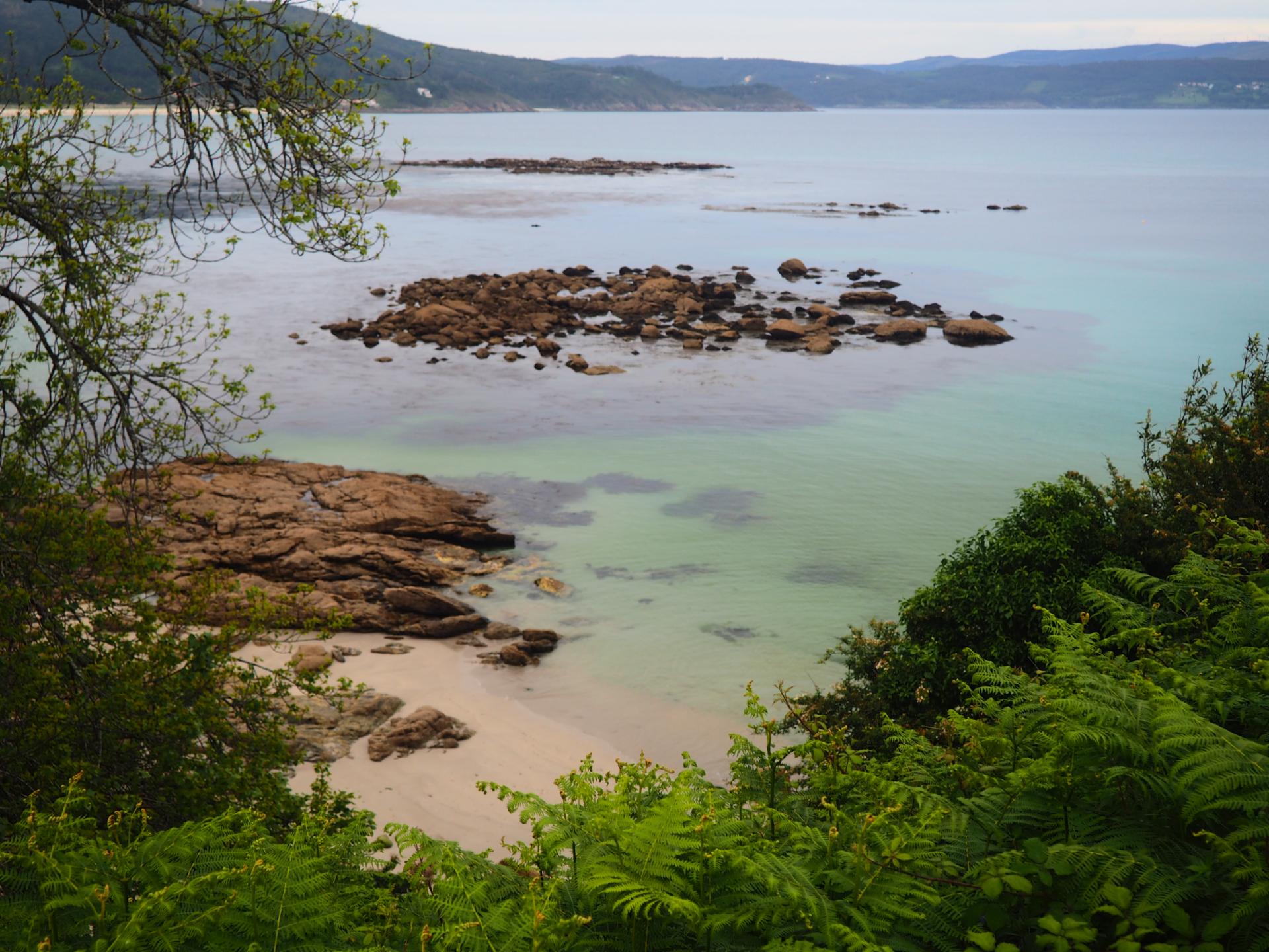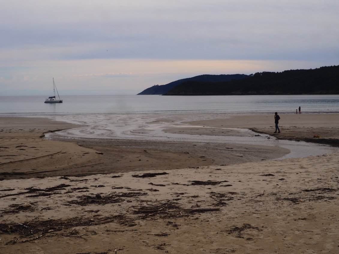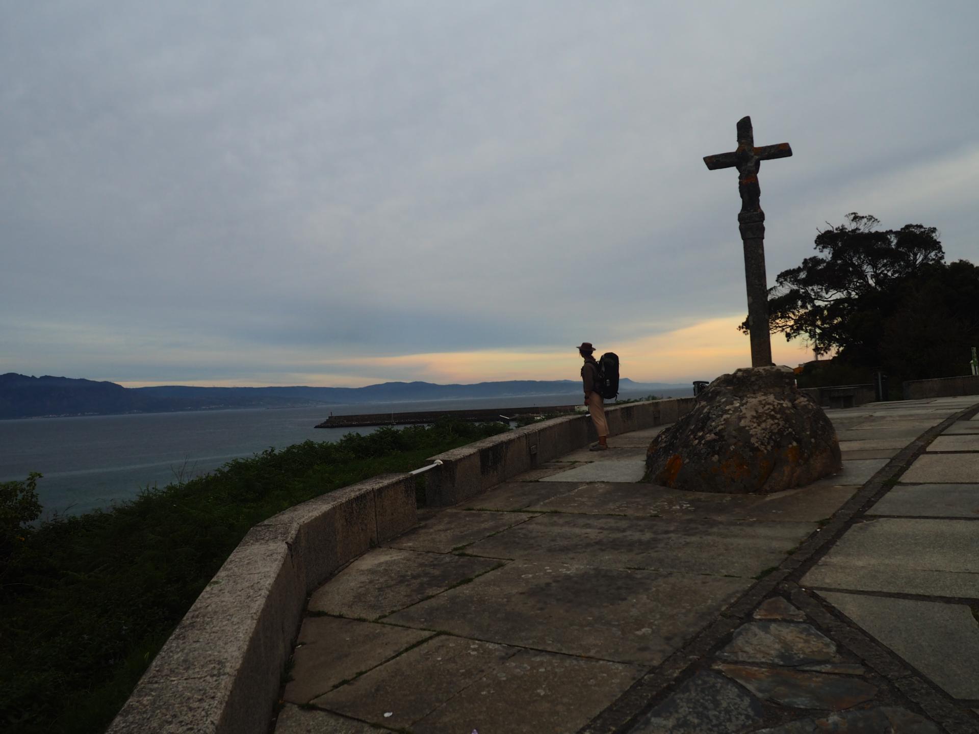 On débouche sur l’immense plage de Langosteira, baignée par un soleil couchant. C’est magnifique. La plage marque l’entrée de Fisterra, que l’on aperçoit désormais clairement.