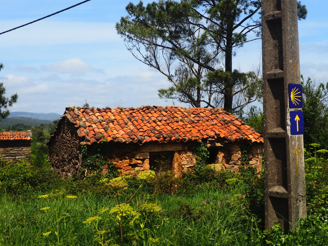 Nous voilà repartis pour environ 90 bornes, que l’on entame sous un soleil de plomb. On retrouve la balise du Camino à Carballal, à deux kilomètres de la ville. C’est calme : la grosse vague de pèlerins Sarria–Santiago s’est volatilisée, et ce n’est pas plus mal. J’aperçois aussi une balise de l’EuroVelo 3 et quelques cyclistes qui filent.