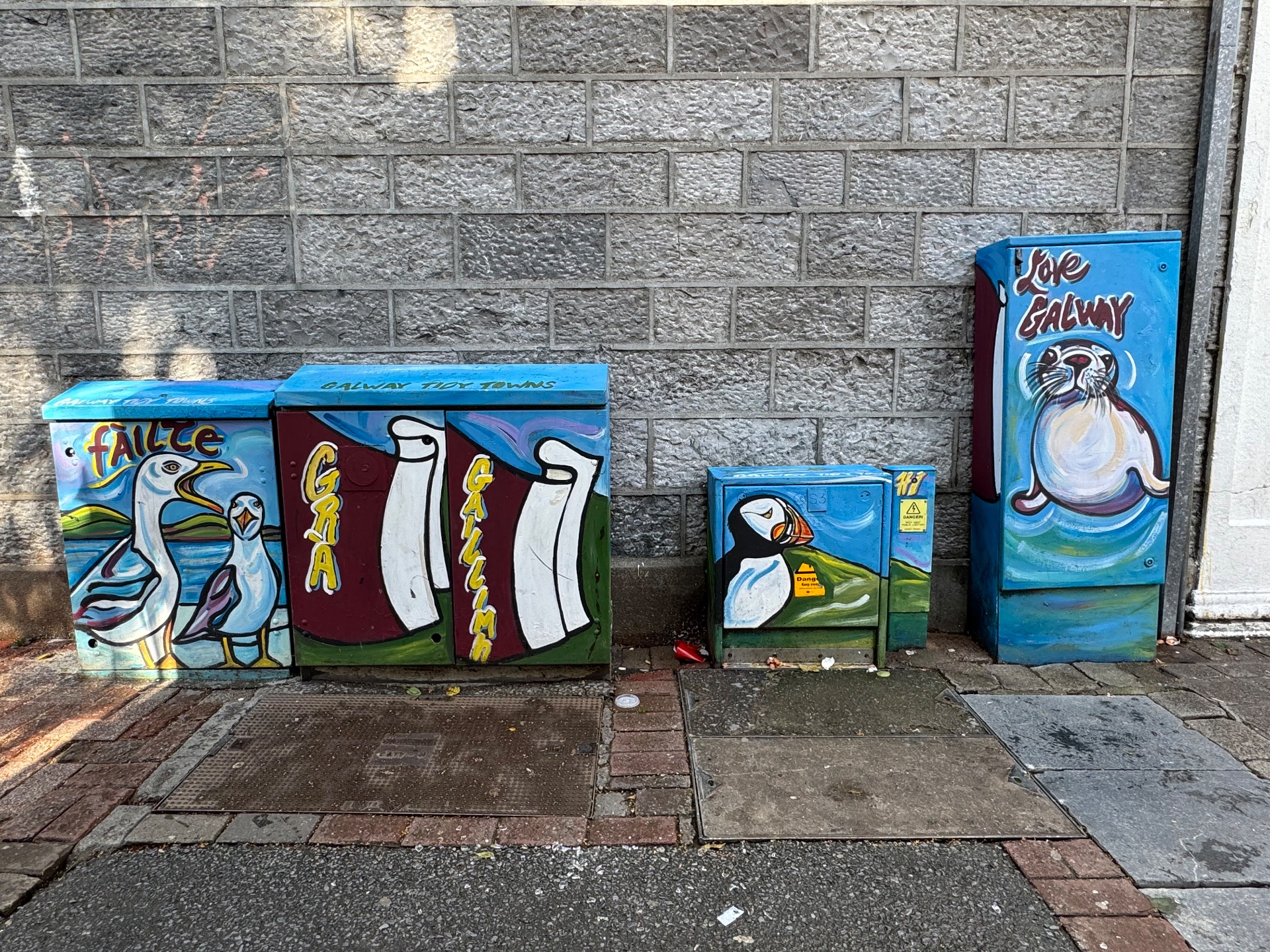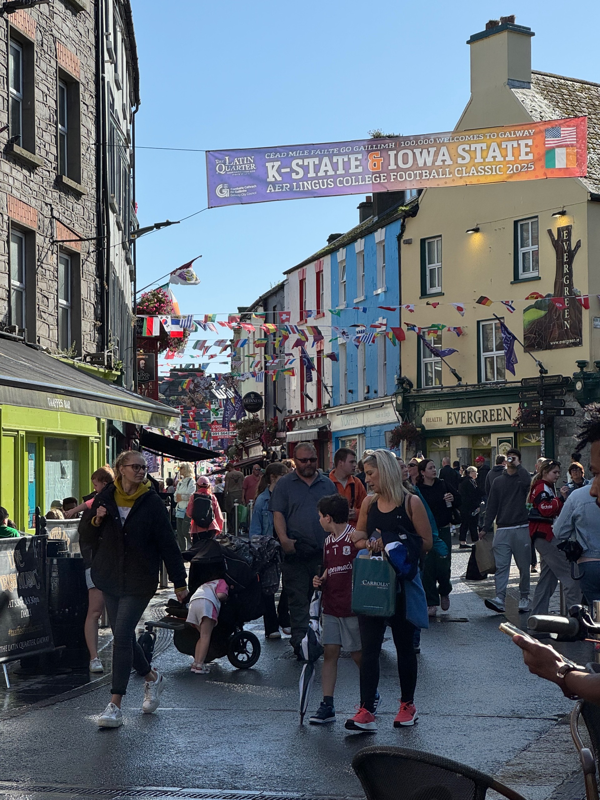 Le temps tourne à la pluie et nous nous arrêtons à l’abri d’un arbre pour déjeuner. Nous sommes face à une belle maison et la propriétaire qui rentre chez elle, nous demande si tout va bien. Hospitalité Irlandaise oblige. On repart en mettant les équipements de pluie. La pluie n’est pas très forte et arrivés à Glaway nous nous posons la question de l’abri pour la nuit. Il est délicat d’envisager de replier tout demain matin sous la pluie pour prendre le train. On se décide donc pour un hôtel mi auberge de jeunesse mi hôtel dont on va vérifier la disponibilité sur place. Après s’être installé on part à pied pour une visite de Galway. C’est une grande ville très cosmopolite. On entend pas mal d’espagnol, c’est peut être historique en raison des liens qu’avait Galway avec le commerce espagnol au XVIe siècle. Une porte porte le nom de Spanish Arch qui était un lieu spécifique pour le commerce. Etonnant on trouve des vestiges de la fortification dans un centre commercial. C’est justifié par justement le côté développement commercial de la ville à travers les siècles.